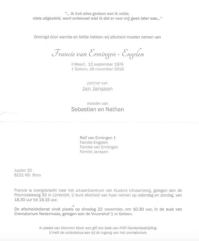 Verbijsterd dat Francie deze strijd niet heeft kunnen winnen. Zo’n enthousiaste lieve vrouw. Wat een verdriet voor haar jongens en voor haar moeder Toos die nog geen 2 maanden nadat haar man is overleden nu afscheid heeft moeten nemen van haar enigst kind. Zo oneerlijk. Ik wens Sebastiaan, Nathan, Toos, haar partner Jan en al die lieve vrienden en vriendinnen die haar enorm gesteund hebben, heel veel kracht toe om dit verlies te dragen.