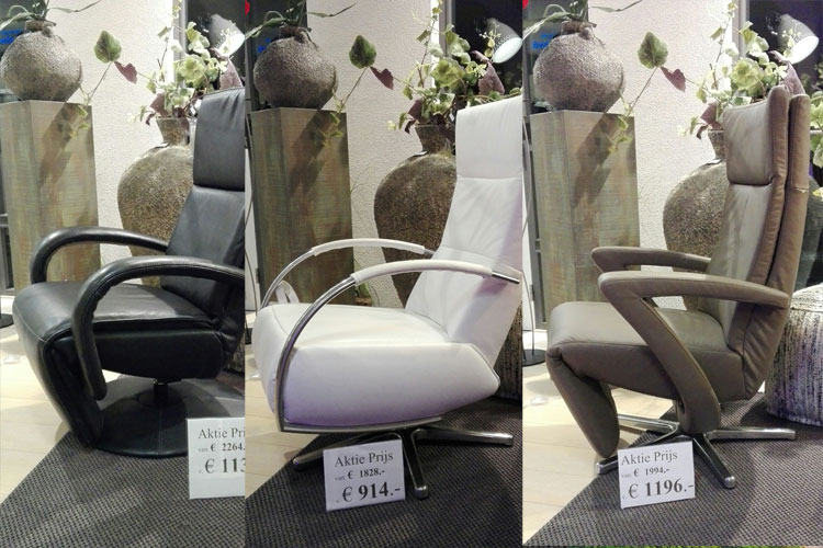 emcomeubelenSla nu je slag bij EMCO Meubelen voor jouw relaxfauteuil. Deze drie relaxfauteuils zijn in de aanbieding voor de helft van de prijs. Op diverse andere relaxfauteuils geldt een korting van 25% of 40%. De actie is alleen geldig op diverse relaxfauteuils in de showroom, Op=op of tot eind 2016.