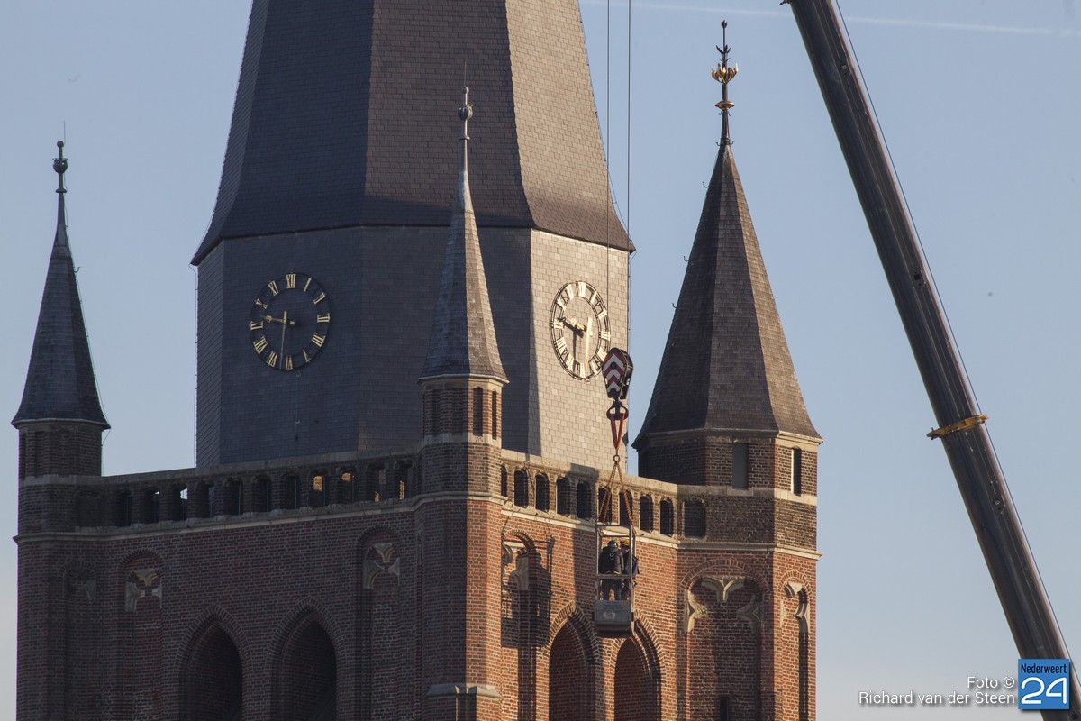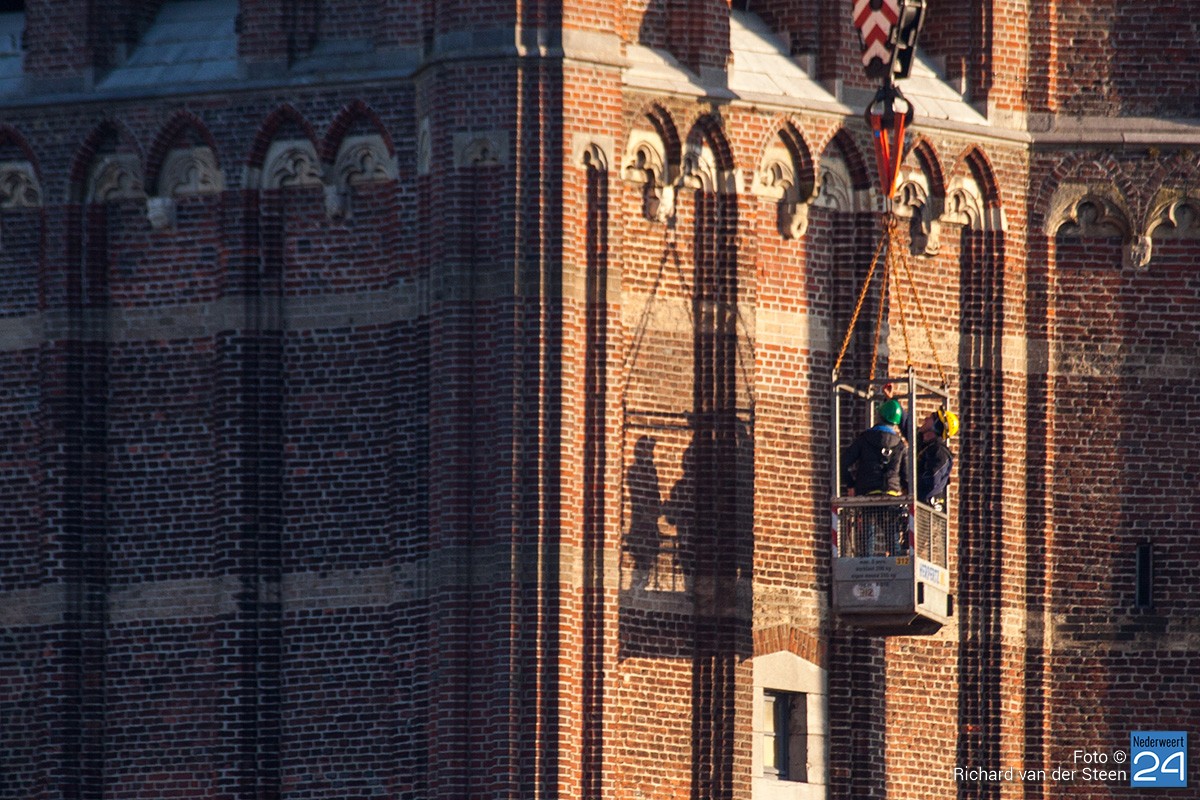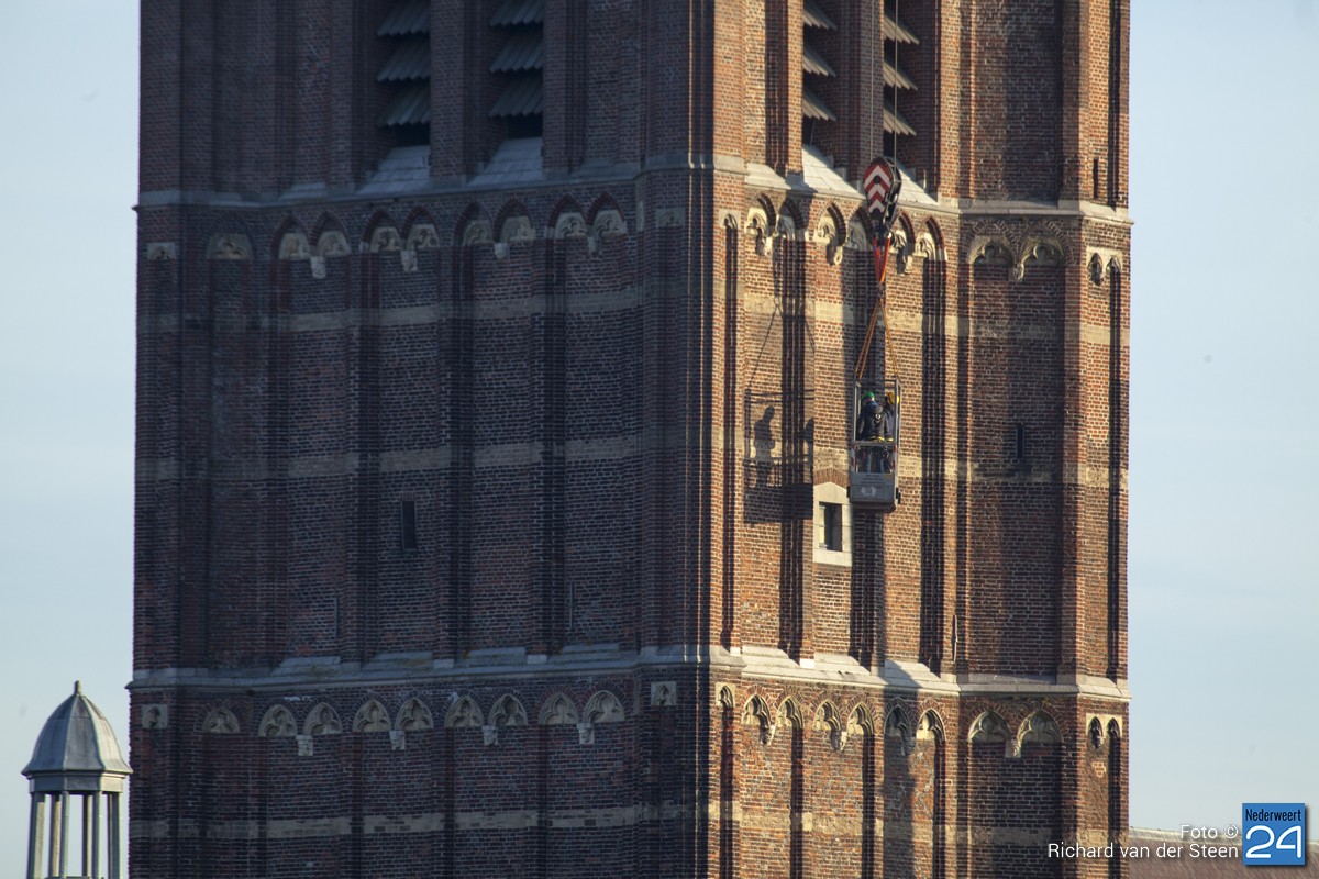 De toren van de St. Lambertuskerk in Nederweert wordt vandaag geïnspecteerd op loszittende stenen. De Kerkstraat is vanwege de veiligheid afgesloten vanaf het Lambertushof tot voorbij de kerk. Vanmorgen heeft een grote kraan zich opgesteld tussen de kerk en het pand van Bi-j Siem. Met een klein bakje wordt de toren vandaag meter voor meter bekeken en onderzocht. Alles wordt in beeld gebracht om daarna een advies te kunnen uitbrengen over de eventuele vervolgstappen.