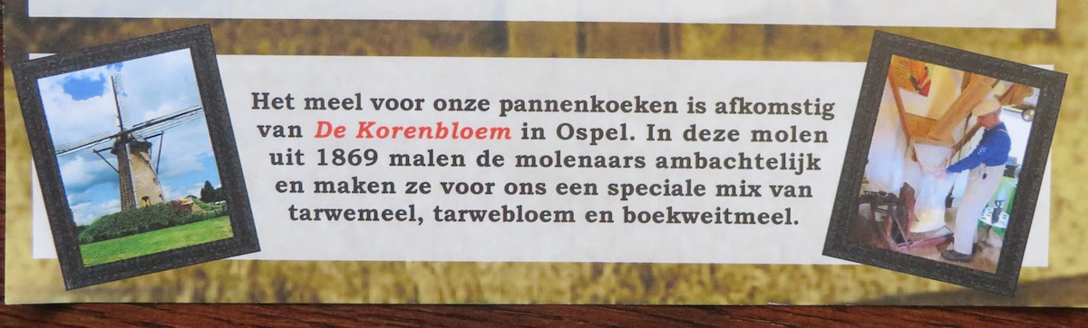 Het meel is gemalen op de molen op Ospel, gebuild en gemixt naar de verhoudingen die zijn aangegeven door eigenaar Coen van der Zanden. Nieuw is dat het mengsel naast tarwemeel en tarwebloem ook boekweitbloem bevat. De pannenkoek krijgt daardoor meer structuur aldus Coen. Dit meel laat zich beter bakken en de pannenkoek is lekkerder door de betere structuur. Daarnaast draagt dit bij aan de verdere promotie van streekproducten. Een volgende stap naar meer streekproducten, naast onder andere het Crole Limousinrund uit de Groote Peel, champignons en eieren, aldus Coen.