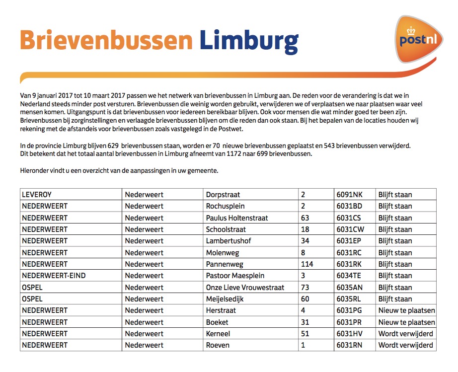 Voor de gemeente Nederweert betekend dit dat er 2 brievenbussen verdwijnen, 2 worden verplaatst en de rest (10 stuks) blijven staan waar ze staan. Vanaf 9 januari 2017 voeren we de eerste veranderingen in het netwerk van brievenbussen in Limburg door. In de gemeente Nederweert blijven 10 brievenbussen, verdwijnen 2 brievenbussen en 2 brievenbussen komen er nieuw bij. De aanpassingen zijn 10 maart 2017 gerealiseerd.