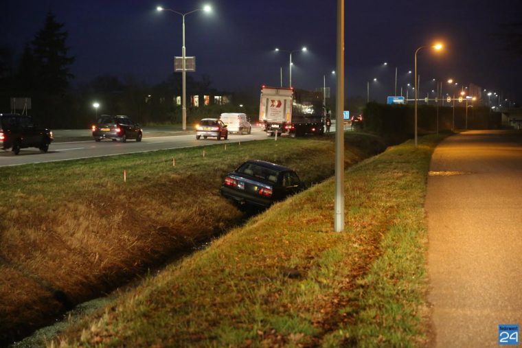De personen auto raakt tijdens de drukke avondspits langs de weg toen een vrachtwagen van de linkerbaan naar de rechterbaan kwam. Volgens de chauffeur zat de de personenauto in zijn zogenaamde dode hoek. “Ik heb hem niet gezien“, aldus de chauffeur. De bestuurder van de personenauto had geen andere keuze dan dan de berm in te rijden. Door de snelheid en gladheid schoot hij door de sloot in. Niemand raakte gewond.