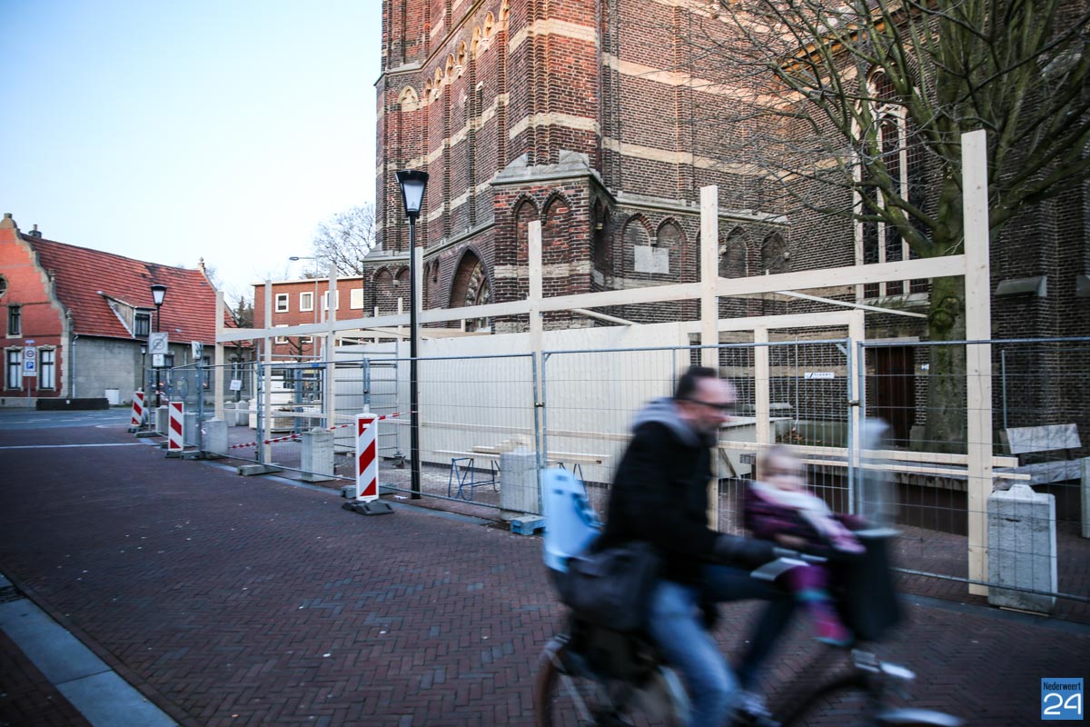 Voor de bescherming van voetgangers en overig verkeer wordt als eerste een constructie rond de toren gemaakt voor het opvangen van eventueel nog vallende brokstukjes. De bouwvakkers krijgen de nodige vragen tijdens de bouw van de constructie. Zo wilde een bezorgde bruid weten of ze wel kan trouwen in de kerk, komend voorjaar. “Natuurlijk kan dat. De verwachting is wel dat de constructie er dan nog staat. We zorgen echter voor een mooie aankleding van het geheel”, aldus burgemeester Evers.