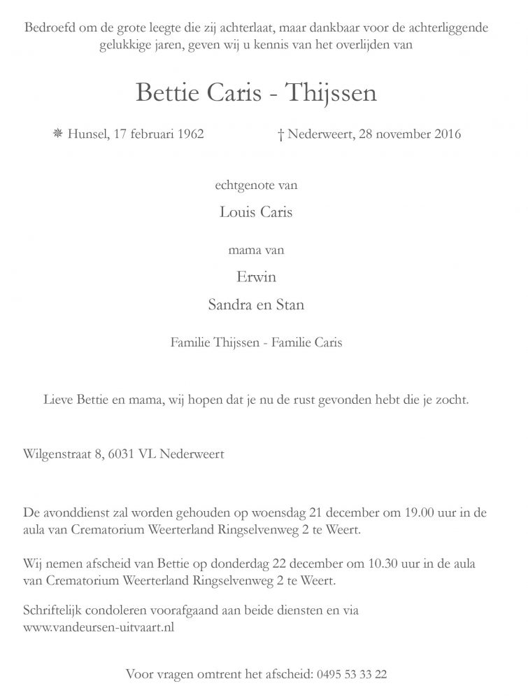 Overlijdensbericht: Bettie Caris – Thijssen