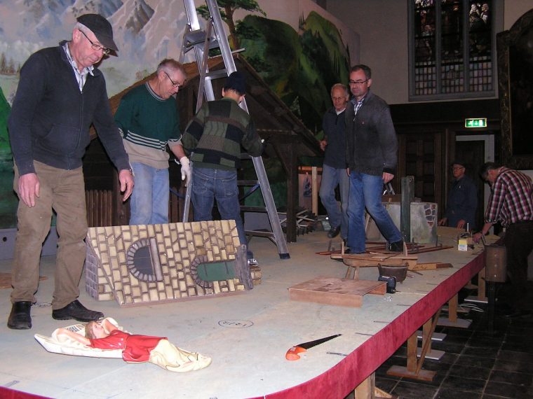 Zo is er een ploeg die de banken verwijderd waar de Kerststal moet komen te staan en gaan vervolgens verder met de bouw van het podium. Er is een ploeg die precies weet hoe het geheel elektrisch moet worden aangesloten, zodat de beelden ook met de Kerstdagen kunnen bewegen. Weer een andere groep sleept de kerstbomen aan en plaatsen die enz…