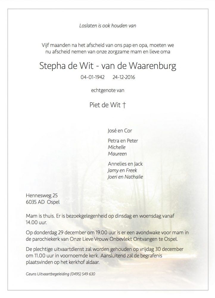 Overlijdensbericht: Stepha de Wit – van de Waarenburg
