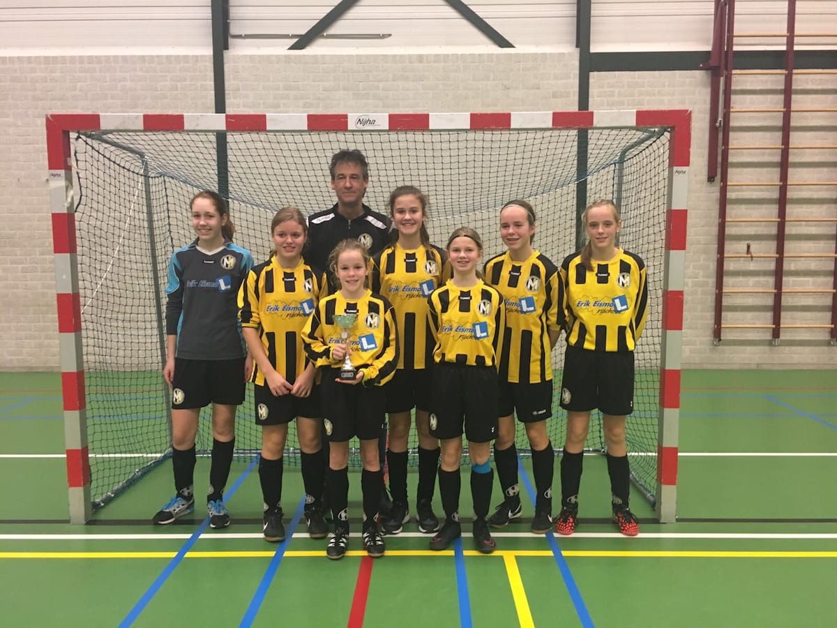 Na de poulewedstrijden wisten ze in de finale de meiden van de Eindse Boys in een spannende wedstrijd te verslaan met 2-0. Het winnende team (vlnr): Ankie, Tessa, Ewald, Rosa, Amber, Zilver, Linn en Maud.
