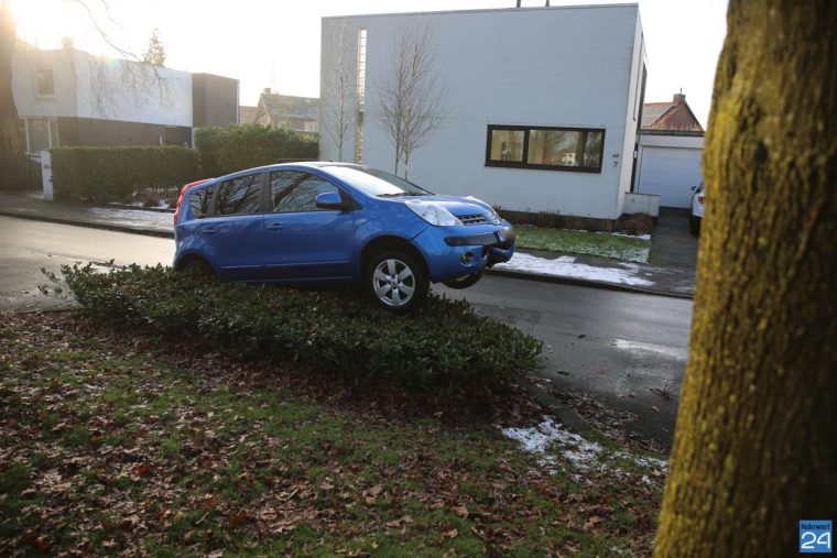 De bestuurder van de auto rijdt er al jaren, maar had even de versmalling over het hoofd gezien. Hij reed pontificaal over de versmalling en botste tegen het paaltje dat er midden op staat. Een stevig paaltje blijkt. De auto kwam schuin omhoog tot stilstand.