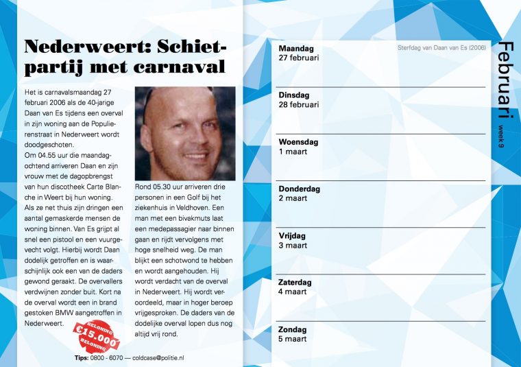 Het is carnavalsmaandag 27 februari 2006 wanneer de 40-jarige Daan van Es tijdens een overval in zijn woning aan de Populierenstraat in Nederweert wordt doodgeschoten.