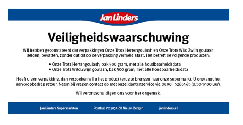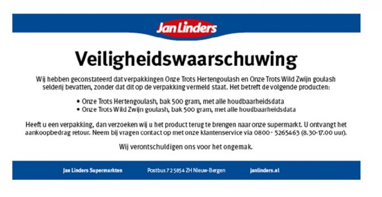 Jan Linders heeft een veiligheidswaarschuwing uitgeven voor twee soorten goulash die in de winkel zijn verkocht. In de producten zit selderij terwijl dit niet op het etiket staat. Ze raden consumenten met een selderij allergie aan de producten niet te eten.