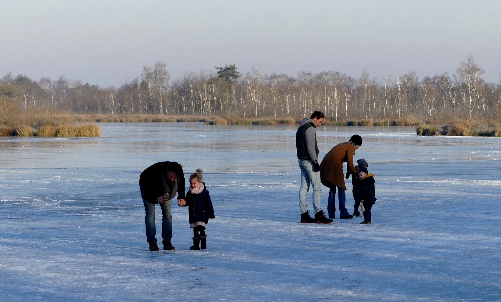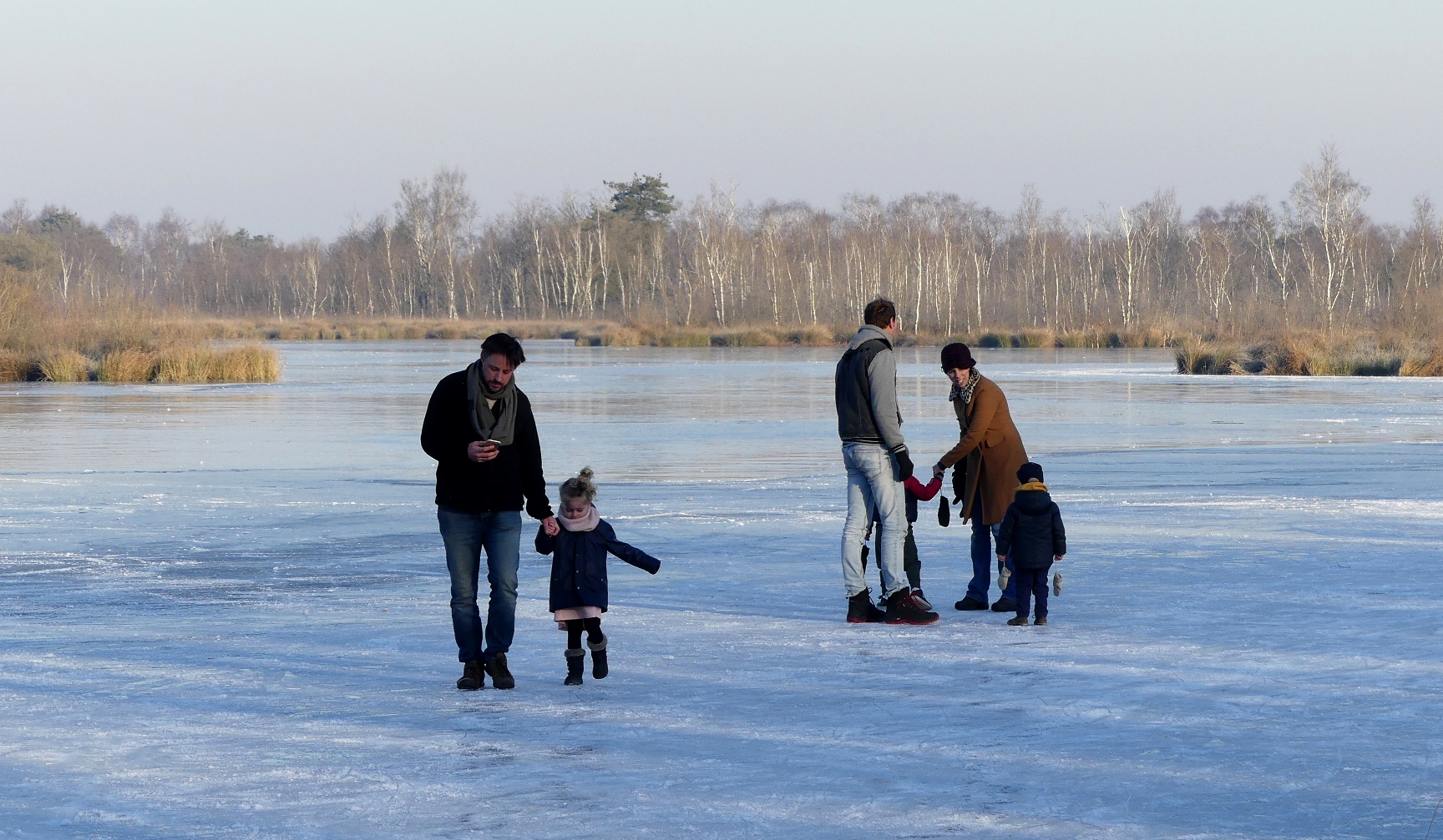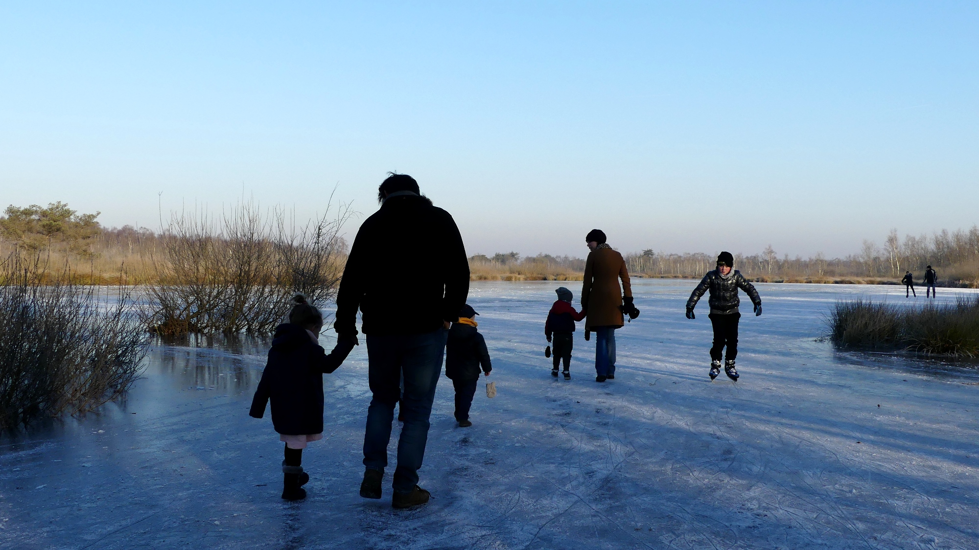 Vanmorgen was het nog niet zo druk. Die paar die aanwezig waren vonden het dan ook wel een beetje spannend om het ijs op te gaan. Het ijs kraakt af en toe maar dat hoort er natuurlijk bij. Ook veel wandelaars lopen even het ijs op met de kids. Een bijzondere beleving om op het Meerbaansblaak in De Grote Peel te lopen. Misschien wel het mooiste plekje van Nederweert om even  te schaatsen.