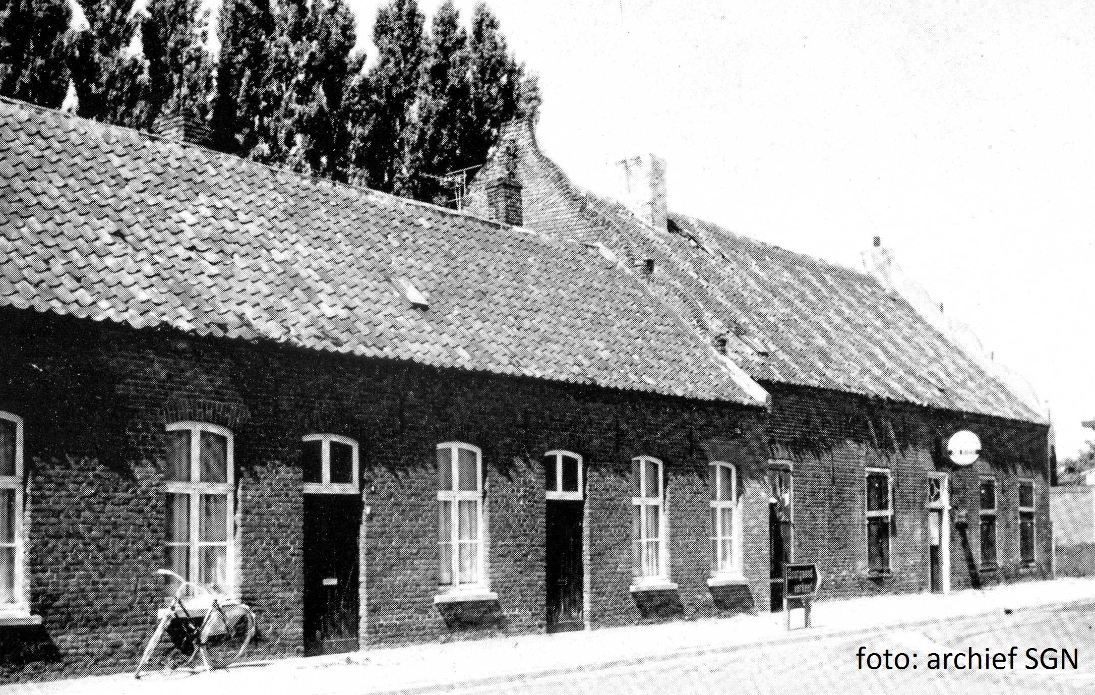 De St. Lambertustoren is natuurlijk een constante factor en dat geldt gelukkig ook voor pand Siem, dat fraai gerestaureerd werd en waar het ankerjaartal 1659 herinnert aan de eeuwenoude geschiedenis. Alleen boven de cafédeur is een zuinig stukje dakgoot aangebracht, daarnaast plensde het dakwater gewoon op de straat. Hier stond Siem Peters achter de tapkast en later de drie ‘gezusters Siem’ genaamd Toos, Truus en Margriet. Siem Peters was behalve cafébaas ook metselaar en dat is te zien. Zijn volgeladen vrachtwagen met cement, zand en een specieton staat klaar om te vertrekken.