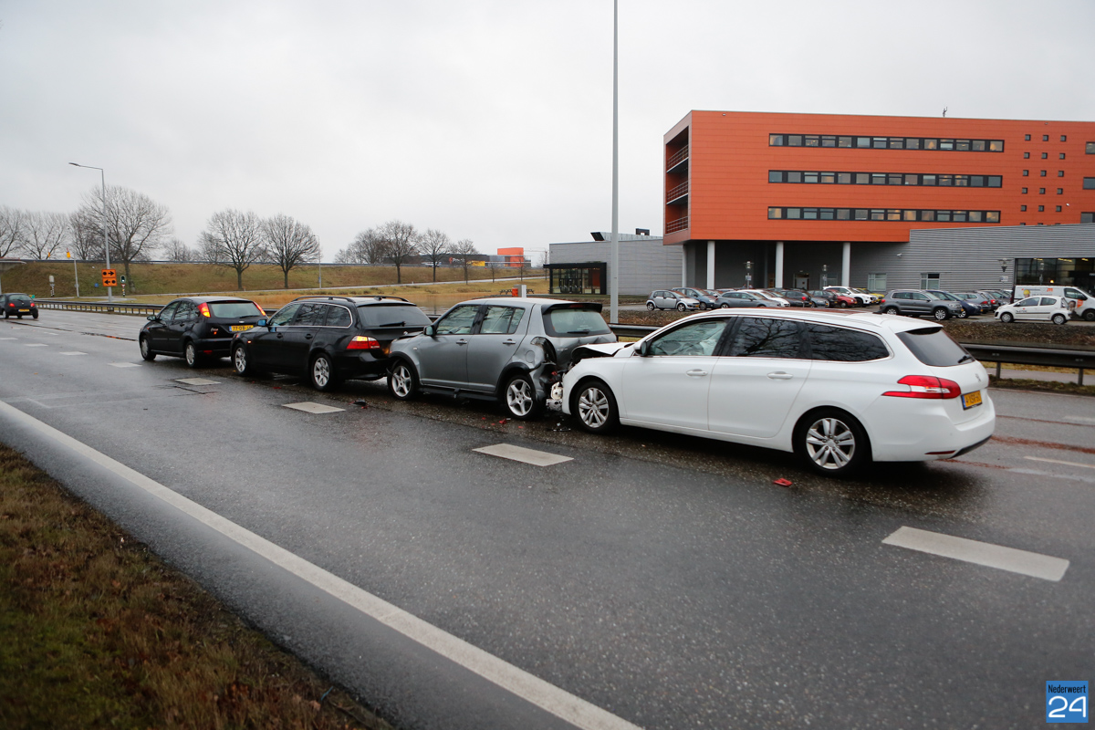 Bij de kettingbotsing raakte niemand gewond. Twee auto’s liepen flink wat schade op en zijn afgevoerd door de berger. De politie heeft de weg tijdelijk afgezet voor de bergingswerkzaamheden.