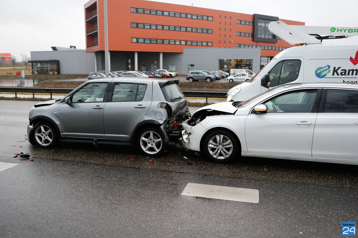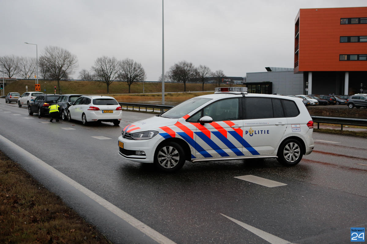 Maandagmorgen zijn vier auto’s met elkaar in botsing gekomen op de Ringbaan-Noord in Weert. De auto’s reden vanuit Weert richting Nederweert en zijn voor de verkeerslichten bij het viaduct in Nederweert met elkaar in botsing gekomen.