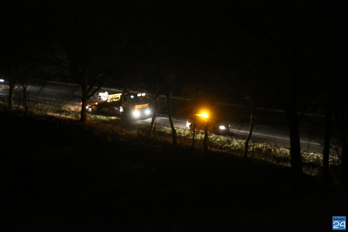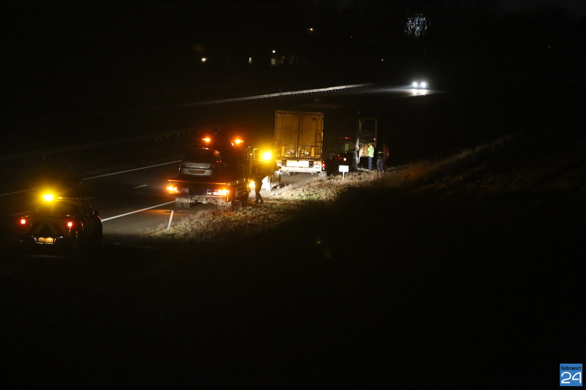 De vrachtwagen stond een paar honderd meter verderop stil nadat hij merkte dat er achter hem iets mis ging. De bestuurder kwam met de schrik vrij en is door de berger, samen met de auto, naar veilige have gebracht. Het was laat op de avond en dus was het rustig op de weg. Het verkeer heeft hierdoor weinig hinder ondervonden.