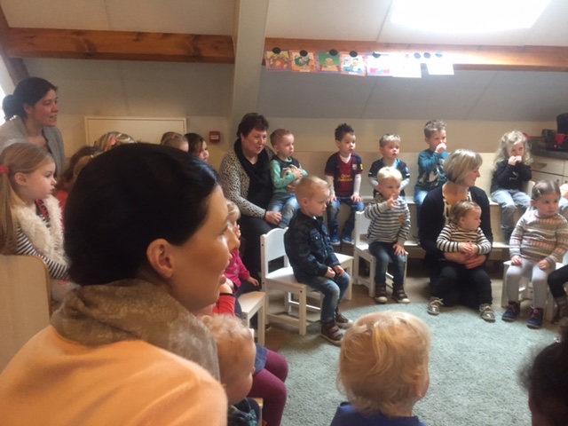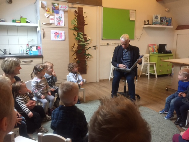 De kinderen vonden het best spannend allemaal, ze luisterden met open mond en reageerden enthousiast op het verhaal. Sommige kwamen zelfs van hun stoeltje af om iets aan te wijzen op de mooie prenten in het boek.