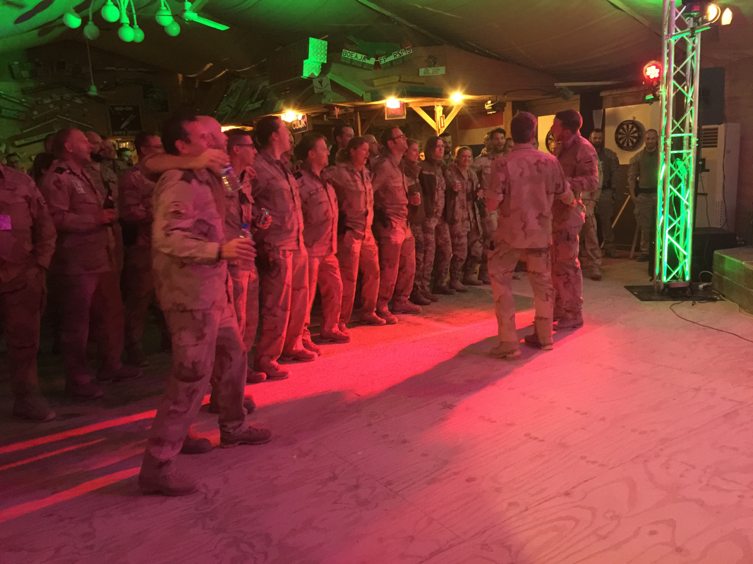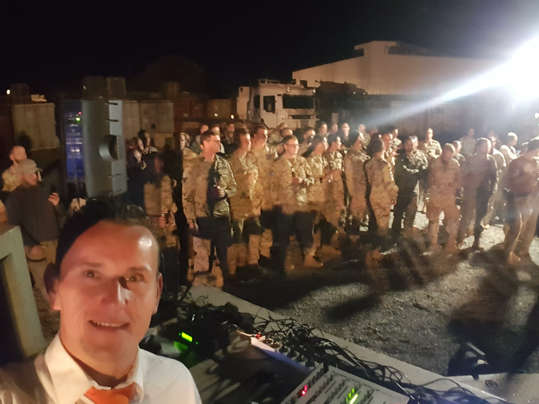 De primitief aanwezige apparatuur werd uit de container gehaald en de toevallig aanwezige oplegger werd als podium ingezet, diezelfde middag kwam het nieuws dat de 140 Duitse militairen helaas niet naar huis toe konden vanwege een gecancelde vlucht, voor mij geluk bij een ongeluk omdat hierdoor het publiek qua aantal werd verdubbeld. In de avond werd begonnen met het optreden, ik kwam op het idee om de Duitsers tegen de Nederlanders te laten strijden op passende muziek, dit viel goed in de smaak want de aanwezige militairen gingen compleet los op de opzwepende muziek wederom zonder één druppel alcohol. Na een fantastische avond te hebben gehad was het tijd om de apparatuur weer terug op te bergen in de hiervoor bestemde container.