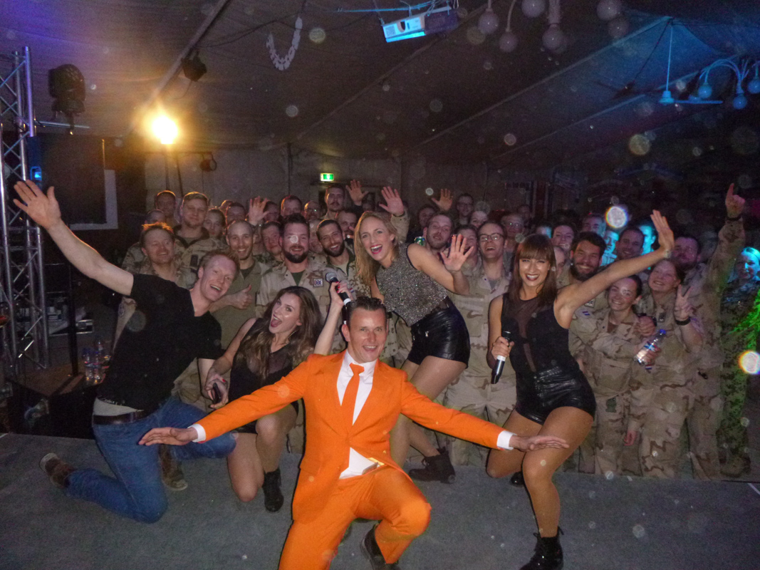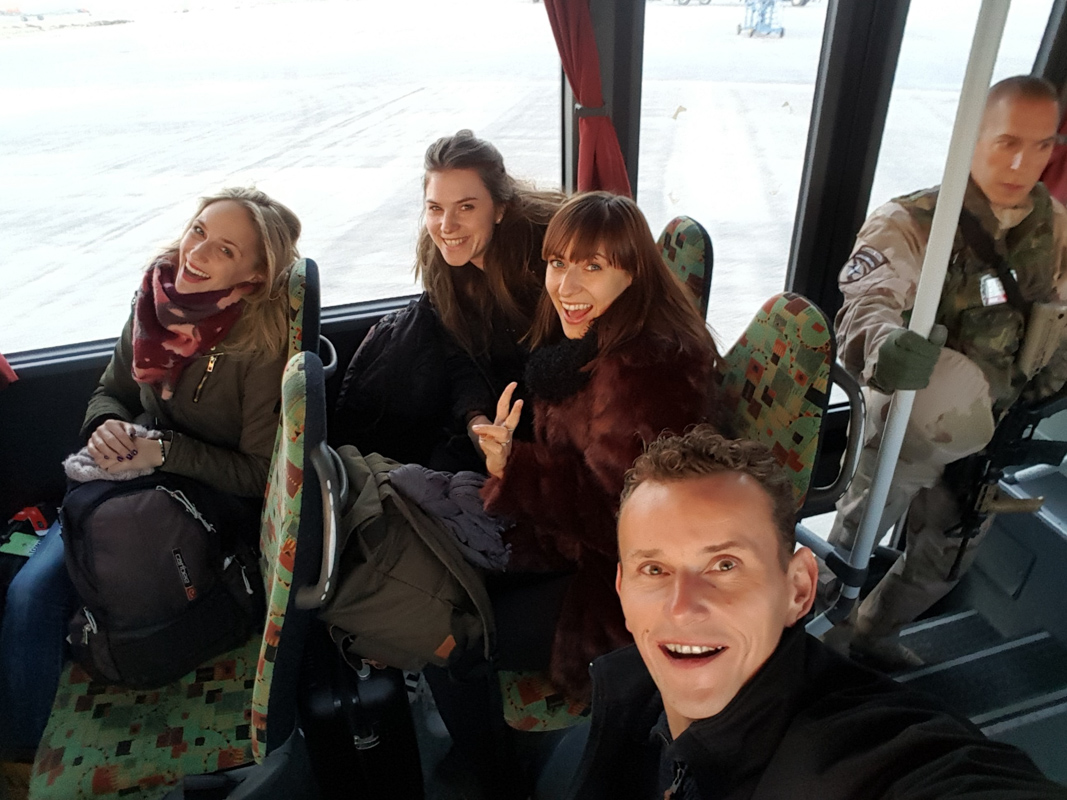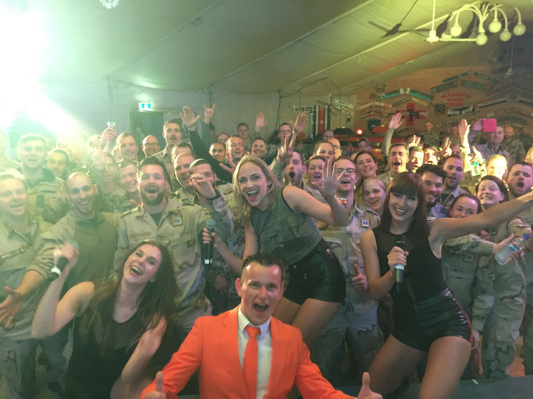 19 januari ging ik met de trein naar Schiphol om vervolgens met een lijnvlucht naar Afghanistan af te reizen, samen met een technische man, 3 zangeressen/danseressen en 2 begeleiders van defensie kon de reis beginnen. Aangekomen in Afghanistan werden we door de logistieke dienst van de VN verder vervoerd naar het kamp om vervolgens de scherfvesten en helmen te passen, Het podium en de apparatuur was al een aantal weken eerder ingevlogen waardoor er direct aan de slag kon worden gegaan met de opbouw. Nadat het allemaal gereed stond werd er een rondleiding georganiseerd waarbij we de sfeer op het kamp konden proeven, ruiken en zien. De voorpret zat er al goed in bij de Nederlands en Duits gelegerde militairen dus de spanning steeg met de minuut voor het optreden, tijdens de uitzending was het voor iedereen verboden om alcohol te nuttigen, iets waar ik behoorlijk tegenop zag want mijn show bevat elementen welke met alcohol beter zijn te bevatten.
