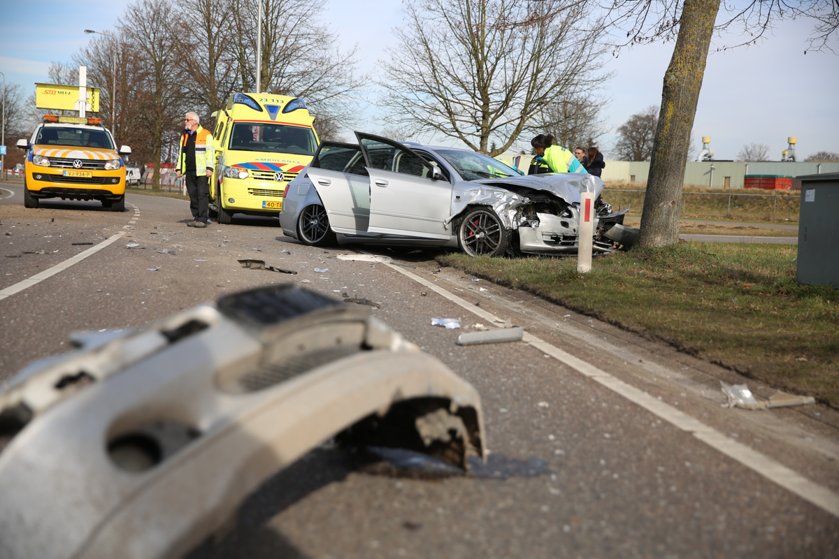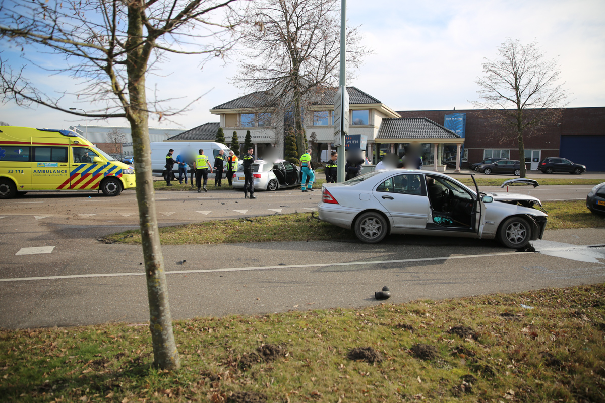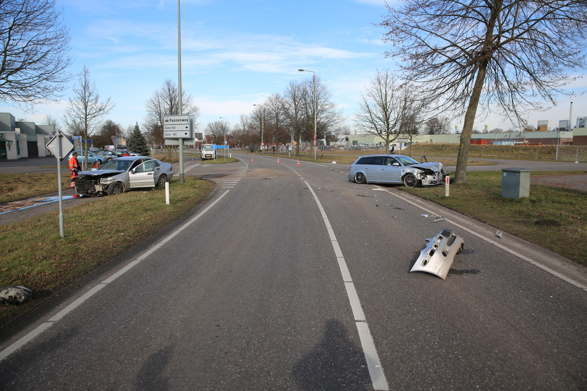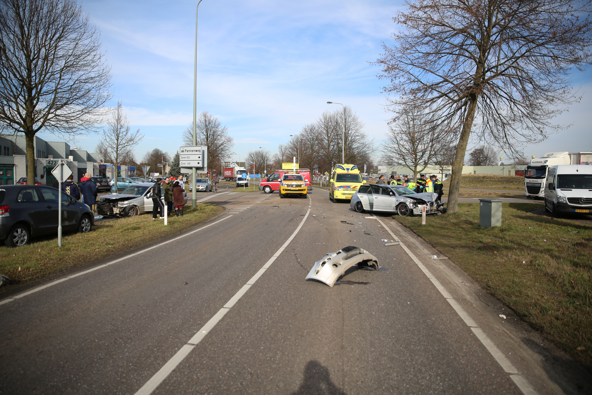 De twee auto’s botsten door nog onbekende oorzaak op elkaar op de voorrangskruising met de Mangaanstraat op industrieterrein Pannenweg. Beide bestuurders en een inzittende zijn met de ambulance naar het ziekenhuis gebracht. De politie onderzoekt de toedracht van het ongeval.