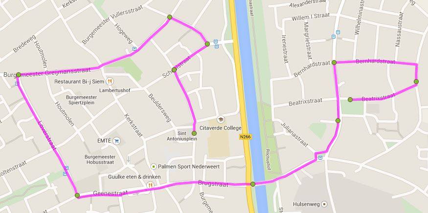 St. Rochusplein, Budschop, Bernhardstraat, Ospelseweg, St. Rochusstraat, Brugstraat, Geenestraat, Loverstraat, Burg. Greijmansstraat, Kapalaniestraat, Moesemanstraat, Schoolstraat, St Willibrordusstraat, St Antoniusplein waar de ontbinding zal plaatsvinden.