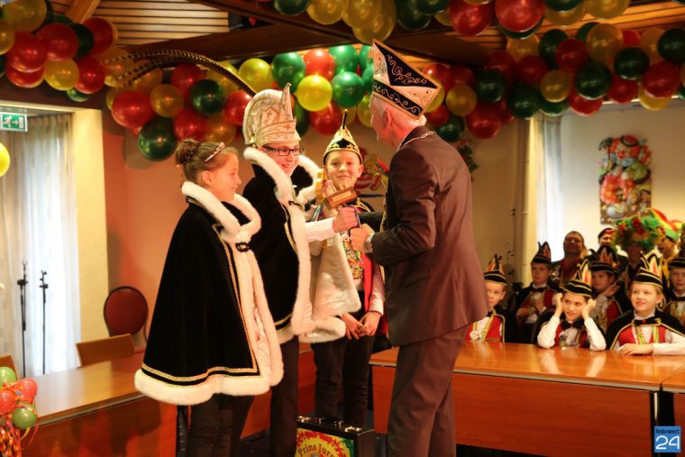 Daarna was het tijd voor de officiële overdracht. Jeugdprins Dajo van J.K.V. De Krielkes kreeg de sleutel van het verwarmingshok, Jeugdprins Sjors van V.V. De Vlikkestaekers de sleutel van de het fietsenhok en Jeugdprins Jurn I van V.V. De Pinmaekers de sleutel van het “achterpörtje”. Hiermee heeft de jeugd de macht in handen. In iedergeval tot vanavond een uur of negen, want dan krijgt de Prins Ron I van de V.V. Pinmaekers de sleutel van de voordeur. Locoburgemeester Henk heeft drie dagen verlof.