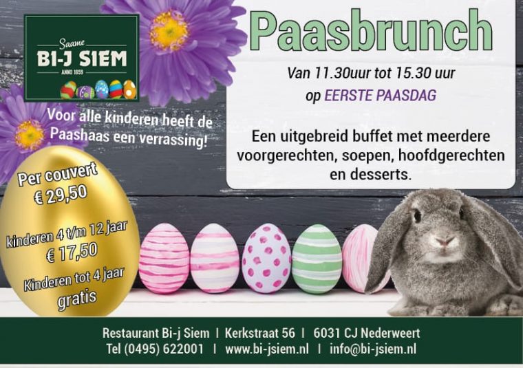 Dit jaar verzorgt restaurant Bi-j Siem op eerste paasdag een uitgebreide Paasbrunch voor het hele gezin. Tussen 11.30 uur en 12.00 uur worden de gasten ontvangen.