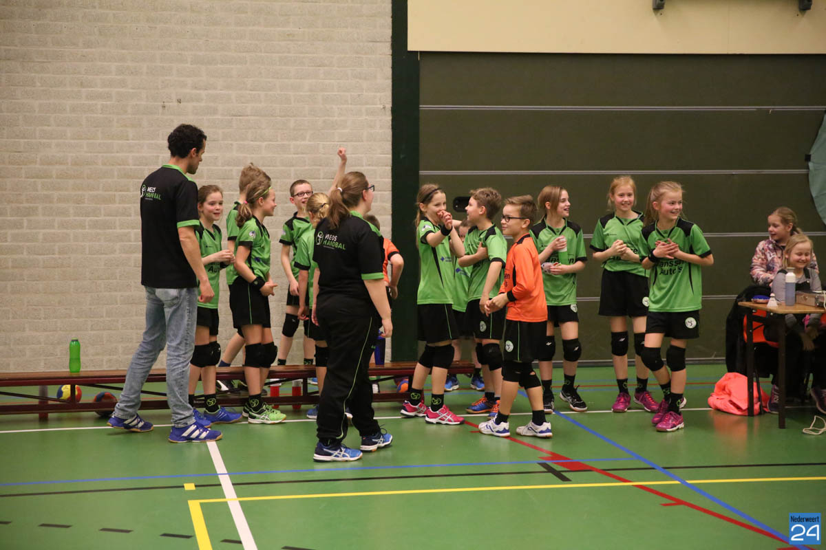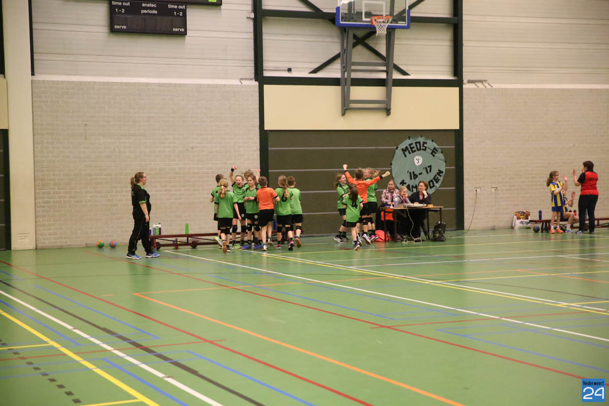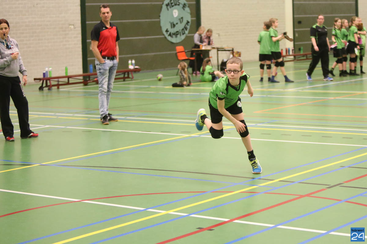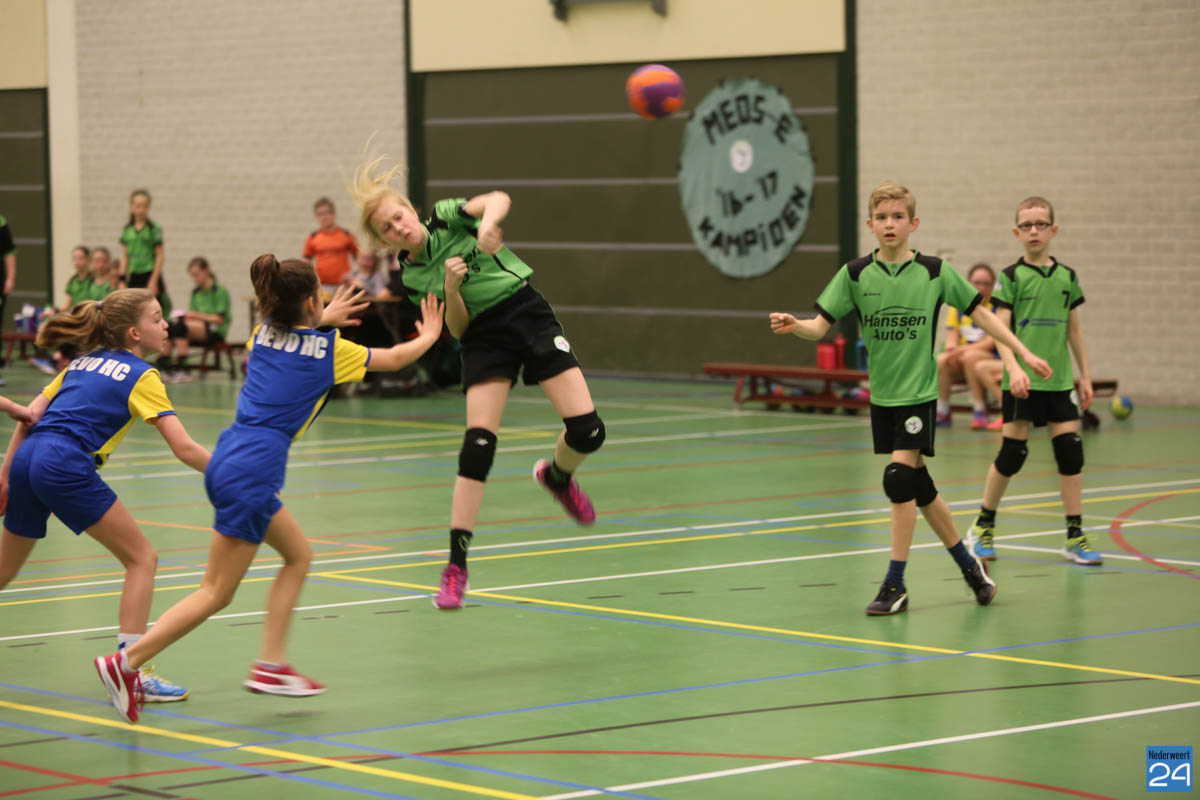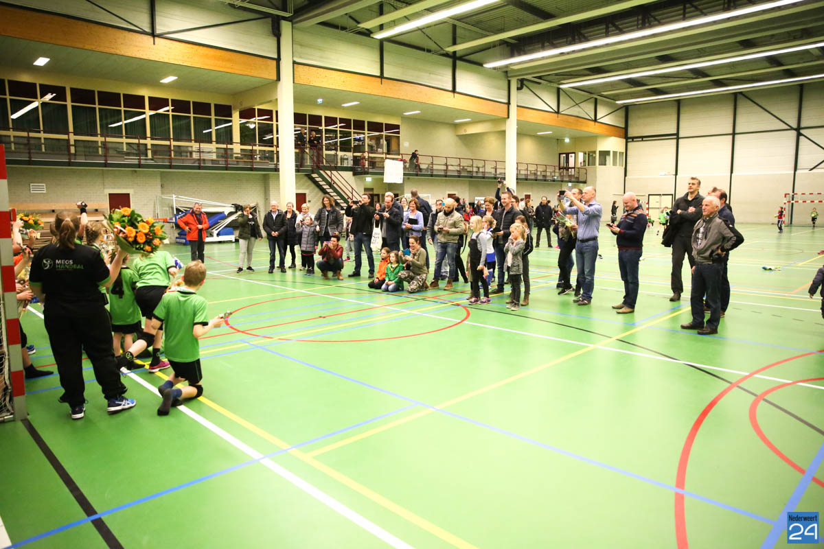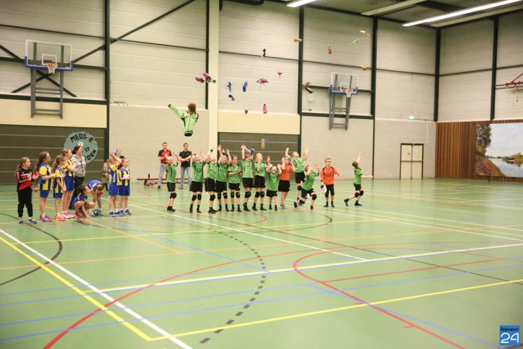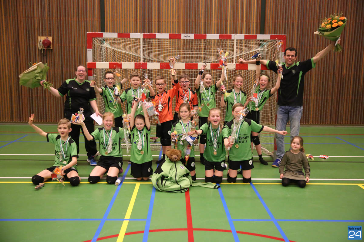 Met spandoeken aan de muur en een goed gevulde tribune ging de wedstrijd om 10.45 uur van start. Al gauw kwam MEOS op voorsprong; stand bij rust 8-1. De tweede helft verliep eveneens goed met als mooi eindresultaat 12-5. De kinderen speelde heel fanatiek en streden voor elke bal. Er waren mooie aanvallen te zien en even mooie reddingen door de keepers. Na het eindsignaal stak een groot gejuich op: MEOS E in zwart en groen, werd vandaag dik verdiend kampioen!