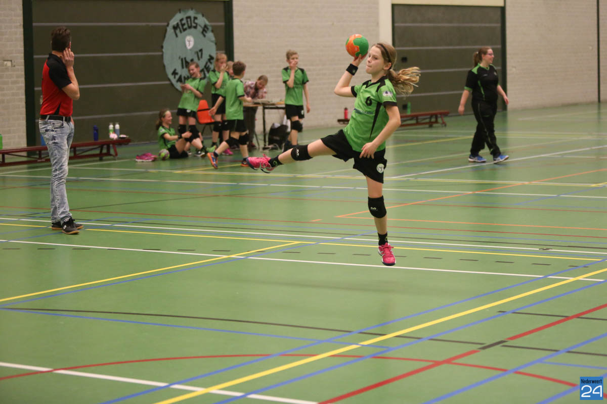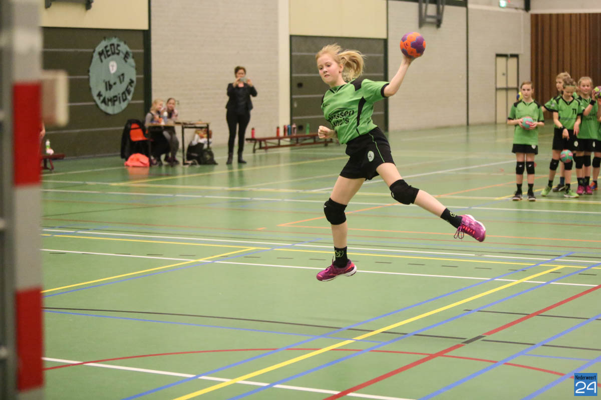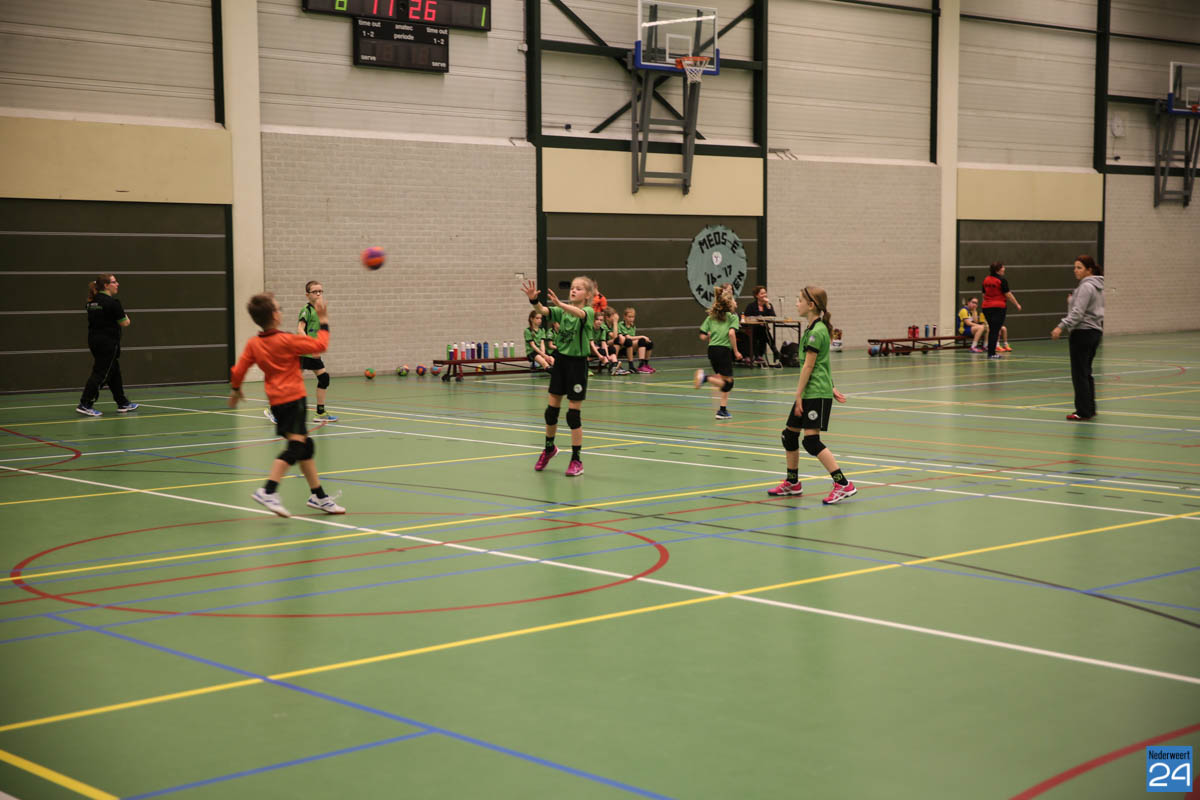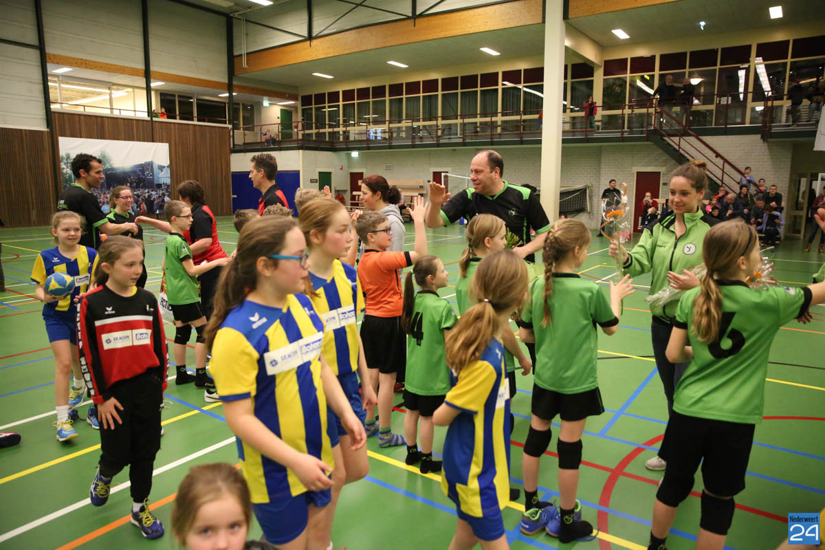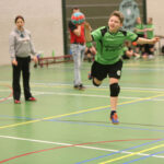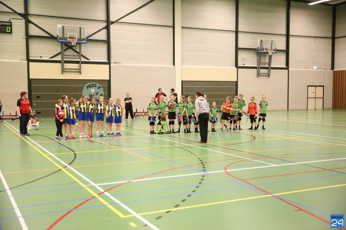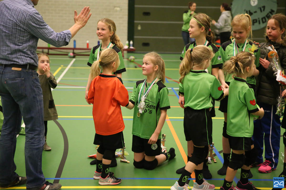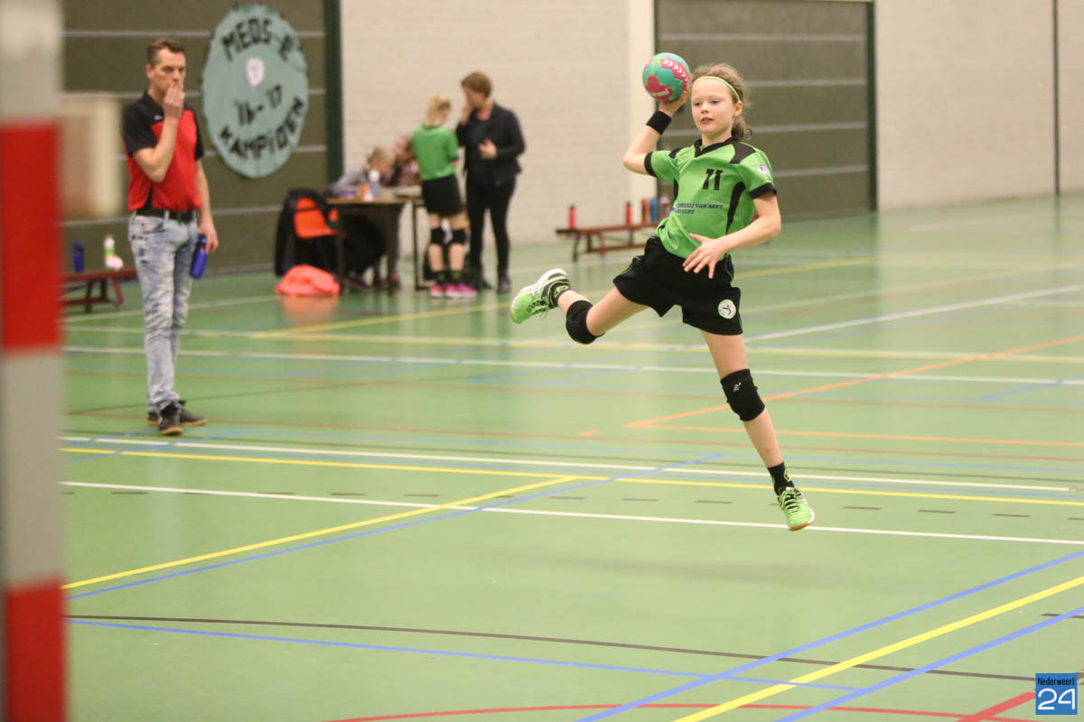 Met spandoeken aan de muur en een goed gevulde tribune ging de wedstrijd om 10.45 uur van start. Al gauw kwam MEOS op voorsprong; stand bij rust 8-1. De tweede helft verliep eveneens goed met als mooi eindresultaat 12-5. De kinderen speelde heel fanatiek en streden voor elke bal. Er waren mooie aanvallen te zien en even mooie reddingen door de keepers. Na het eindsignaal stak een groot gejuich op: MEOS E in zwart en groen, werd vandaag dik verdiend kampioen!