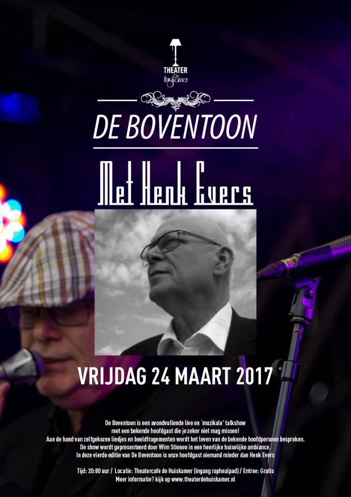 De Boventoon is een avondvullende live en ‘muzikale’ talkshow met een bekende hoofdgast die je zeker niet mag missen! Aan de hand van zelfgekozen liedjes en beeldfragmenten wordt het leven van de bekende hoofdpersoon besproken. De show wordt gepresenteerd door Wim Stienen in een heerlijke huiselijke ambiance.