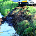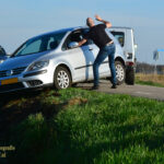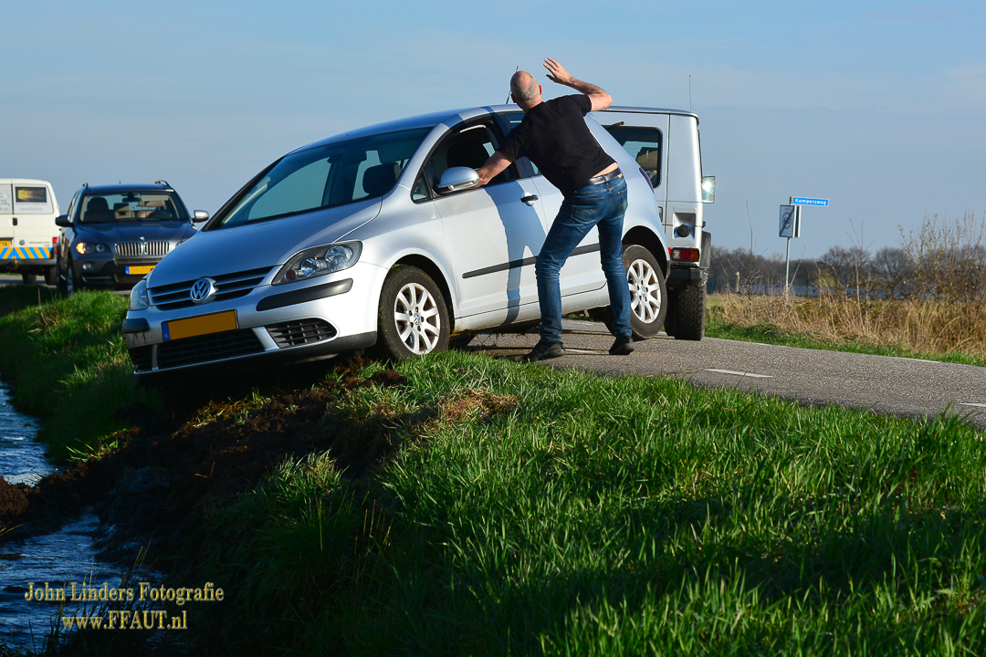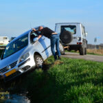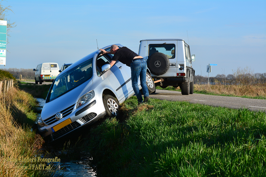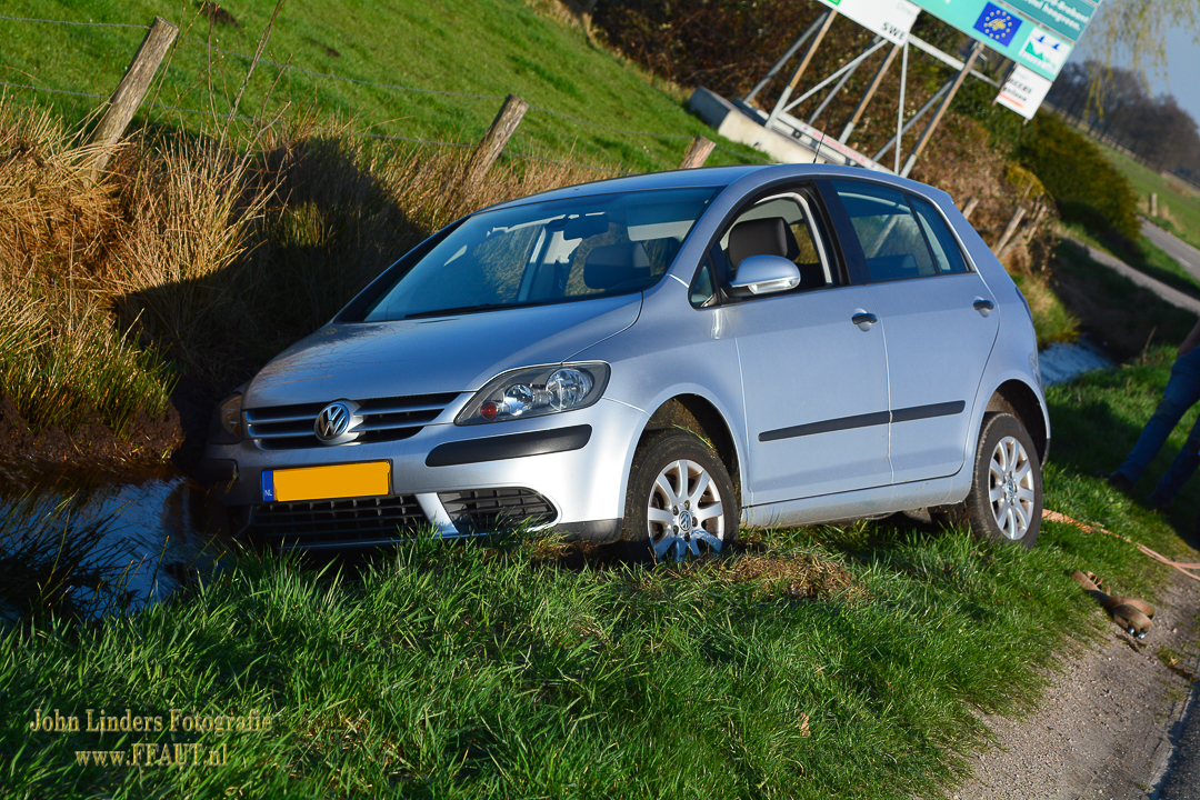 De auto was met het voorwiel in de berm terecht gekomen en door de natte, verzadigde grond kon de bestuurster de auto niet meer houden en is deze rustig in de sloot geleden. Met hulp van bekende werd de auto weer op de verharde weg gezet en kon de vrouw haar weg vervolgen.