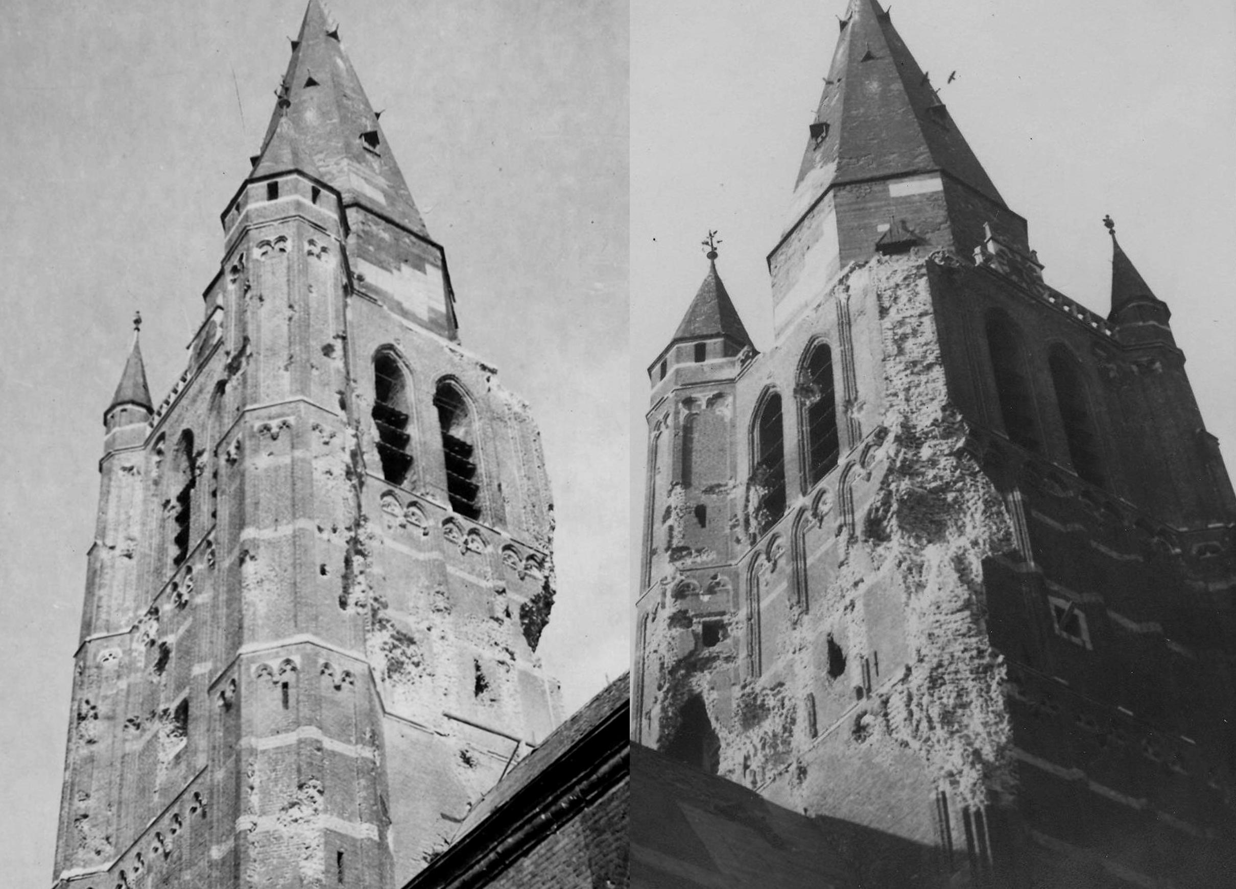 Jan Biezenaar fotografeerde de zwaarbeschadigde toren van de St. Lambertuskerk in 1945 na de eerste provisorische herstellingen van de leidaken van kerk en toren. Ton Frenken maakte actuele foto’s vanuit exact hetzelfde gezichtspunt. Door de oude en nieuwe situatie te vergelijken is goed te zien hoe desastreus de beschietingen met granaatvuur zijn geweest. Daarbij lijken de beschadigingen anno 2017 een peuleschilltje. Maar dat er voor het herstelkarwei ook nu weer vele schouders nodig zijn, is een zaak die nu al duidelijk is.