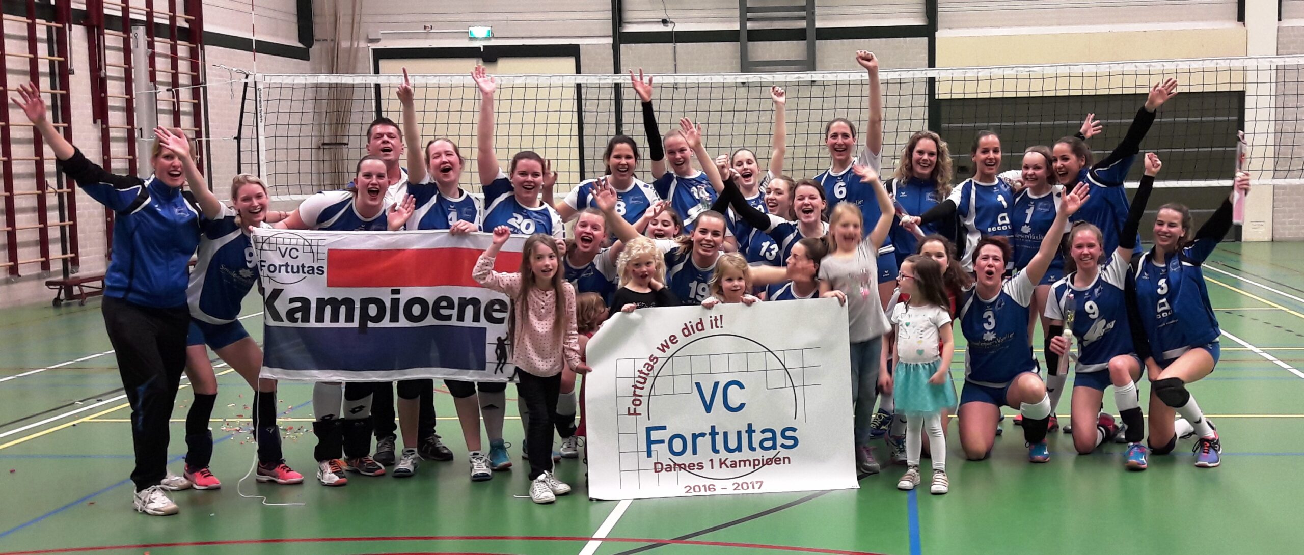 Ook Dames 1 zou bij winst kampioen zijn. Afgelopen week lukte het nog niet en dat scenario wilden de dames niet meer. Na een aarzelend begin kwam de machine op gang en werd de eerste set met 25-21 gewonnen. De dames gooiden alle schroom van zich af en overdonderden Limac in de tweede set met 25-12. Na ook een ruime winst in de derde set (25-18) was het kampioenschap een feit. Een geweldige prestatie. Dit geweldige gevoel leidde helaas niet naar de winst in de vierde set. Deze werd met 20-25 afgegeven. Het kon de pret echter niet drukken. De Dames 1 van VC Fortutas zijn terecht kampioen.