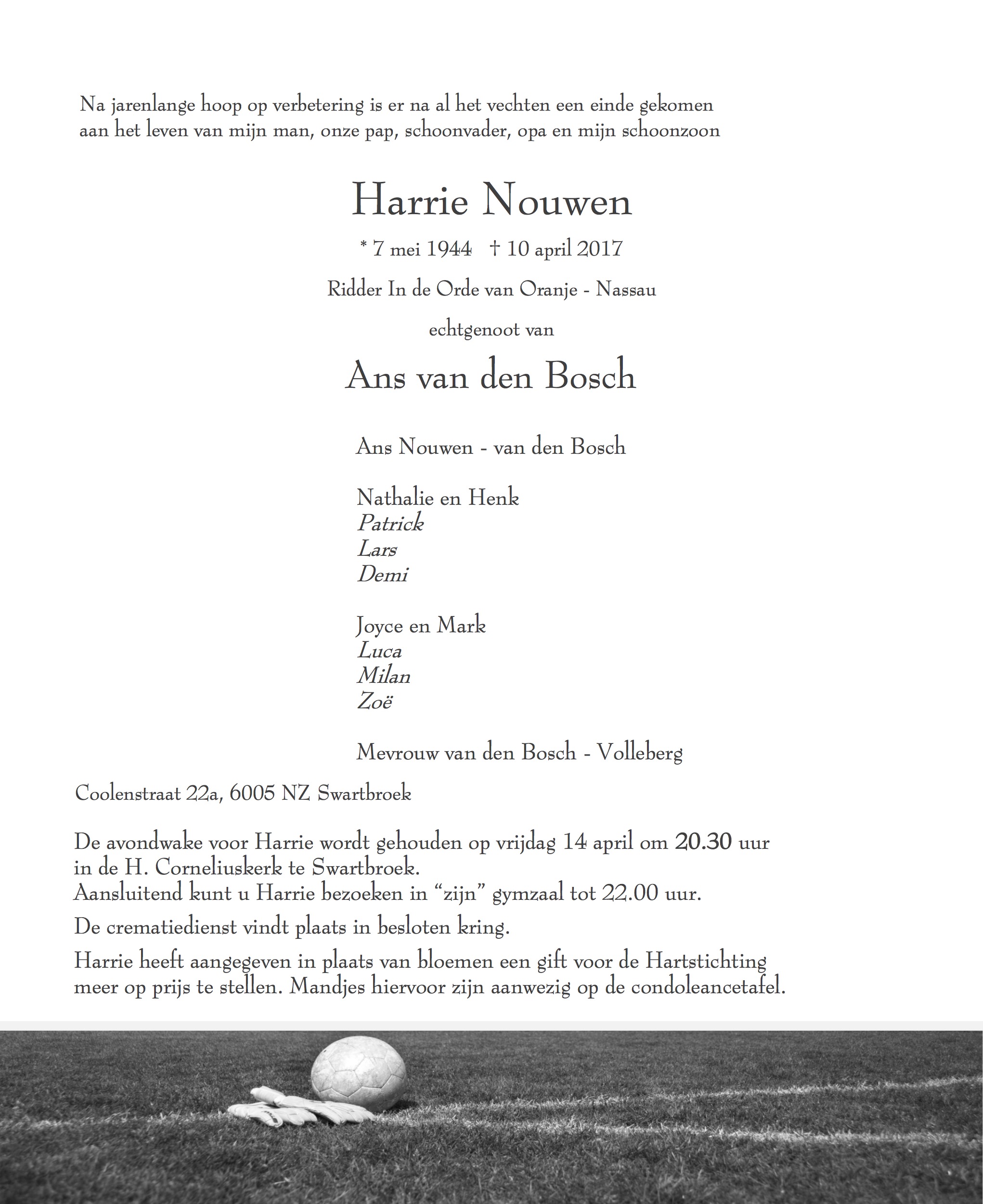 GECONDOLEERD ALLEN.Veel sterkte Samen.Ik kende Harrie als een gedreven persoon die zijn mening niet onder stoelen of banken schoof.Ik had graag met hem te doen.Hij zette zich in als keeper van RKSVV en later in de vereniging (als secretaris en leider van de jeugd),rapporteur van de scheidsrechters,de gymzaal van Swartbroek.Kortom een verenigingsmens.Hij zal gemist worden.Groetjes, Tjeu Rutten