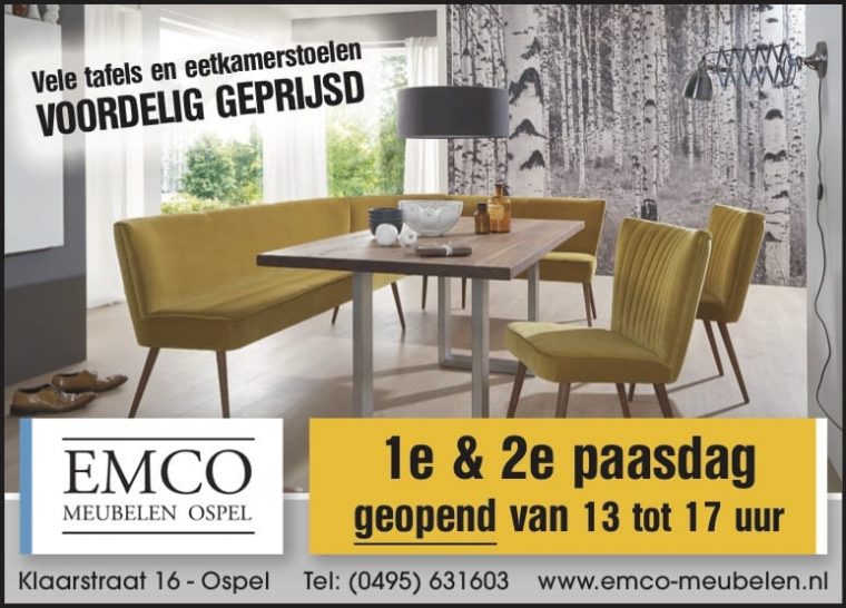 EMCO Meubelen en My-Thing in Ospel zijn op eerste en tweede paasdag van 13.00 tot 17.00 uur geopend. Vele tafels en stoelen zijn voordelig geprijsd. Tevens is een grote nieuwe collectie zitbanken te zien in de showroom. Mogelijk in leder en stof, een tweezits, driezits bank of een gehele hoekcombinatie.