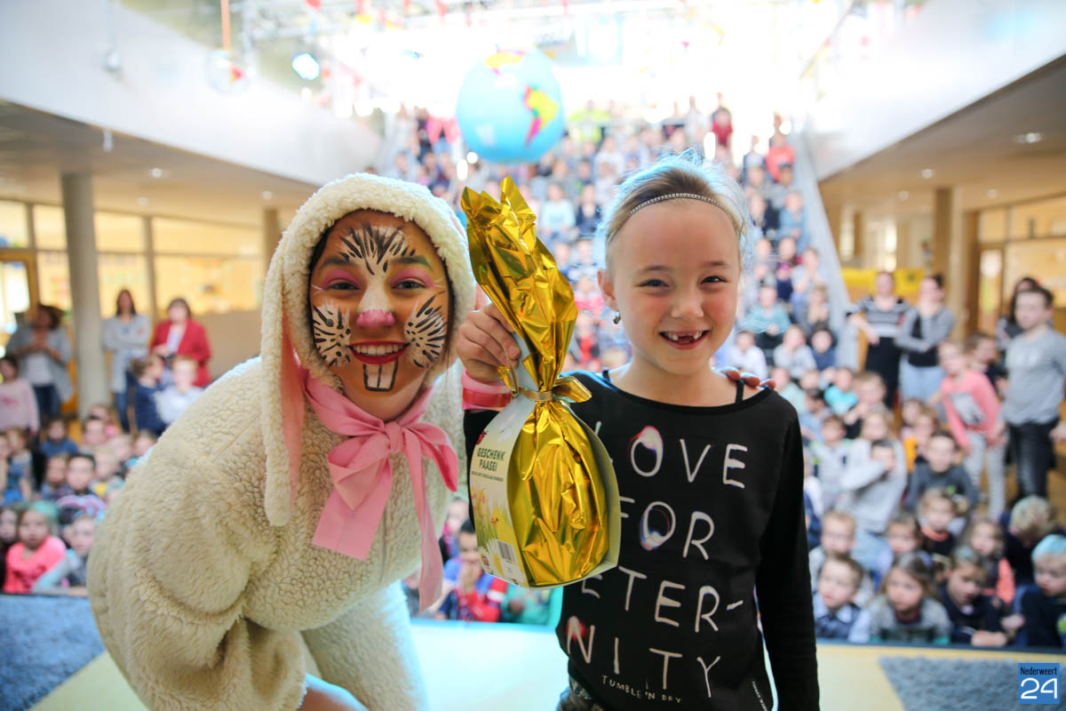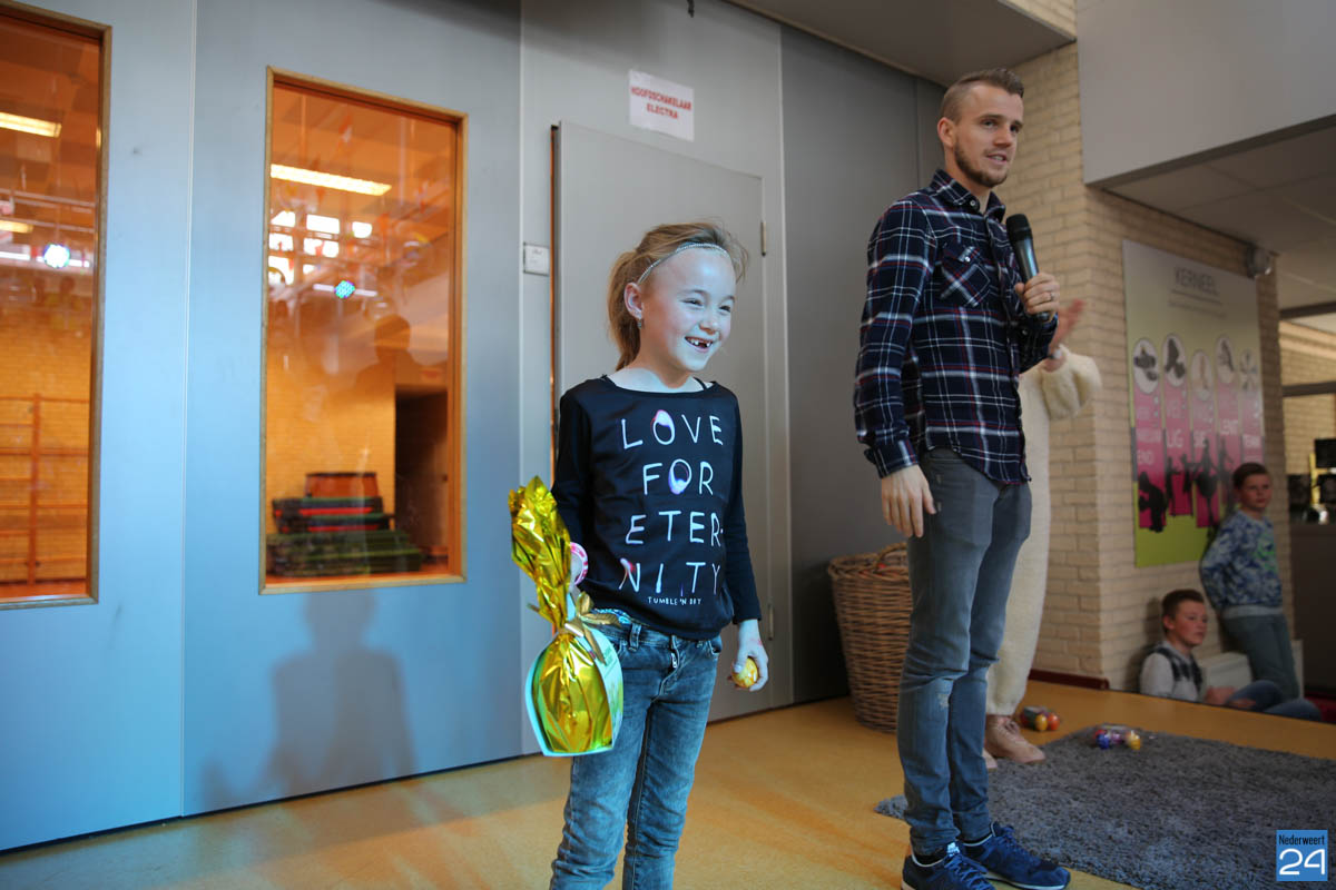 Na het ontbijt vond de grote finale van de Eitje Kluts wedstrijd plaats. Alle klassenwinnaars streden onder toeziend oog van de hele school om de titel “Eitje Kluts Kampioen 2017 van IKC de Kerneel”. Tess was de trotse winnaar en kreeg naast deze eervolle titel ook nog een toepasselijke prijs van de paashaas.
