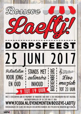 Dit jaar organiseert FC Oda weer haar jaarlijkse Dorpsfeest ‘Bosseve Laeftj’ op zondag 25 juni 2017. Het Dorpsfeest bestaat dit jaar weer uit een vrijmarkt en braderie met de ambiance rondom de lokale horeca met diverse optredens van artiesten en bandjes. Aan culiance zal het ook niet ontbreken.
