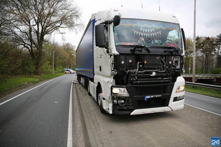 De chauffeur van deze vrachtwagen heeft vrijdagmiddag wel heel veel geluk gehad. Op het allerlaatste moment zag hij zijn voorganger nagenoeg stilstaan en kon met alle geluk van de wereld voorkomen dat hij er vol achterop reed.