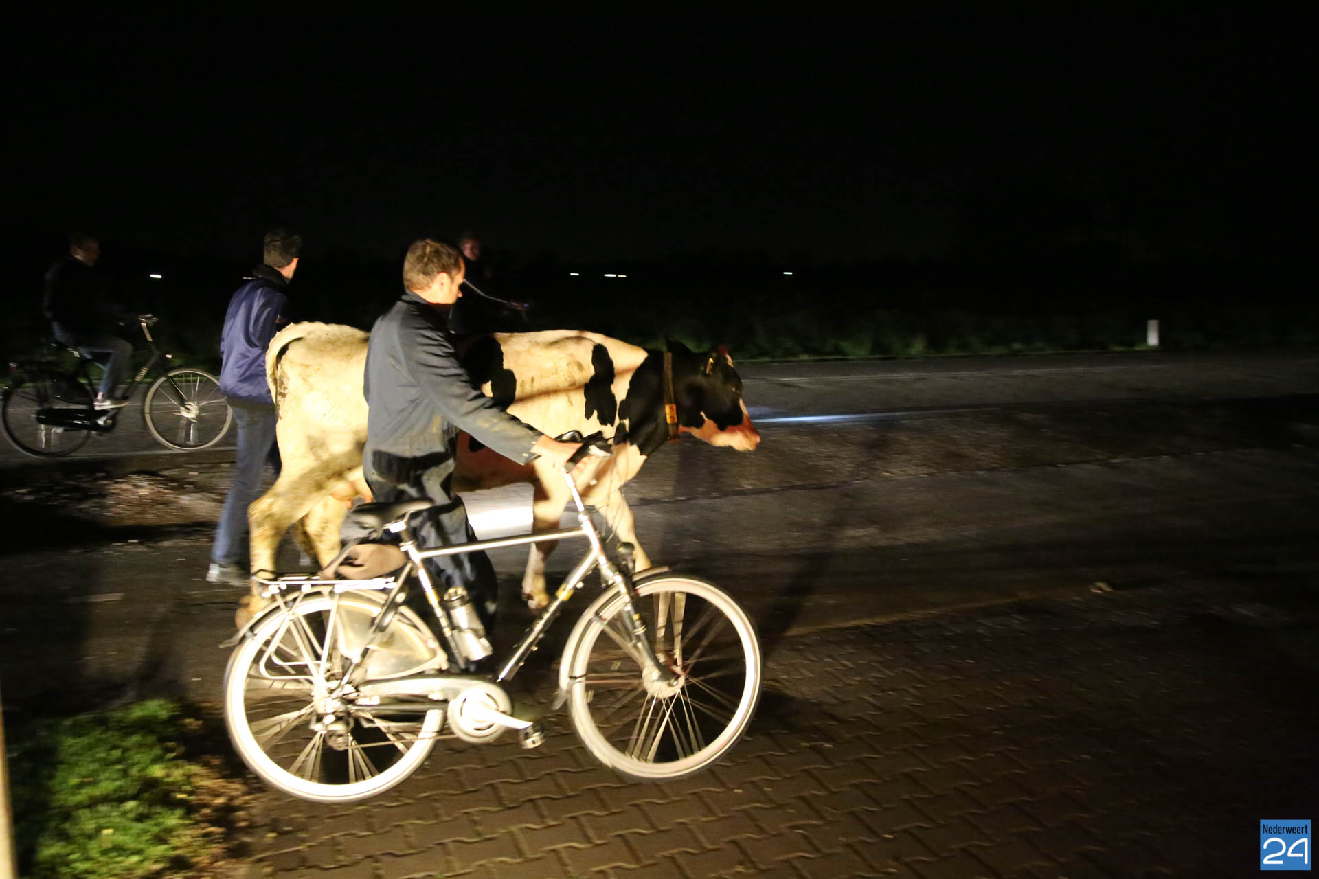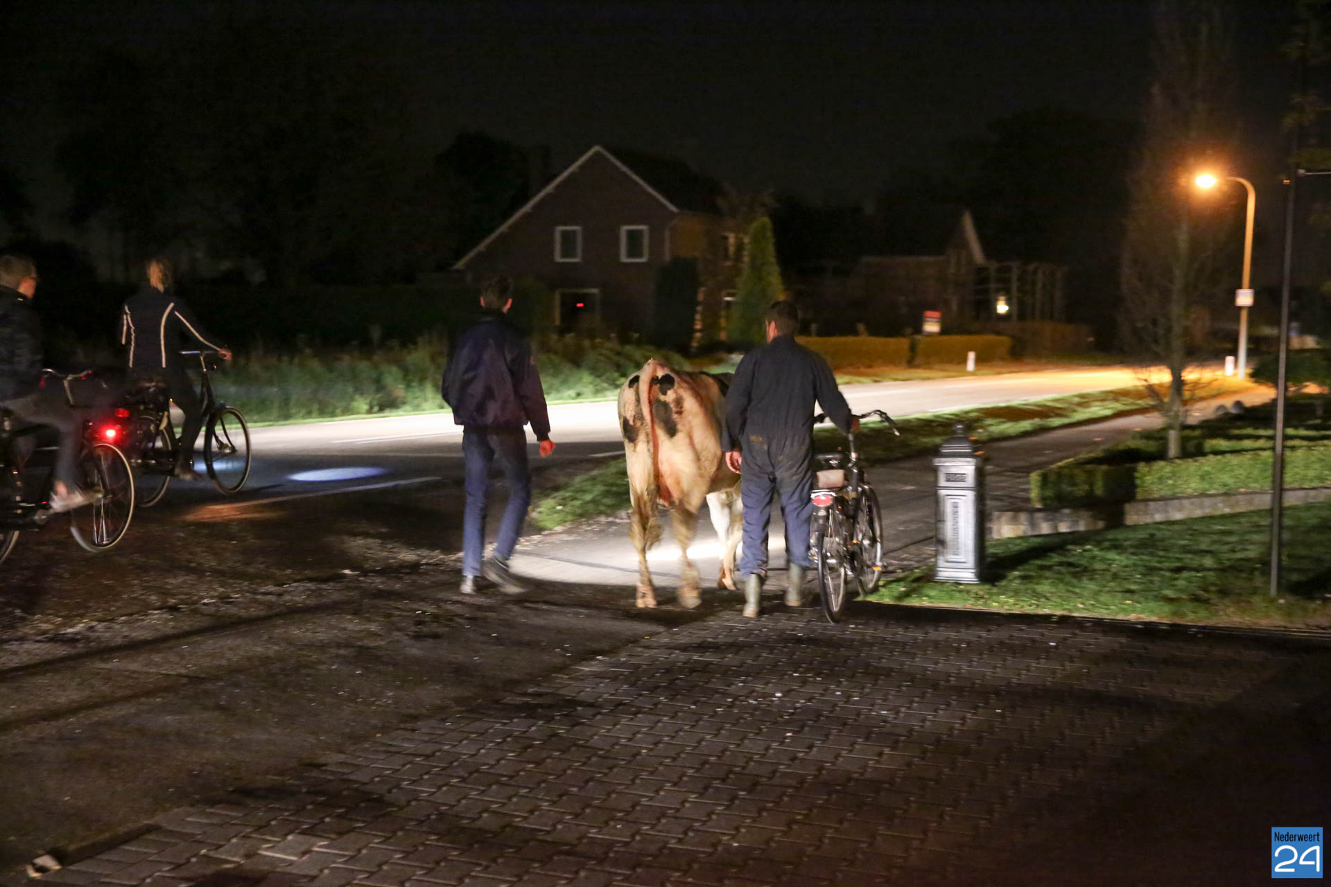 Voorbijgangers waarschuwde naderende auto’s met zaklampen en ondertussen werden de hulpdiensten en een boer uit de buurt werden gewaarschuwd. Al snel werd duidelijk dat de koe uit de stal van de boer was ontsnapt. Het dier was kalm en rustig. Met gezond boerenverstand wisten men het dier weer naar de stal te drijven. Eind goed al goed!