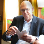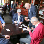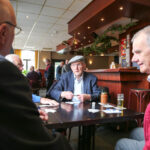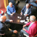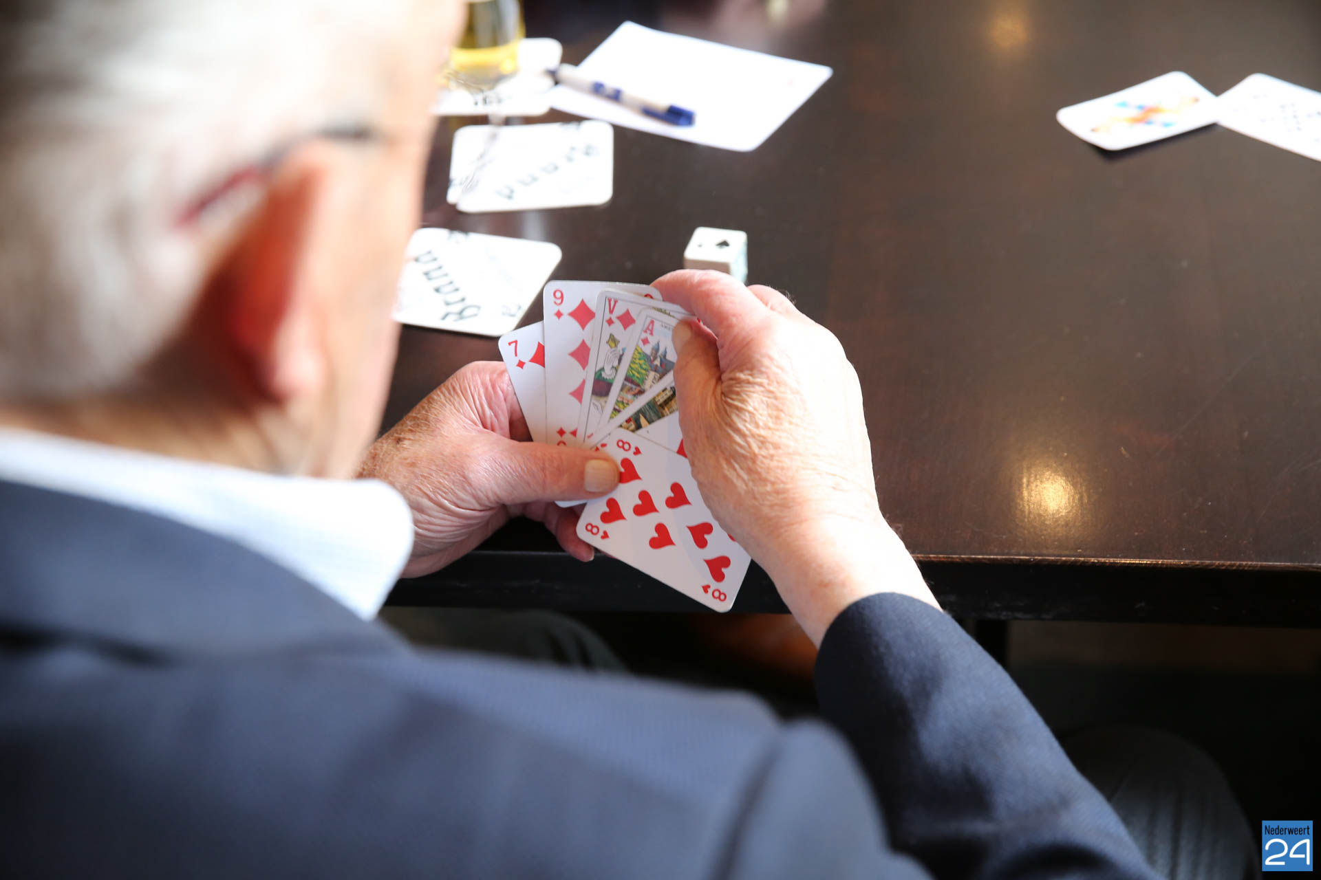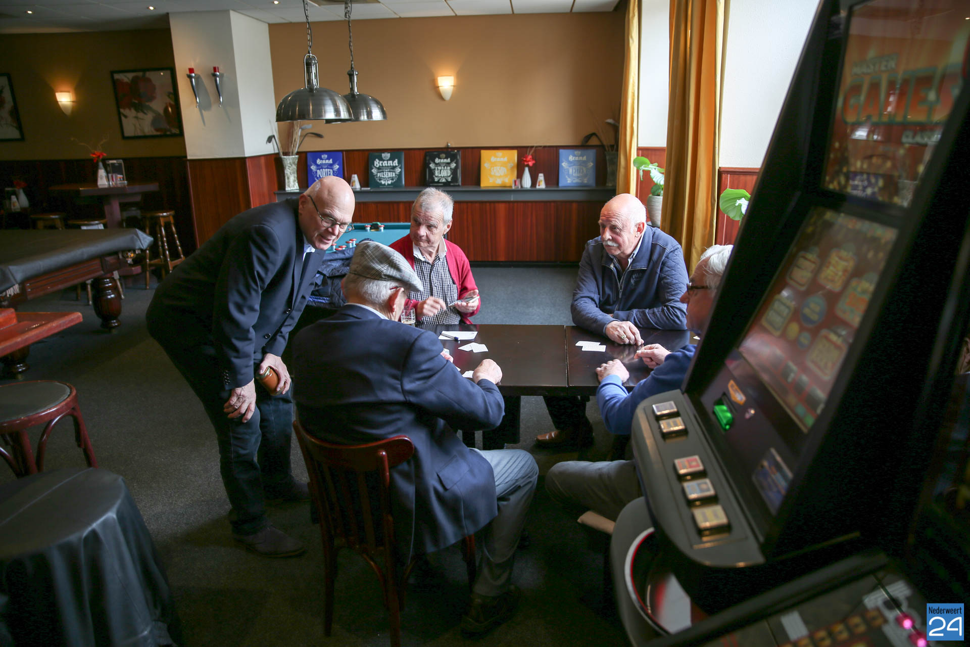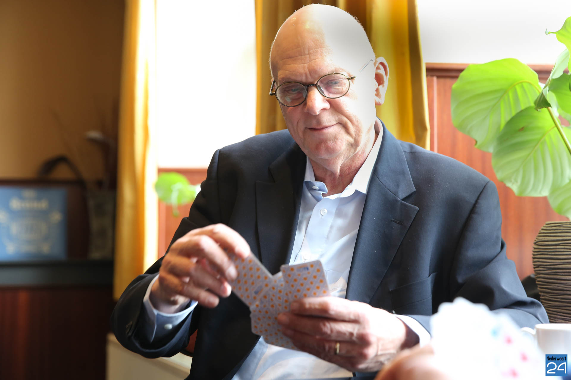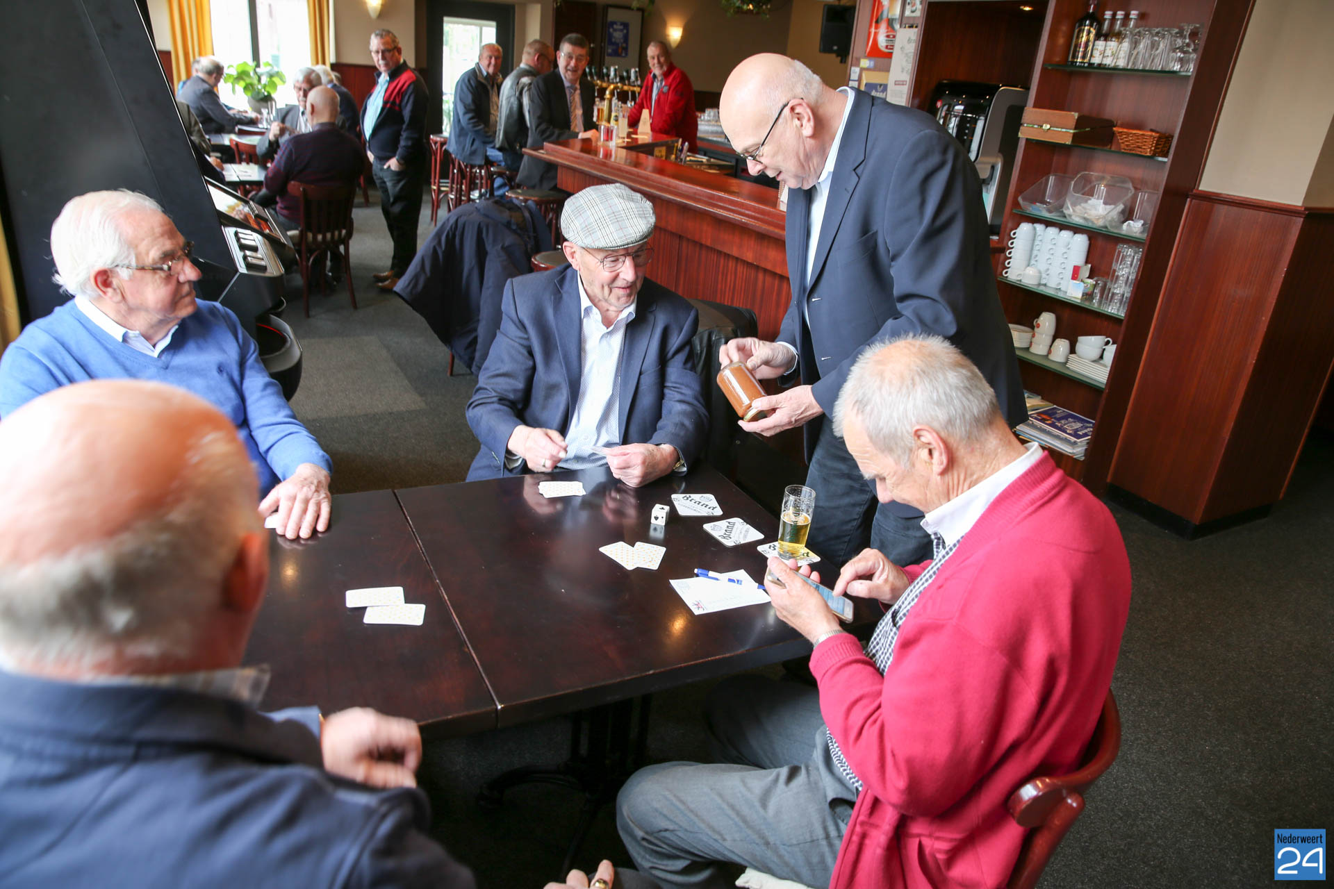 Henk Evers, burgemeester van Nederweert, had hierover gehoord en verraste Piet vandaag met een bezoek. Om half twaalf tikte de burgemeester de gedreven kaarter op de schouder. Piet was blij verrast met het bezoek en strikt de burgemeester meteen om een ronde mee te kaarten. “Het is goed dat ik weet dat u kunt kaarten. Soms hebben we iemand te kort en dan moet ik altijd een vervanger regelen. Nu weet ik wie ik kan bellen”, lacht Piet.