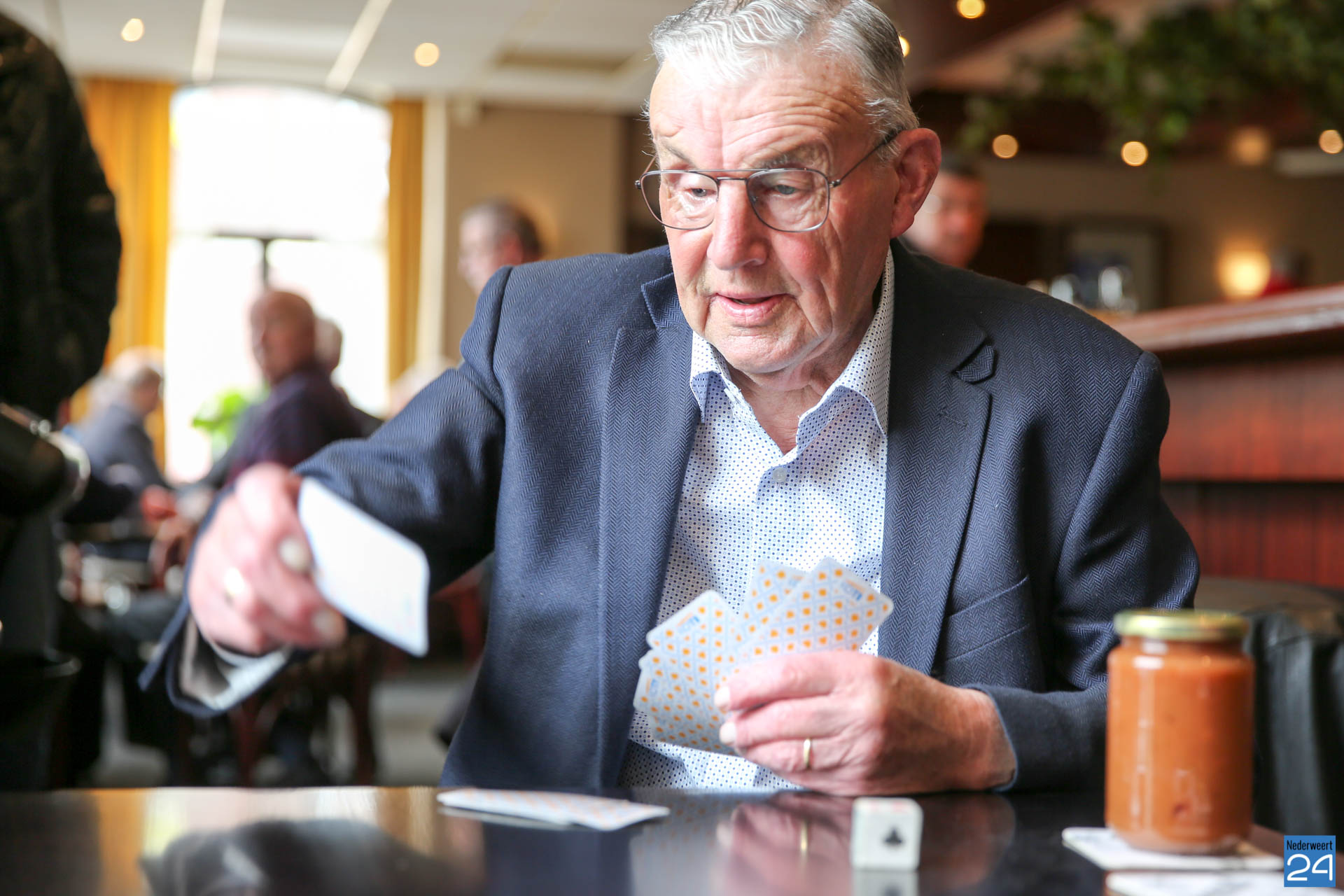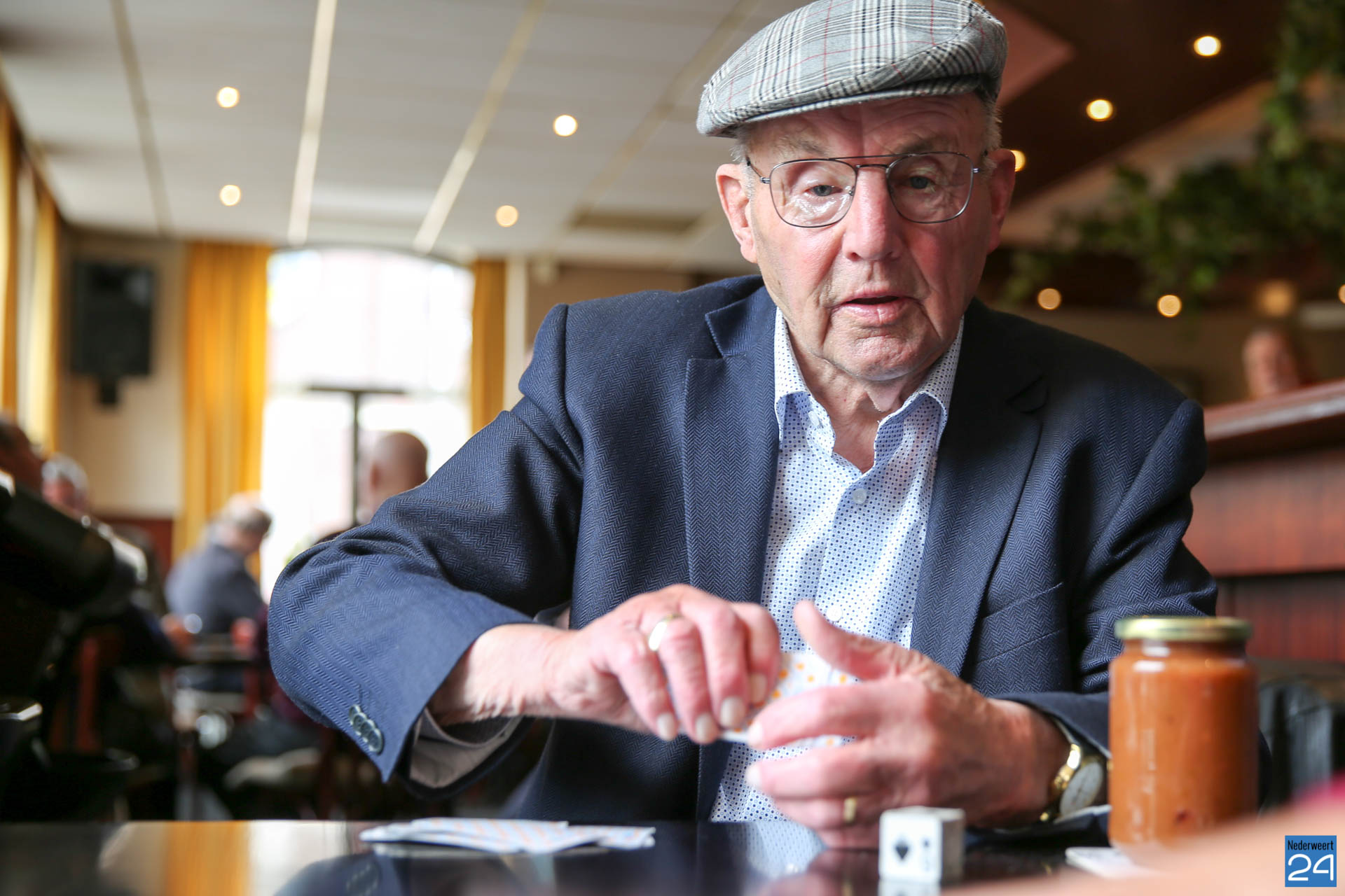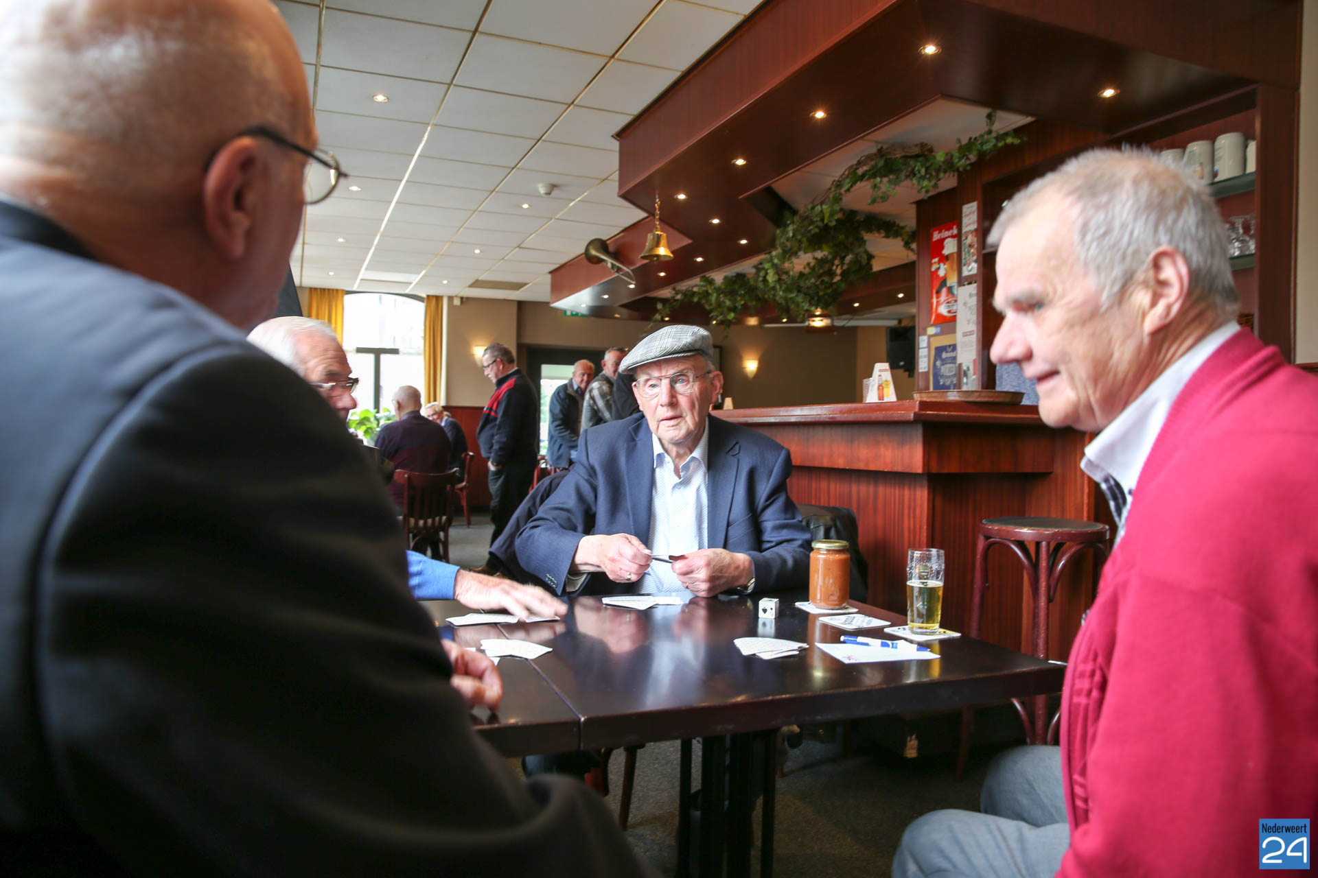 Piet van de Boom (90) kaart al zeker 74 jaar elke zondag in café Gubbels alias Bi-j Teune alias Julianazaal en inmiddels Café Het Peeljuweel tegenover de kerk in Ospel. Samen met Jan Koppen (77), Paul Joosten (69) en Henk Feijen (64) leggen ze stipt om 11 uur de kaarten op tafel. Ze drinken een kopje koffie, vier biertjes en er gaat maximaal een euro kaartgeld verloren.