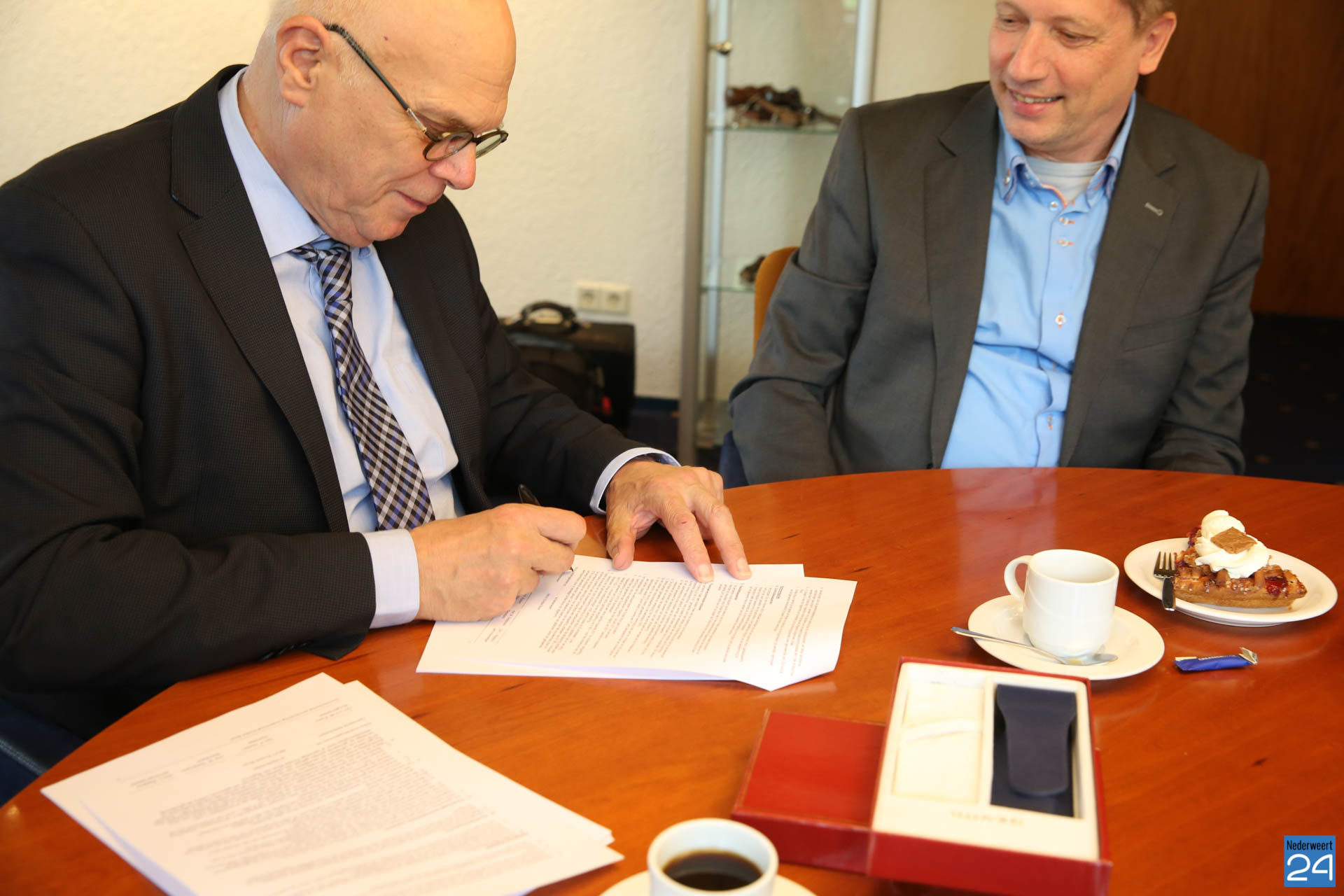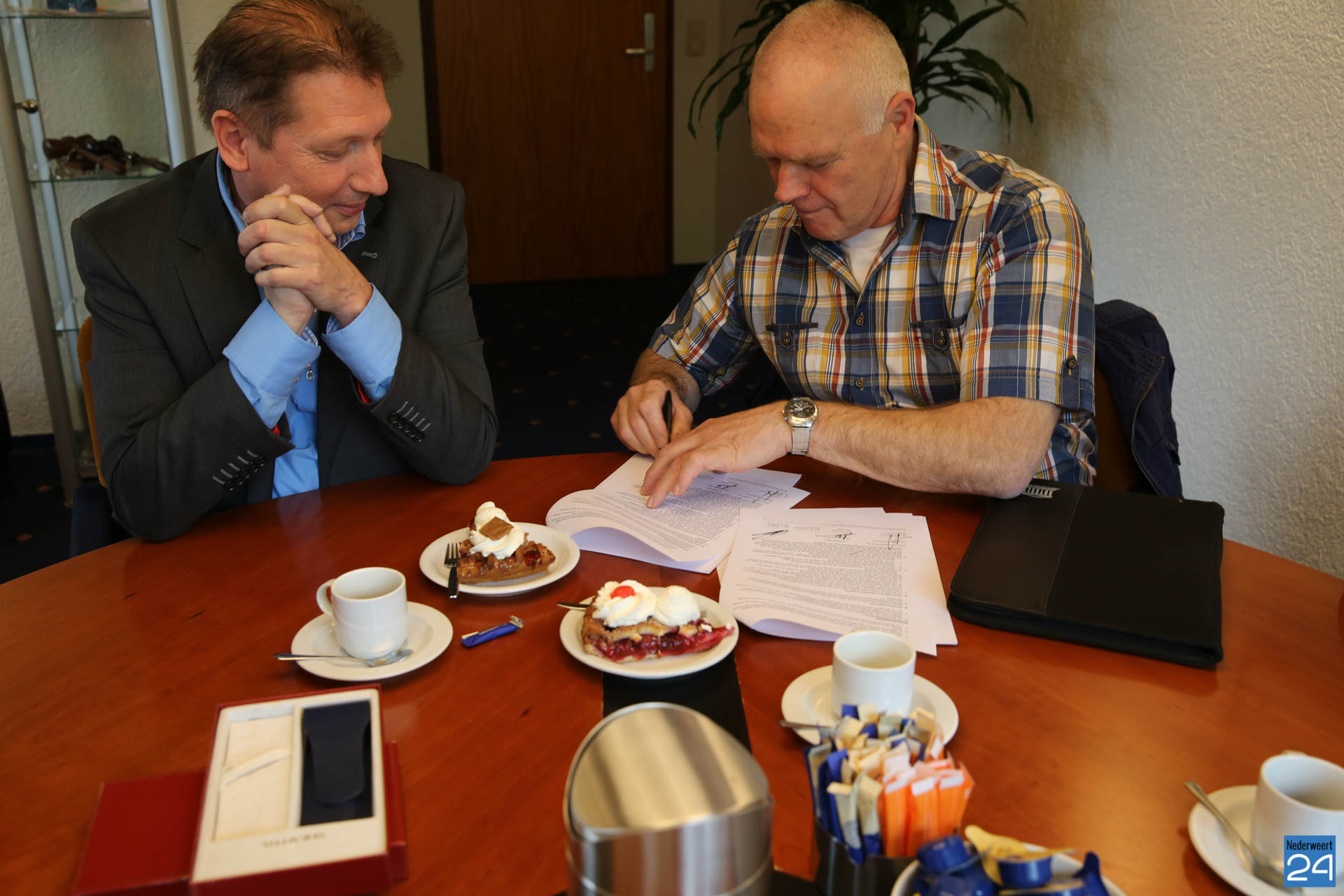 Vanmiddag hebben burgemeester Evers en een afvaardiging van voetbalvereniging Eindse Boys een overeenkomst getekend om het totale onderhoud van sportpark Op den Hooven in Nederweert-Eind over te dragen. Eigenlijk deed de club dit al een paar jaar maar vanaf 2017 wordt het onderhoud officieel overgedragen.