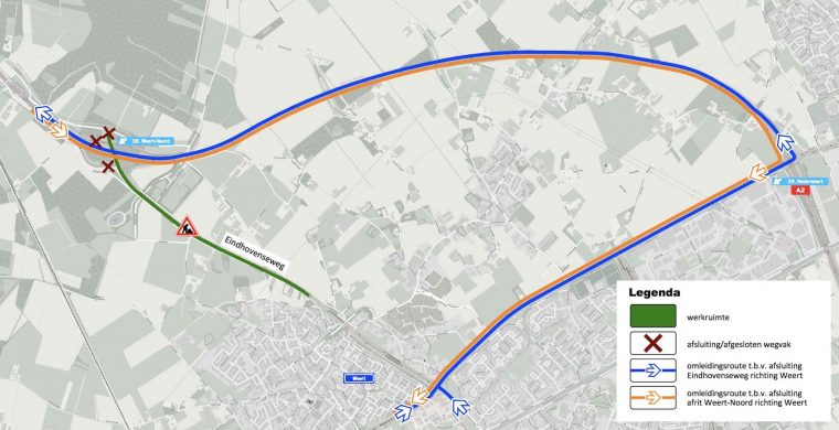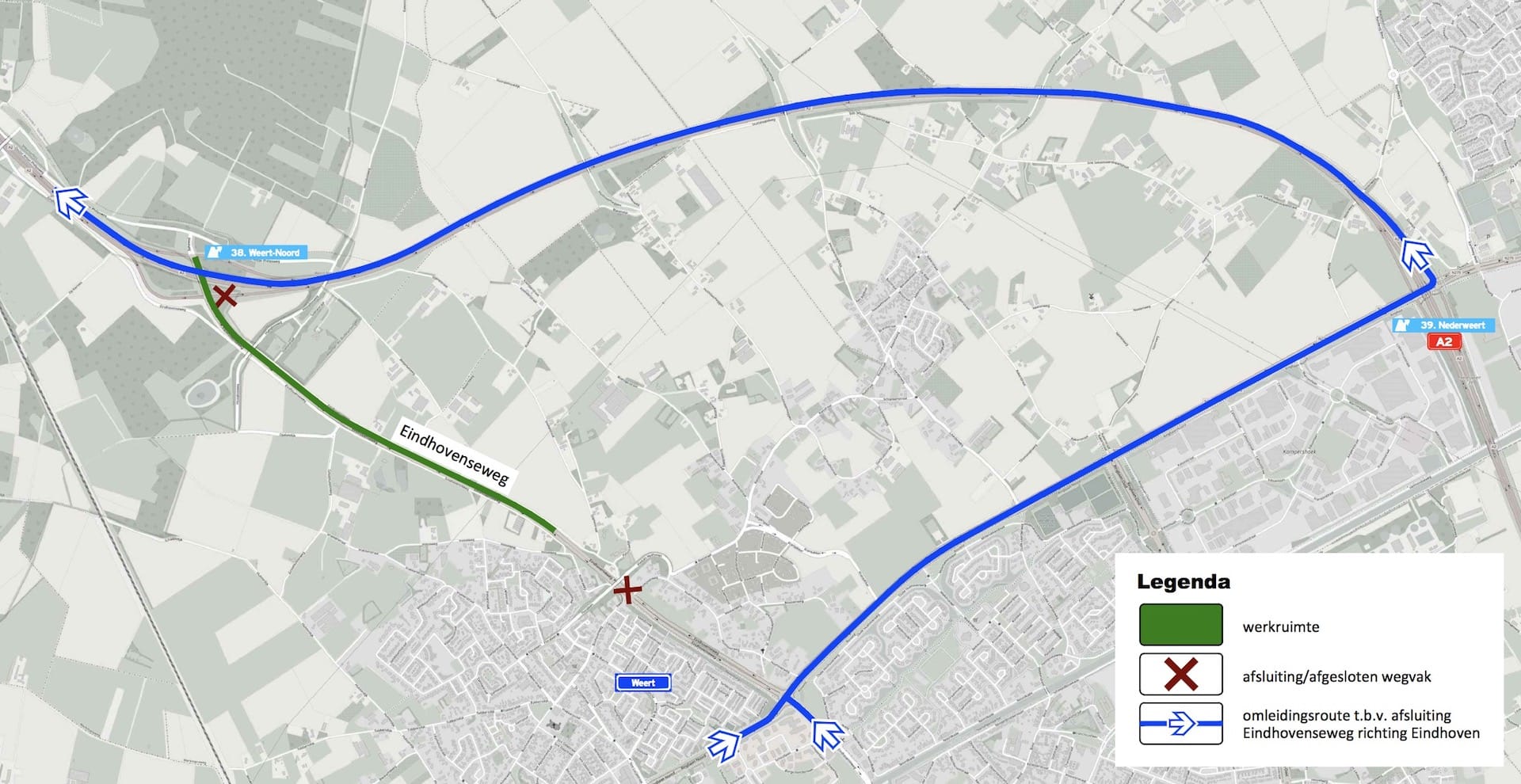 De Eindhovenseweg in Weert, vanaf de A2 tot aan Weert-Noord, is in een dusdanig verminderde staat dat de weg op korte termijn onderhoud nodig heeft. Voor het uitvoeren van deze werkzaamheden is het noodzakelijk om grootschalige verkeersmaatregelen te treffen. Om zo min mogelijk overlast te veroorzaken worden de werkzaamheden in twee weekenden uitgevoerd: van 12 tot 15 mei en van 19 tot 22 mei.