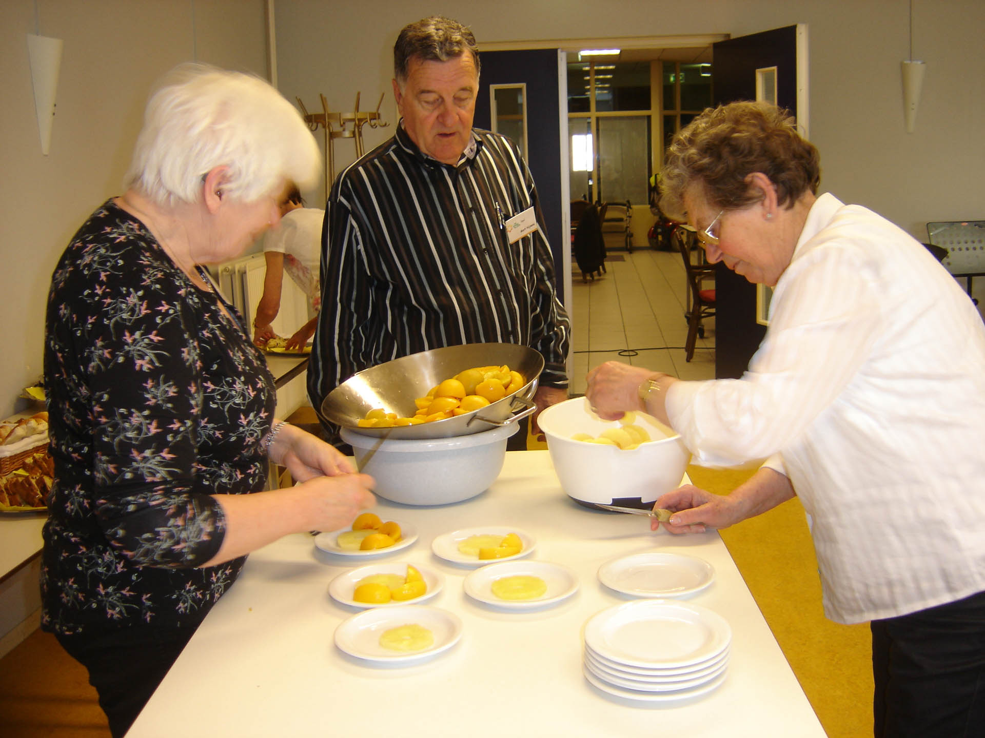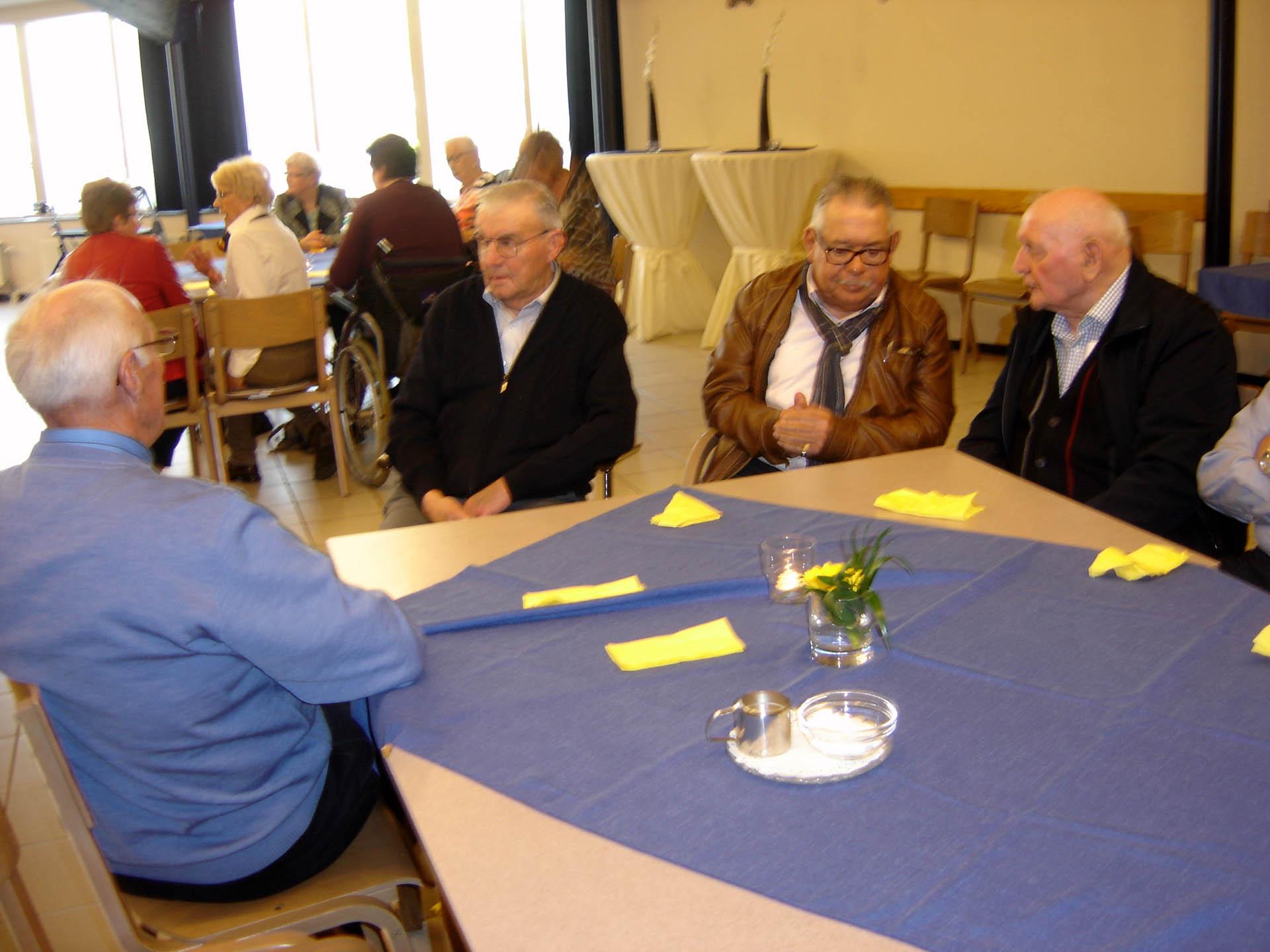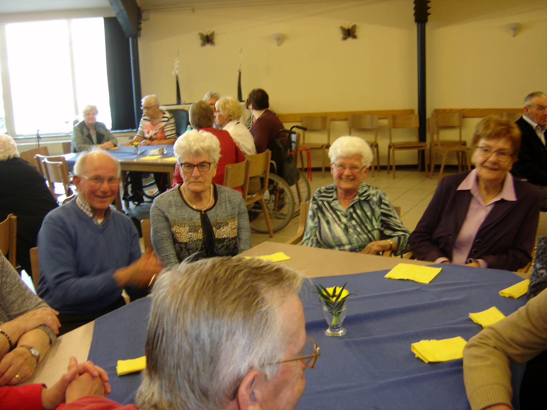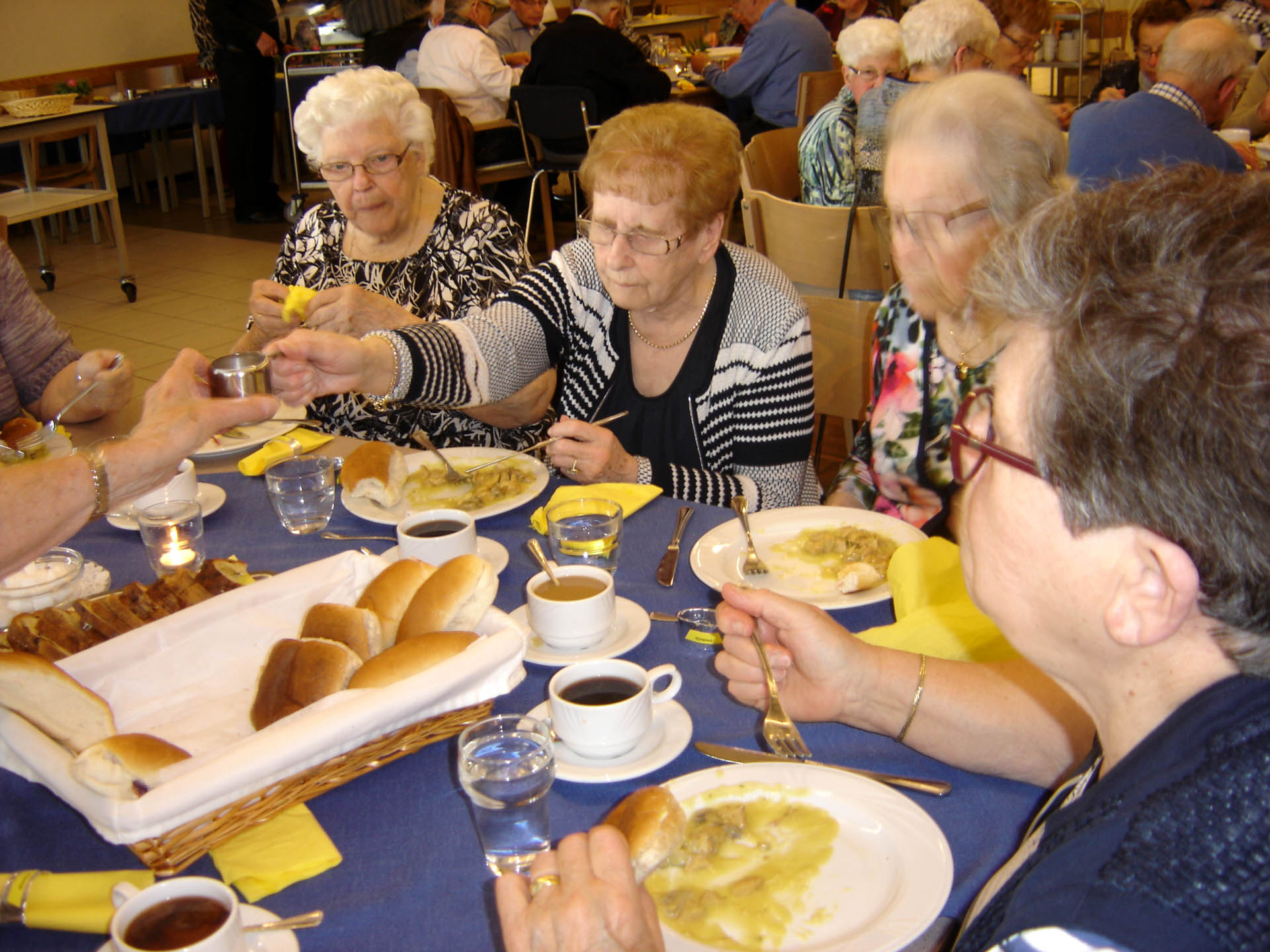 Een beetje na twaalven werd een uitgebreide warme lunch uitgeserveerd die voortreffelijk in de smaak viel. Na een bordje met fruit was het de beurt aan Michiel Malschaert die de mensen vermaakte met liedjes en sketches. Zoals vooraf aangekondigd ging hij rustig van start met o.a. liedjes van John Denver en Leonard Cohen. De aanwezigen zaten stil te genieten en bij de herkenbare teksten en muziek werd meegezongen en geneuried.