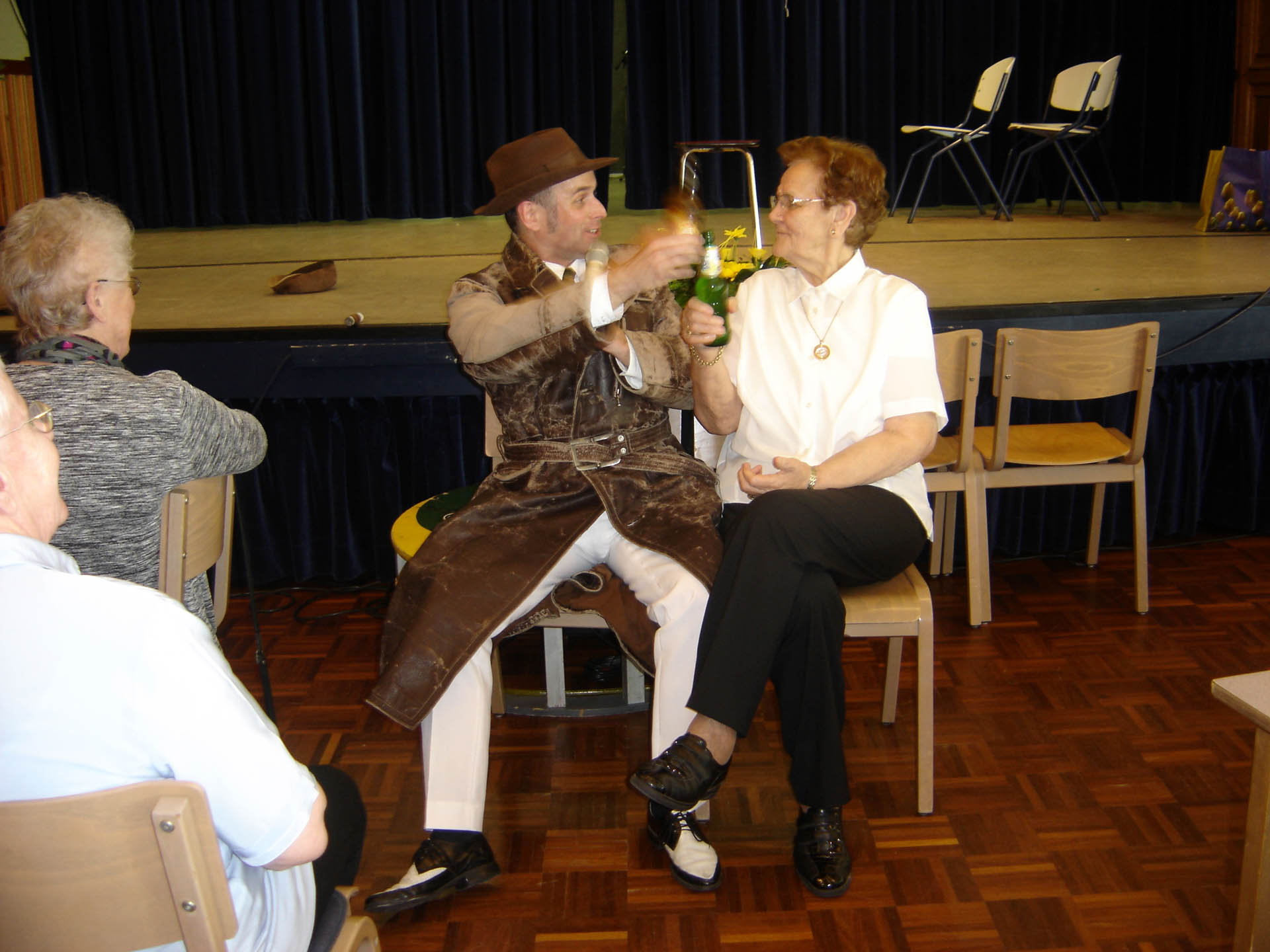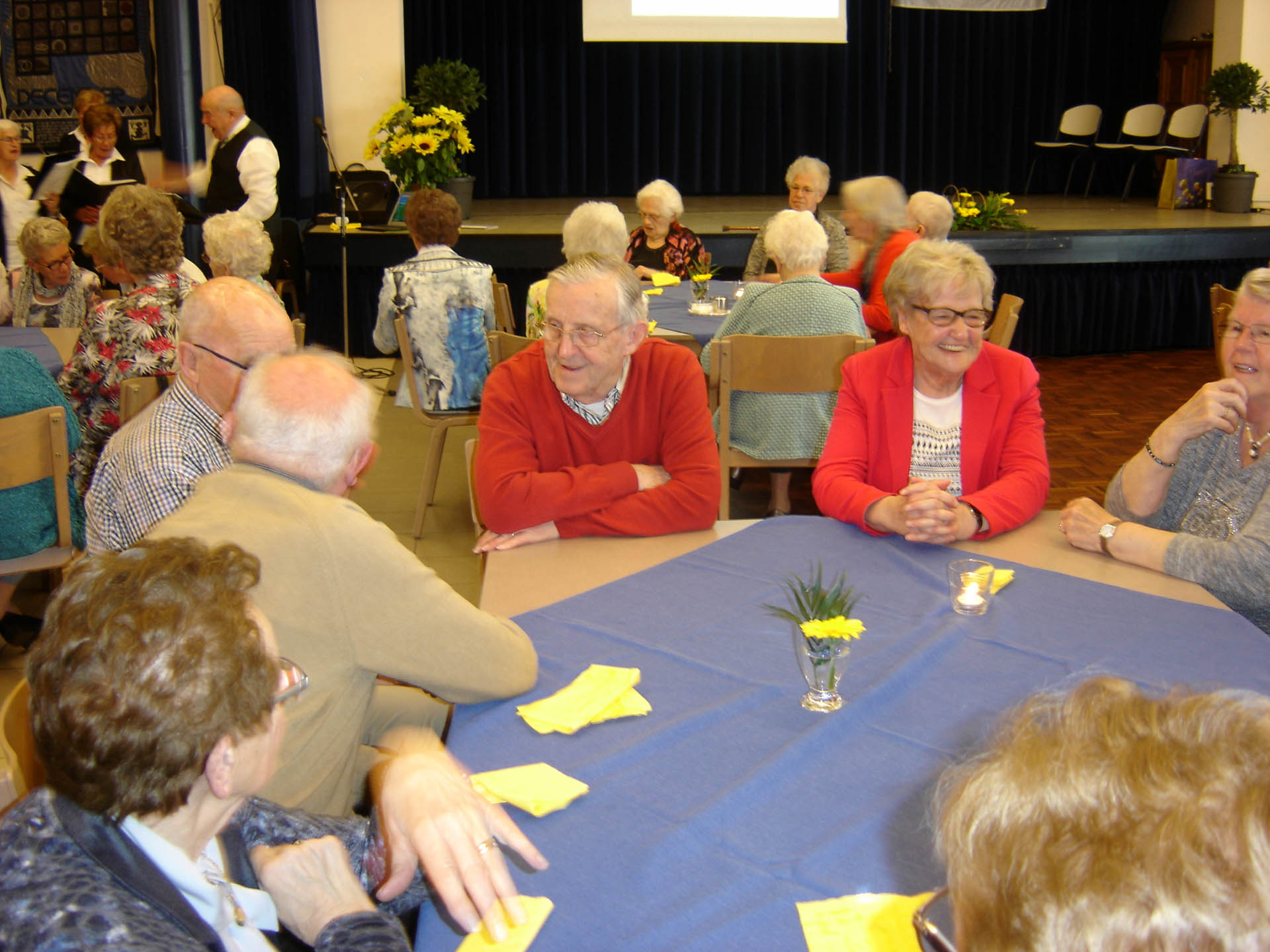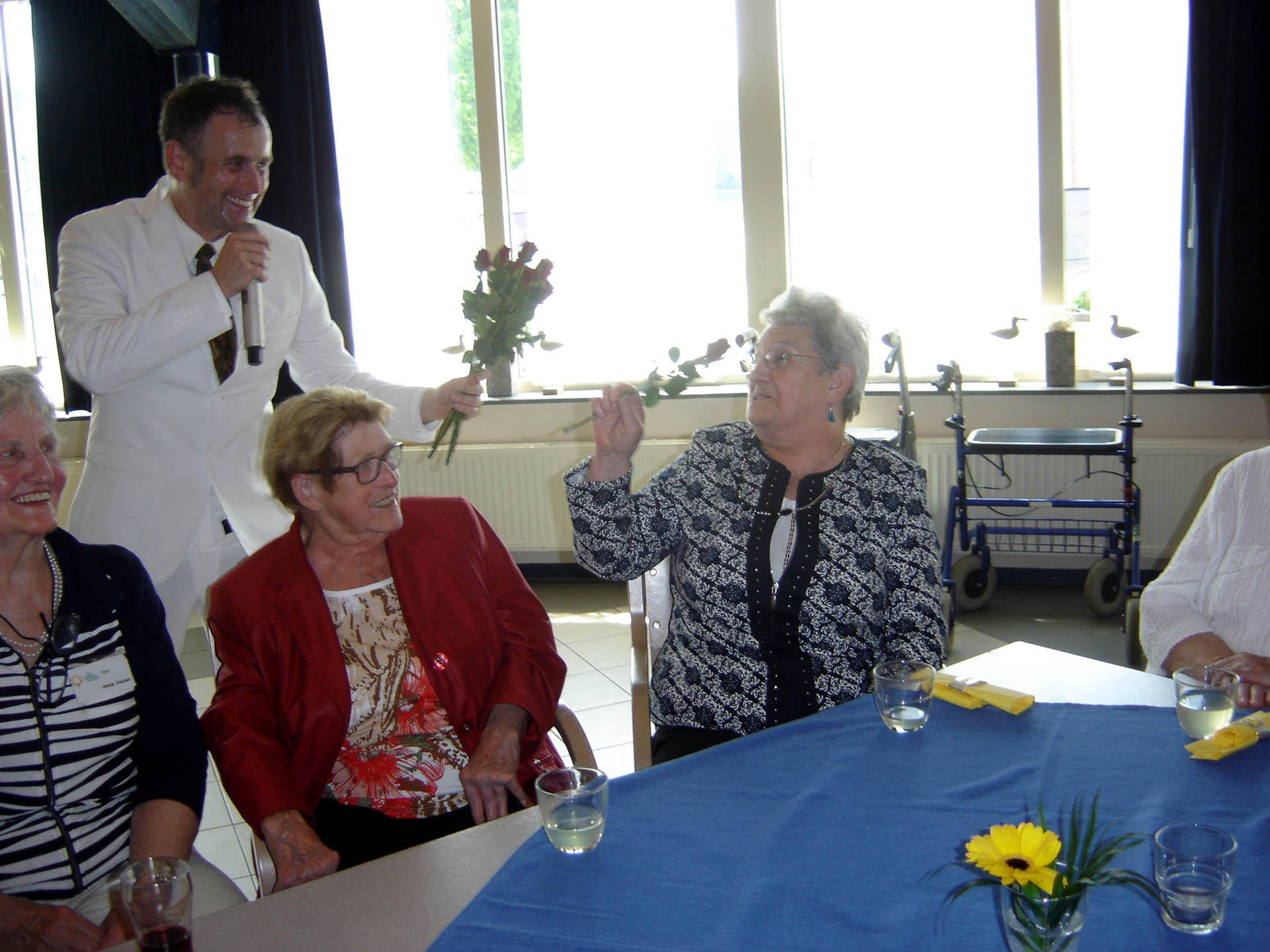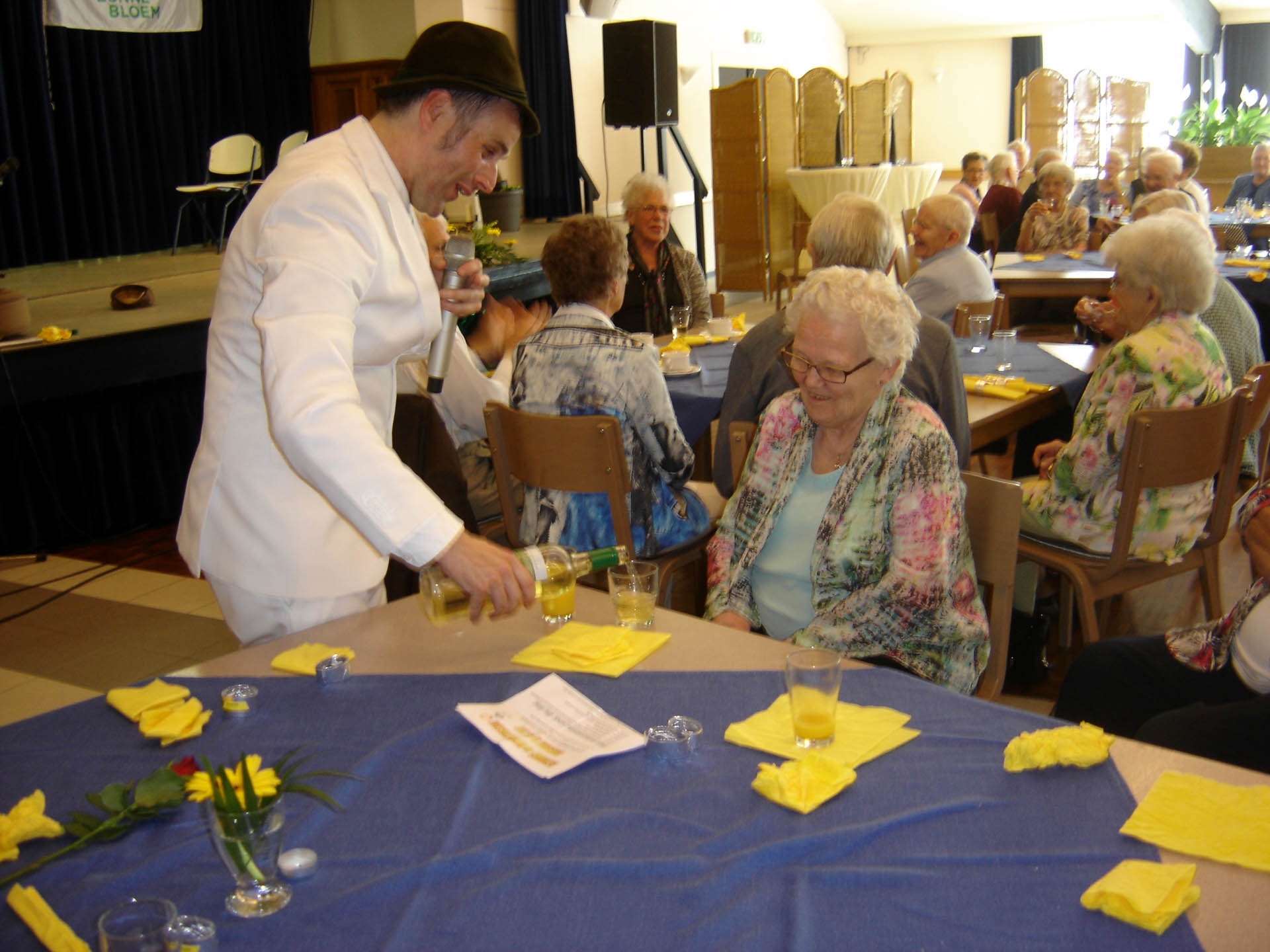 In de pauze met voor allen een glaasje vruchtensap kwam de ware muzikant naar boven. De muziek ging qua geluid een aantal octaven omhoog, alle vrijwilligers werden naar het podium geroepen en mochten hun kunnen tonen. Het was een samengesteld vrijwilligerskoor dat ondanks hun goede bedoelingen nog wat verdere oefening nodig hebben. Maar niet getreurd Michel maakte alles weer goed met zijn talenten. De gasten waren zeer te spreken over zijn muzikale kunsten en show acts. Hij wist zelfs mensen op de niet aanwezige dansvloer te krijgen. Een mevrouw van 89 jaar met vriend danste op de muziek van “Dit is de laatste dans”. Laat ons hopen dat ze nog vele danspassen mag zetten want dansen is haar passie. Ook een mevrouw die jarig was en 87 jaar was geworden werd in het zonnetje gezet. De hele zaal was gevuld met de klanken van “Lang zal ze leven”. Ook hier kan gezegd worden dat we hopen dat het bewaarheid wordt. Na een “zugabe” was rond de klok van vier uur het tijd voor koffie/thee met vlaai.