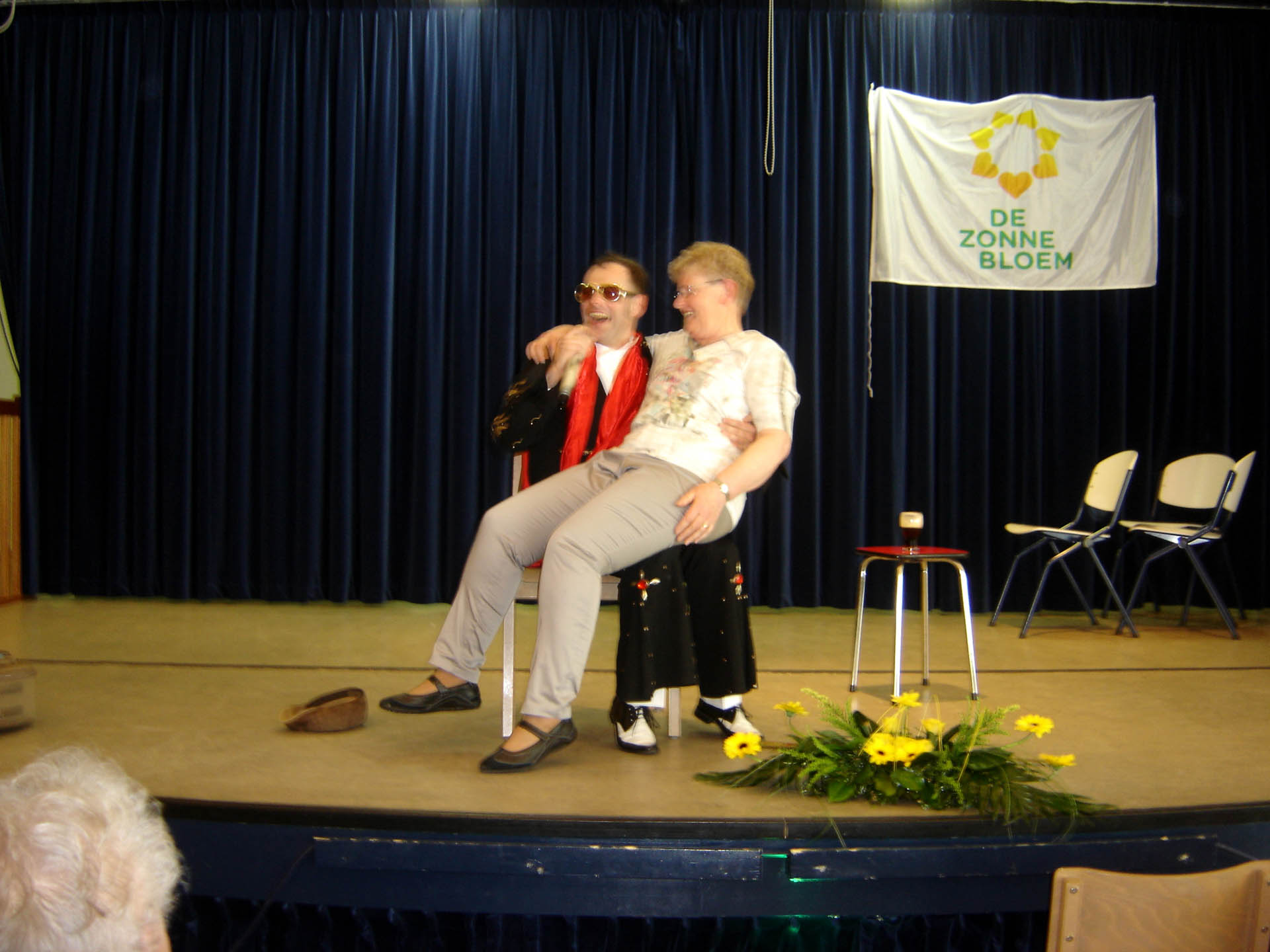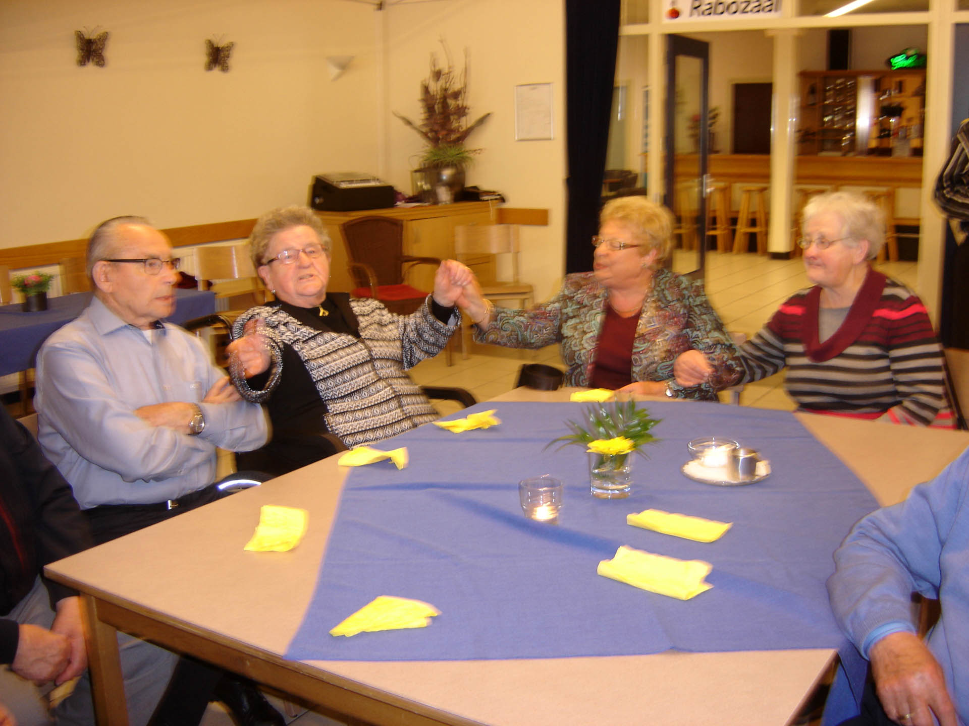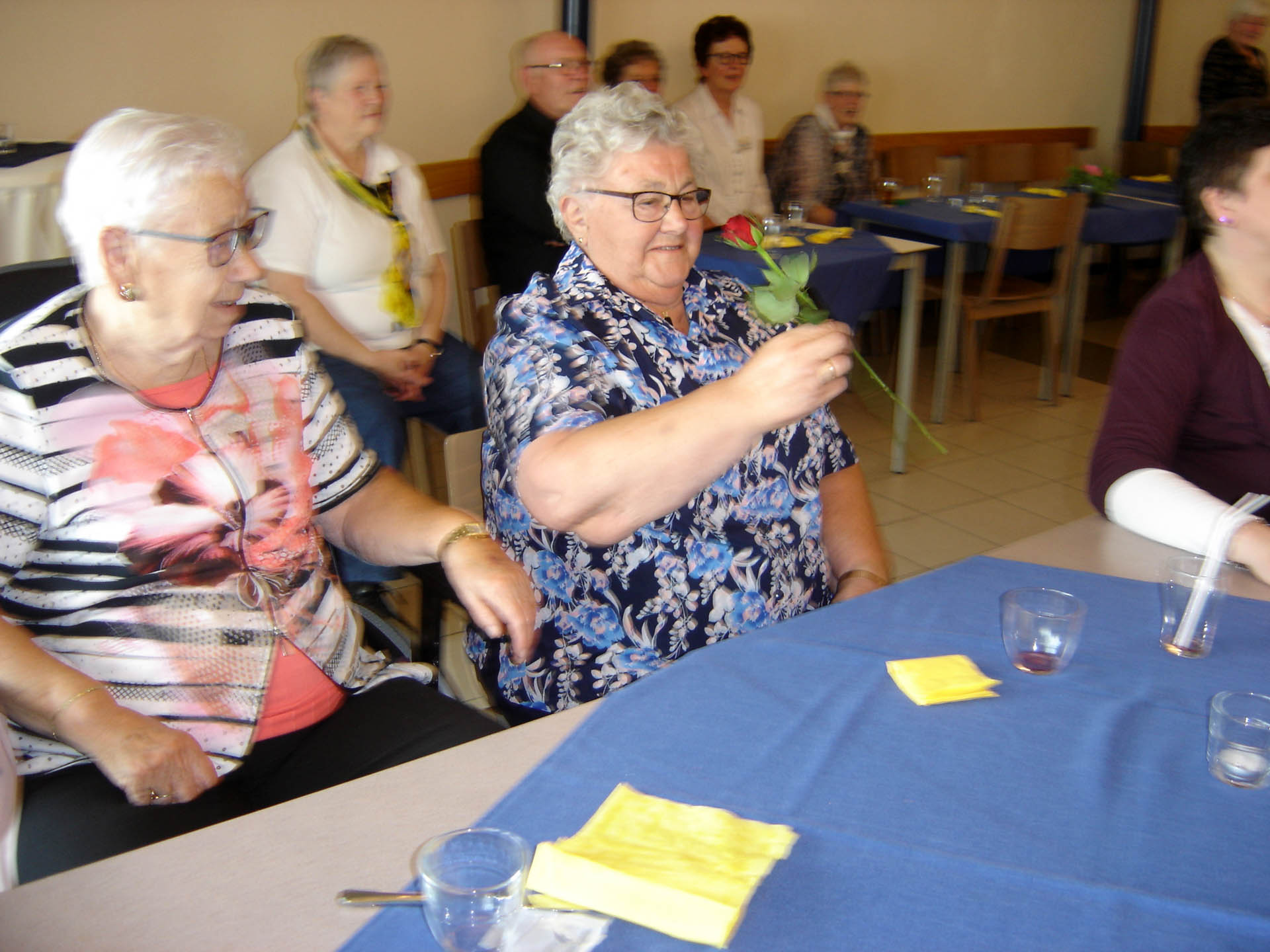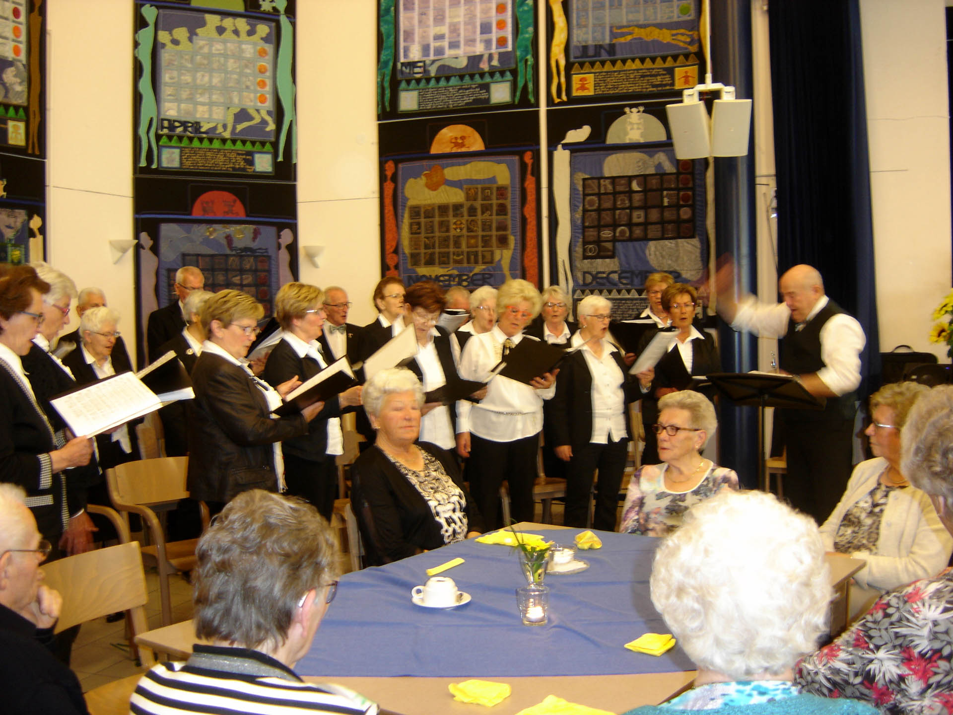 In de pauze met voor allen een glaasje vruchtensap kwam de ware muzikant naar boven. De muziek ging qua geluid een aantal octaven omhoog, alle vrijwilligers werden naar het podium geroepen en mochten hun kunnen tonen. Het was een samengesteld vrijwilligerskoor dat ondanks hun goede bedoelingen nog wat verdere oefening nodig hebben. Maar niet getreurd Michel maakte alles weer goed met zijn talenten. De gasten waren zeer te spreken over zijn muzikale kunsten en show acts. Hij wist zelfs mensen op de niet aanwezige dansvloer te krijgen. Een mevrouw van 89 jaar met vriend danste op de muziek van “Dit is de laatste dans”. Laat ons hopen dat ze nog vele danspassen mag zetten want dansen is haar passie. Ook een mevrouw die jarig was en 87 jaar was geworden werd in het zonnetje gezet. De hele zaal was gevuld met de klanken van “Lang zal ze leven”. Ook hier kan gezegd worden dat we hopen dat het bewaarheid wordt. Na een “zugabe” was rond de klok van vier uur het tijd voor koffie/thee met vlaai.