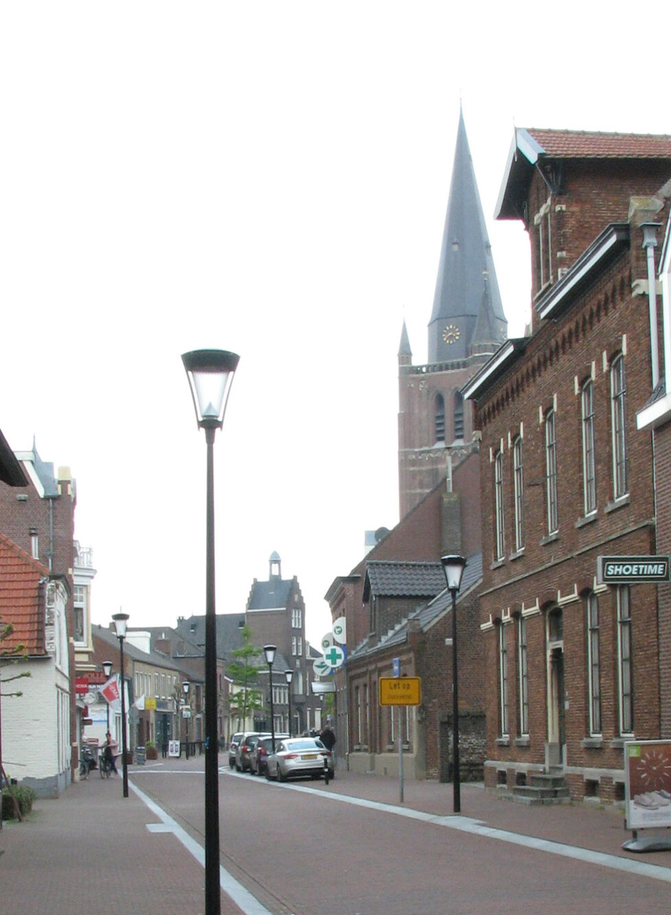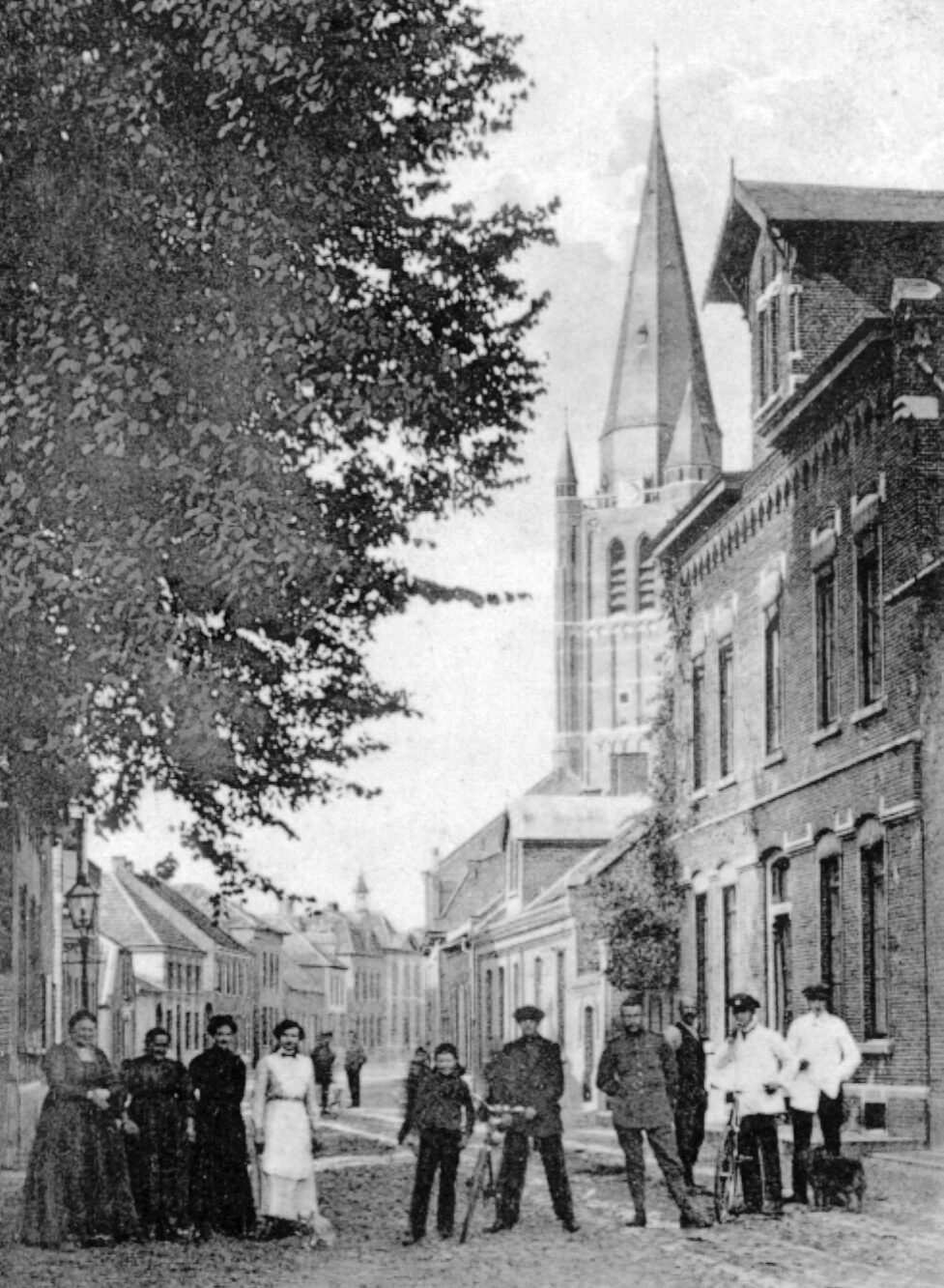 Ze zou wel eens precies een eeuw oud kunnen zijn, de foto van deze keer. Buiten onze landgrenzen woedde de Eerste Wereldoorlog (1914-1918) en Nederland was in staat van mobilisatie. Een militair kijkt zelfbewust in de camera van de fotograaf. De postbode leunt op zijn fiets. Poseren voor een foto was toen nog een langdurig klusje. Links staat een groepje dames in de schaduw van de mooie lindenboom die stond op de plaats waar later het woonhuis van Wim en Philoméne Bongers werd gebouwd. Let ook op de petroleumlamp van de openbare straatverlichting. In de verte zien we nog het oude raadhuis met de classicistische gevel, dat in 1921 werd vervangen door nieuwbouw met een ranke toren