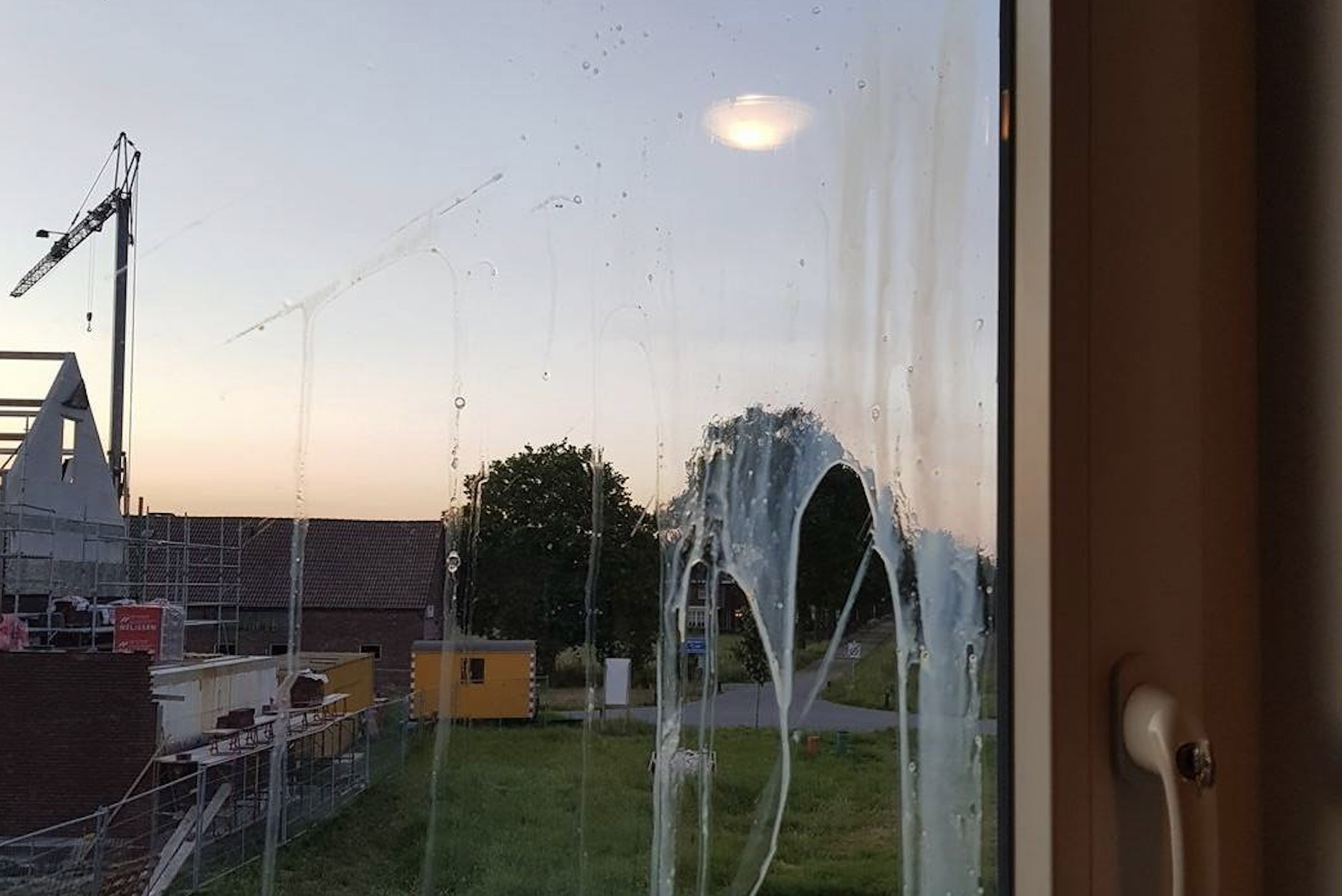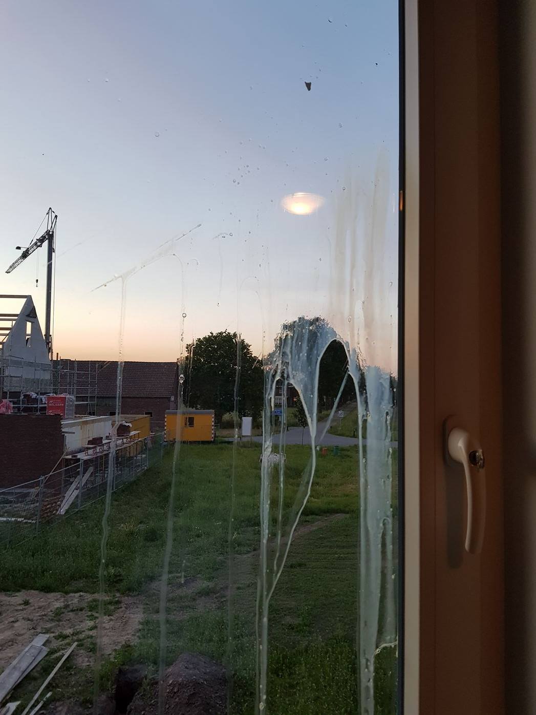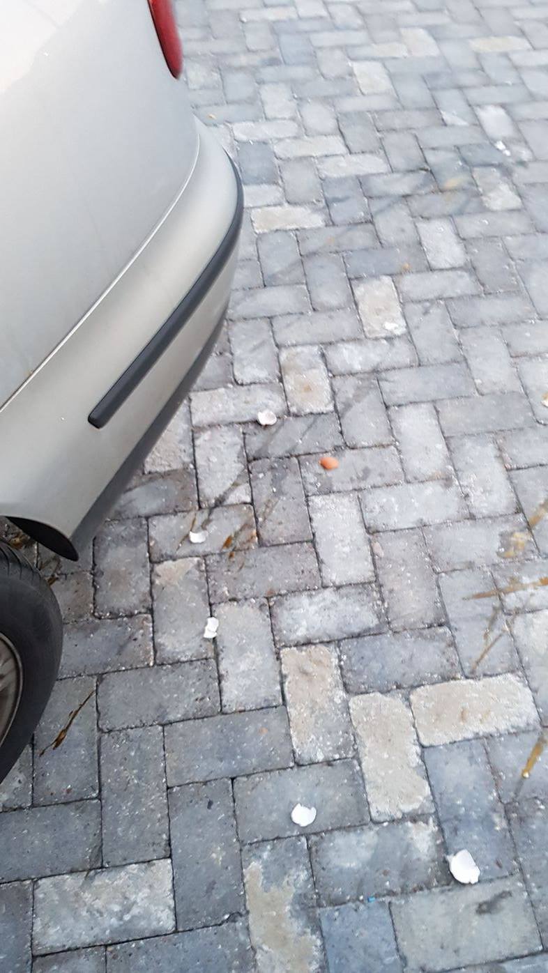 De bewoner was in de woonkamer TV aan het kijken toen hij iets hoorde. Hij reageerde er niet direct op maar toen hij even later naar boven ging zag hij de eierprut tegen het raam aan zitten. Toen hij buiten ging kijken, zag hij dat het niet alleen bij dat raam was gebleven. Meerdere ramen, de muren en de auto zaten onder.