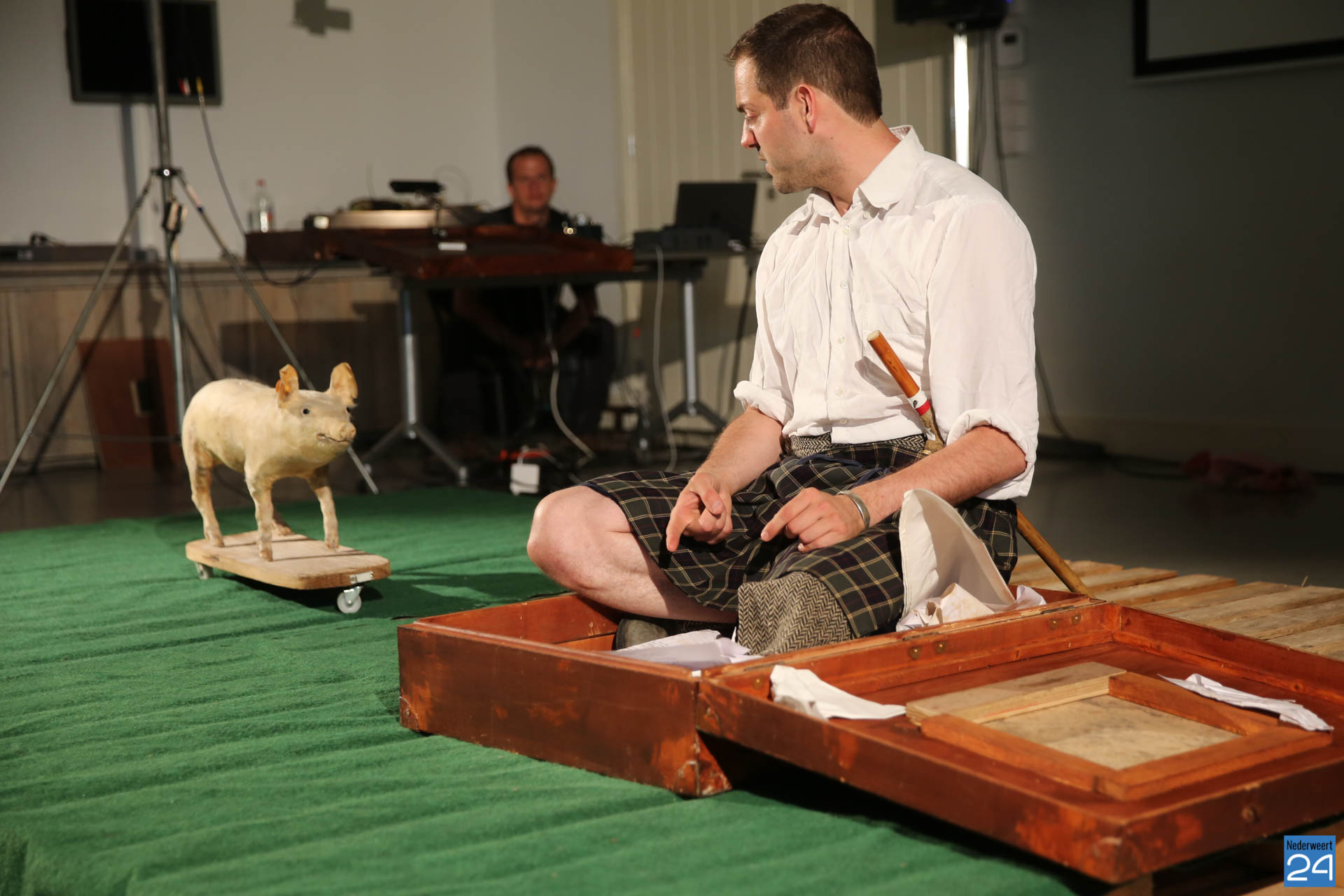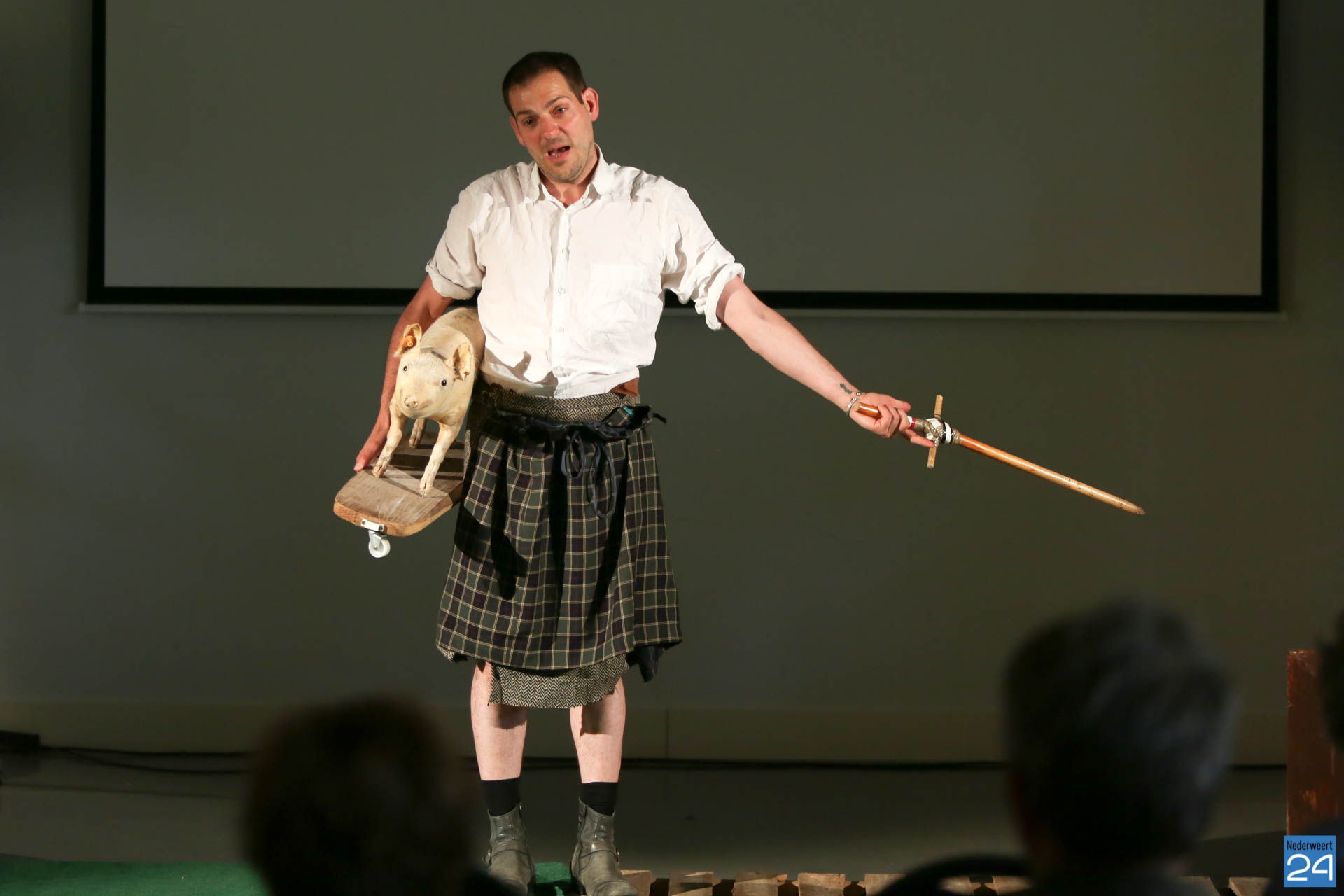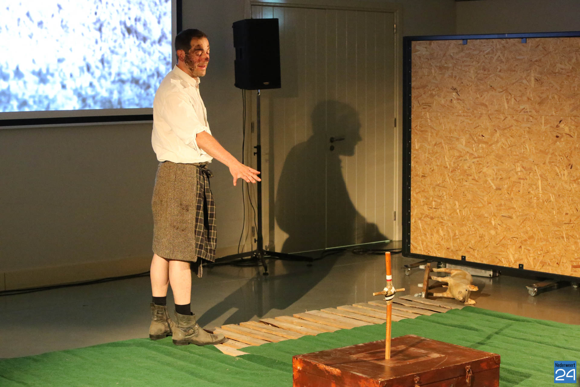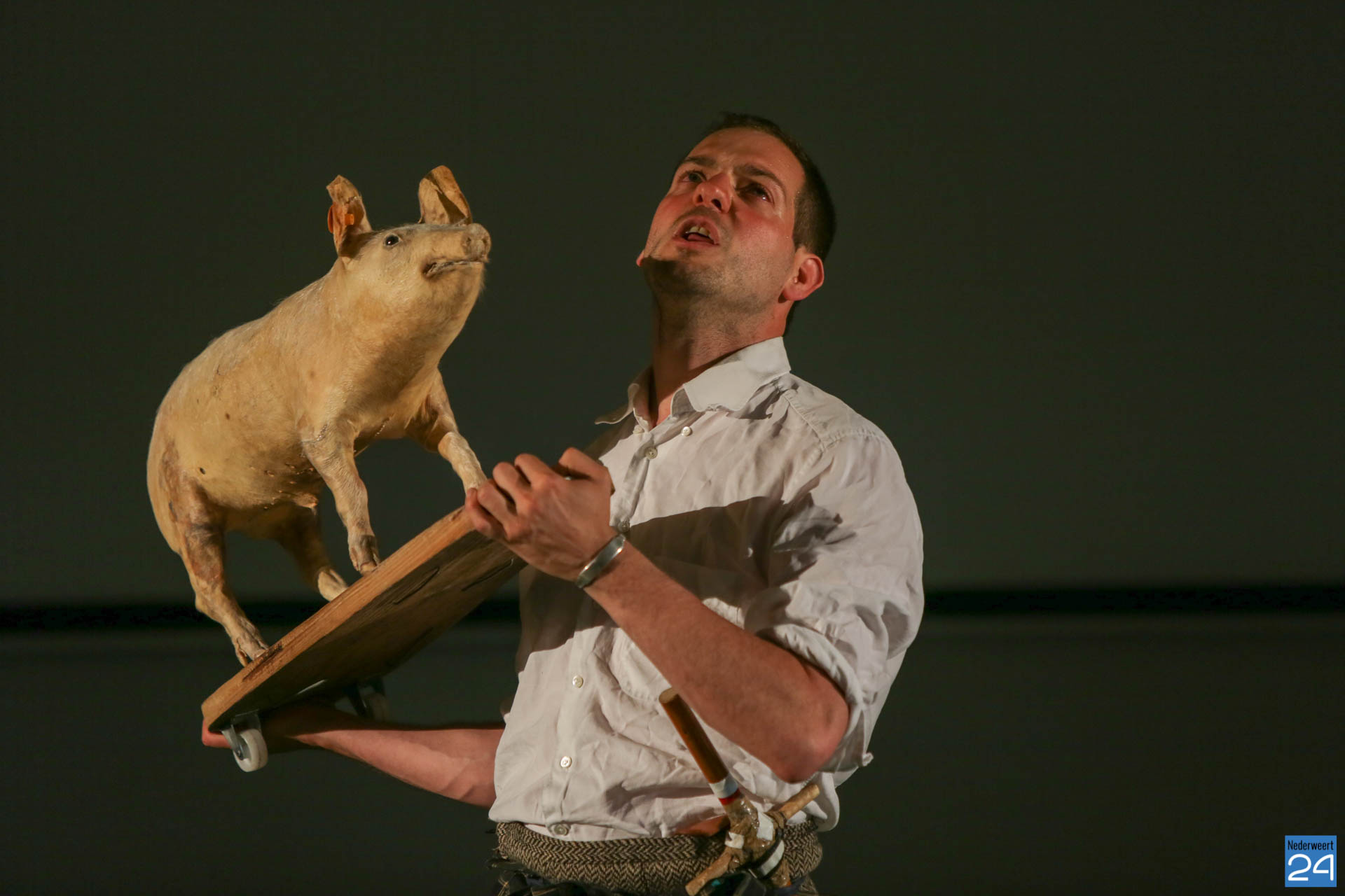Vrijdagavond waren Lucas De Man en Johan Dehollander bij ons boerenerf om het theaterstuk  ‘Wij Varkenland‘ te spelen. Een solo over Stijn, een jongen van 30 jaar die na 12 jaar rondtrekken in de wereld terugkeert naar zijn geboorte streek. Zijn ouders waren varkensboeren, zijn broer heeft de boerderij overgenomen, hij zelf wou ridder zijn.