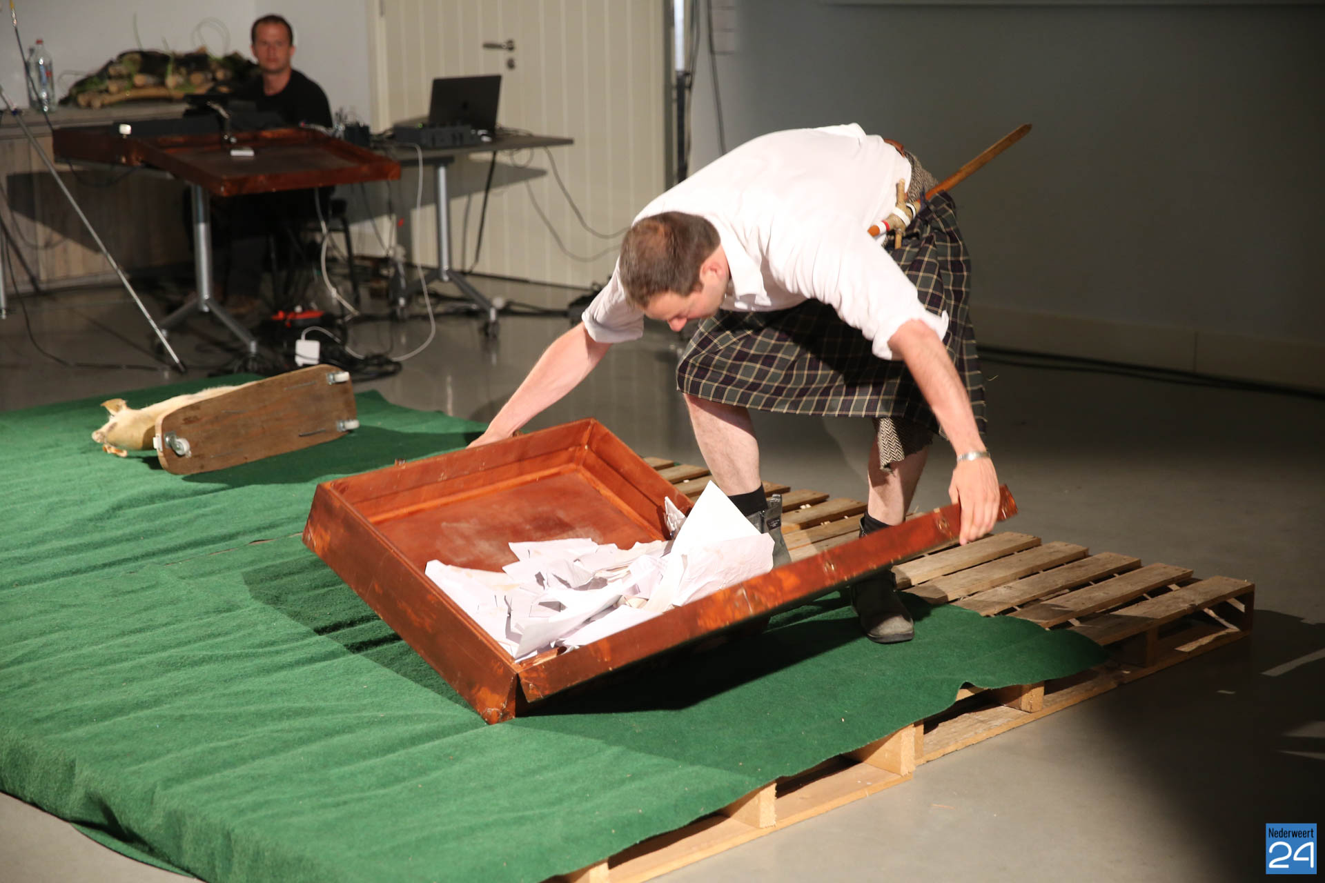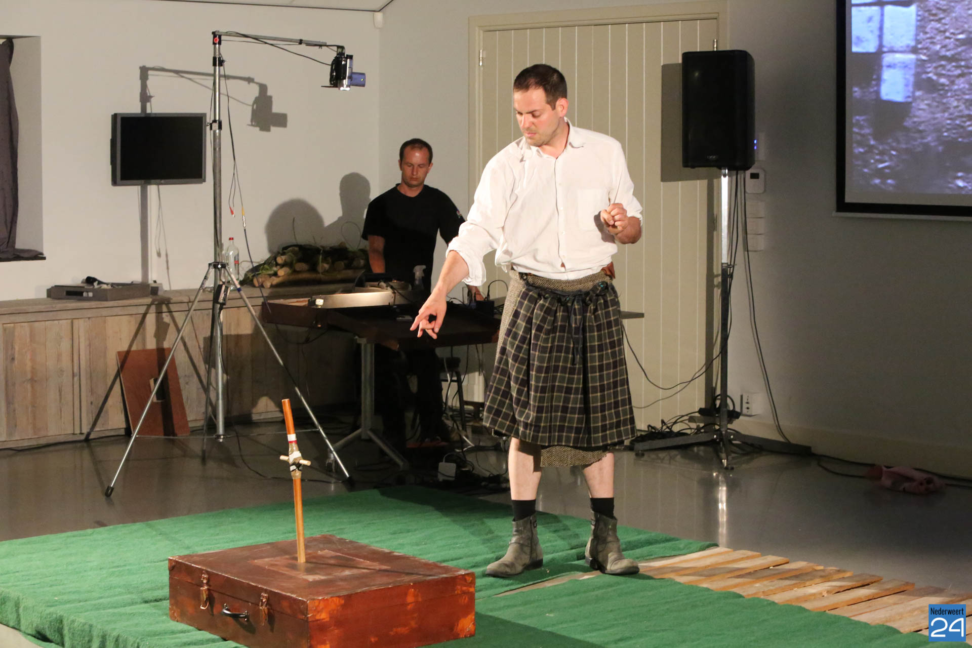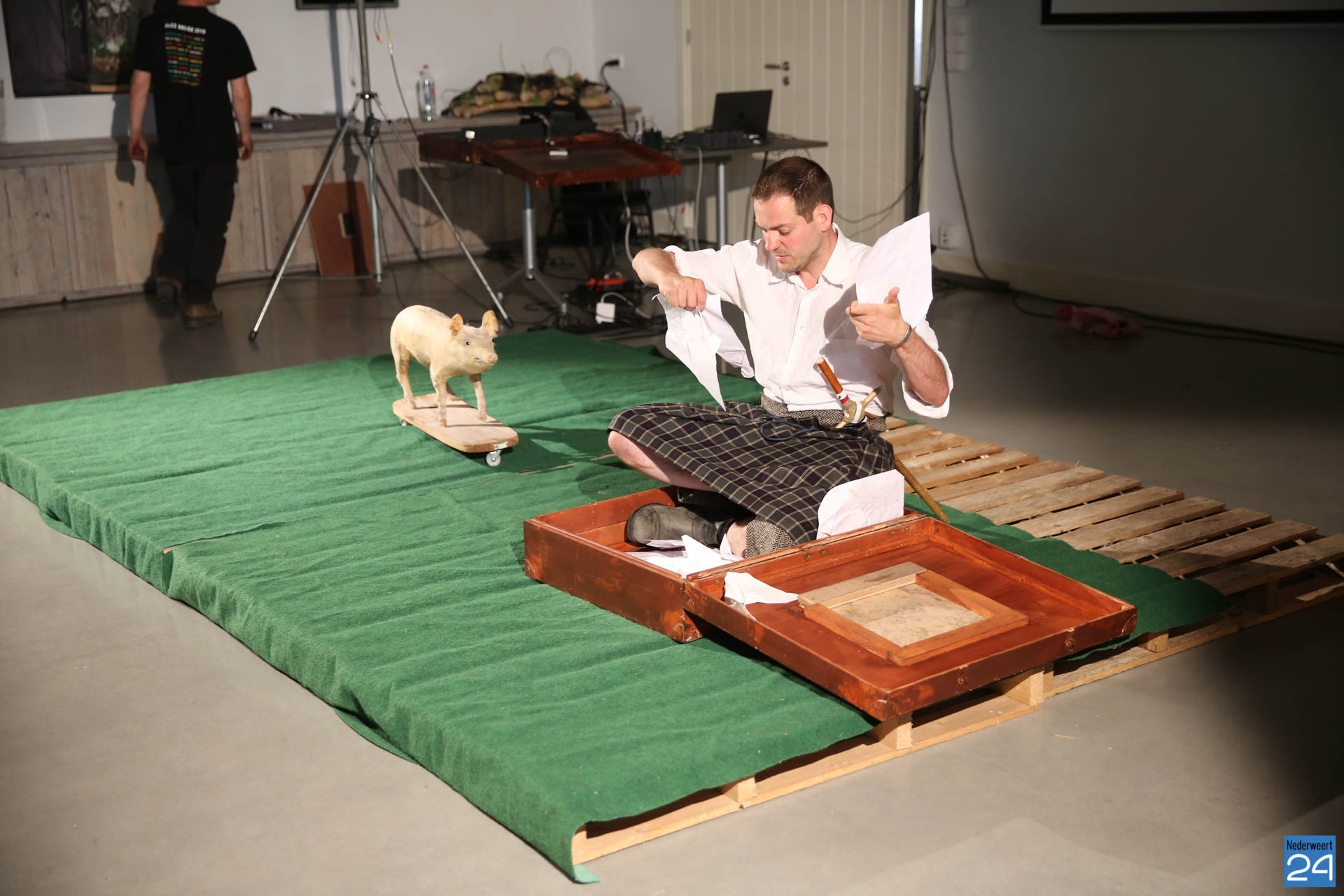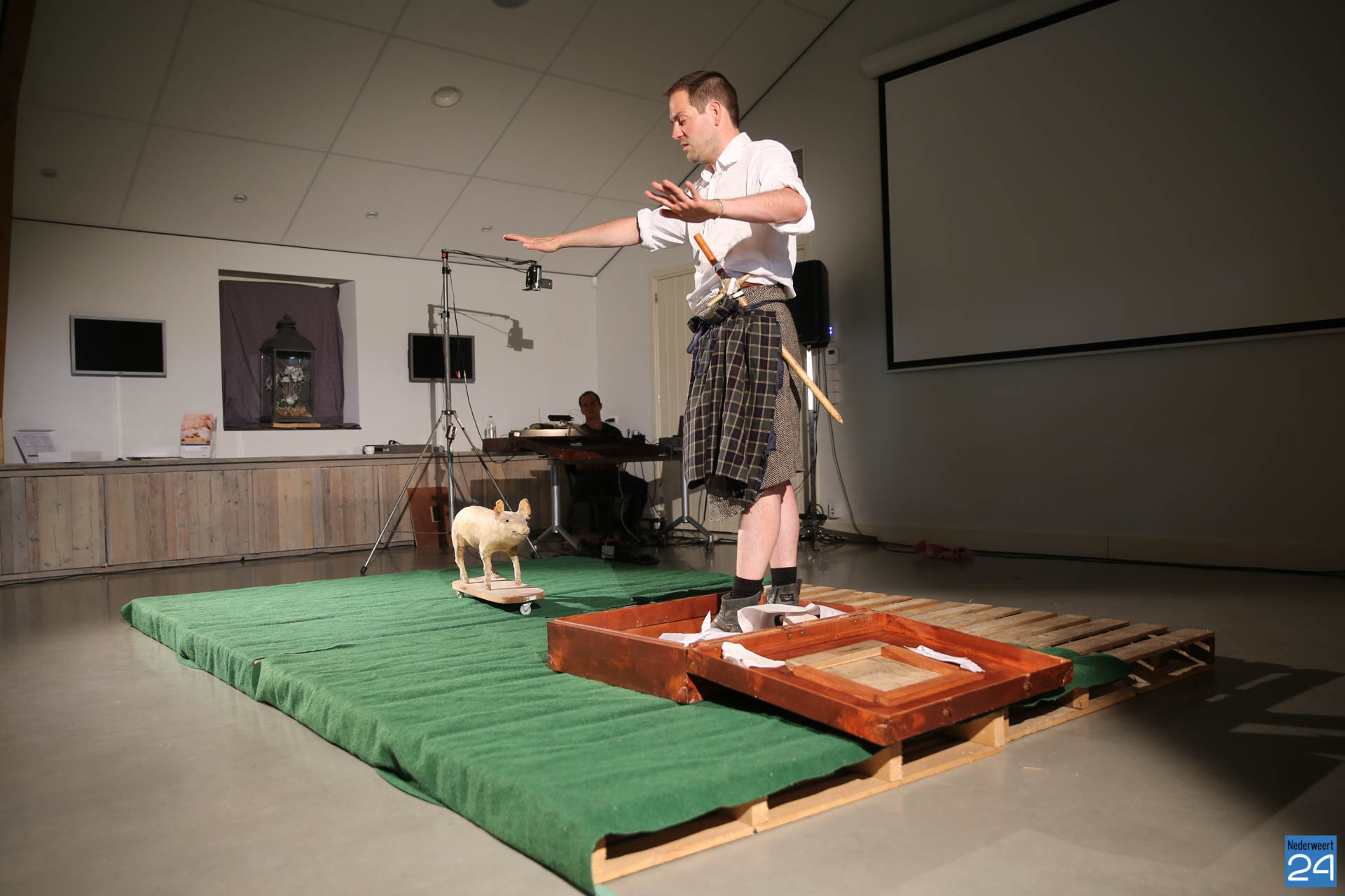 Vrijdagavond waren Lucas De Man en Johan Dehollander bij ons boerenerf om het theaterstuk  ‘Wij Varkenland‘ te spelen. Een solo over Stijn, een jongen van 30 jaar die na 12 jaar rondtrekken in de wereld terugkeert naar zijn geboorte streek. Zijn ouders waren varkensboeren, zijn broer heeft de boerderij overgenomen, hij zelf wou ridder zijn.