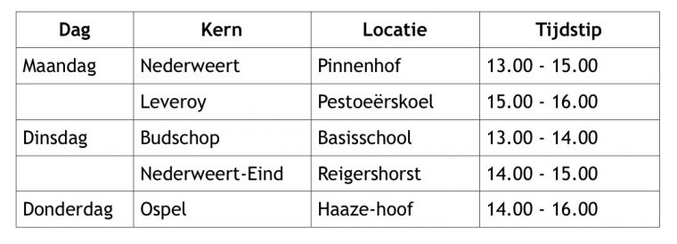 Het Ospels Steunpunt houdt elke donderdag van 14.00 tot 16.00 uur spreekuur in gemeenschapshuis Haaze-Hoof, Aerthijsplein 3 in Ospel. Een afspraak maken is niet nodig, iedereen kan zo binnenlopen. Er kan ook contact opgenomen worden via email: ospelssteunpunt@gmail.com.